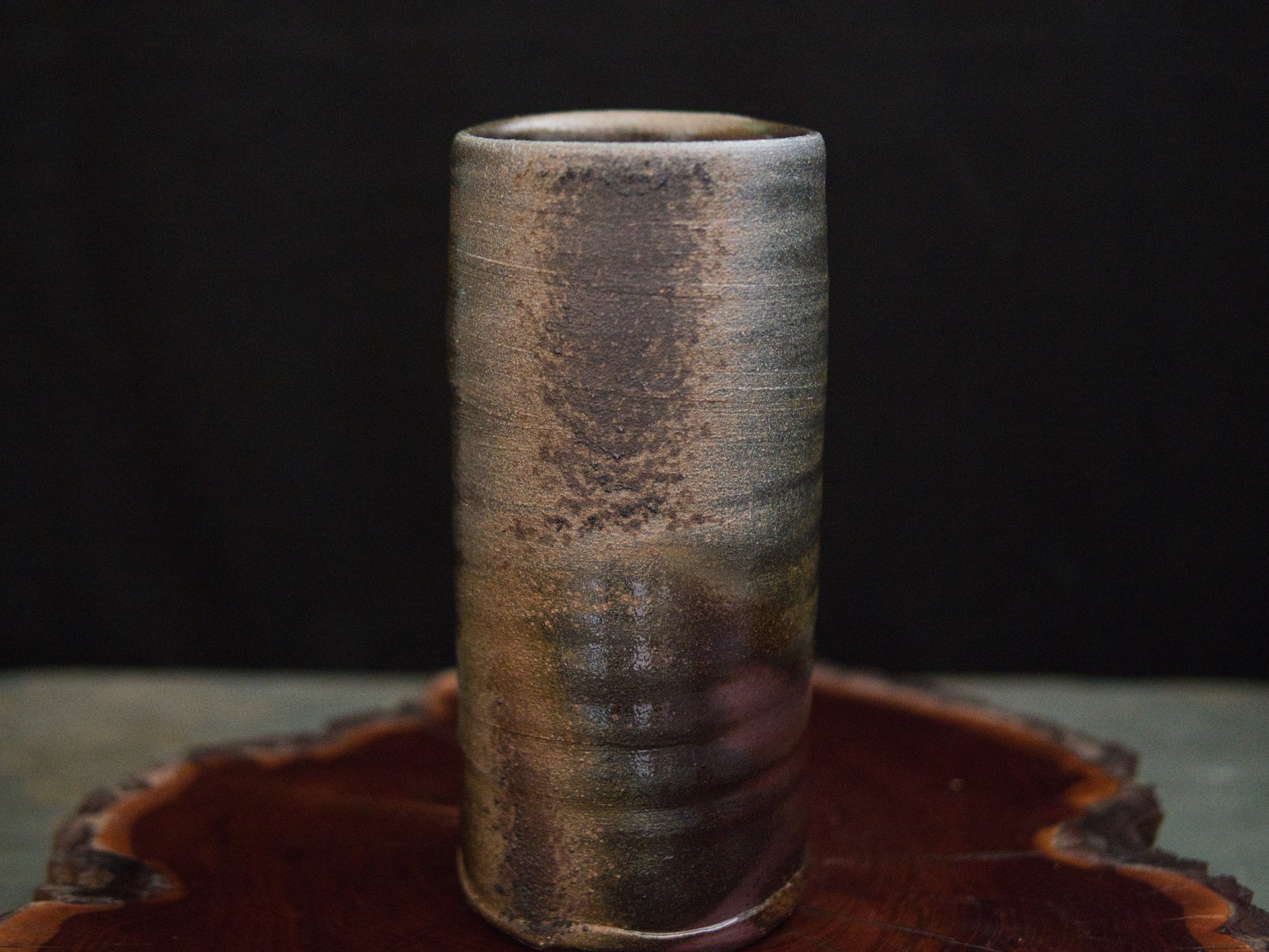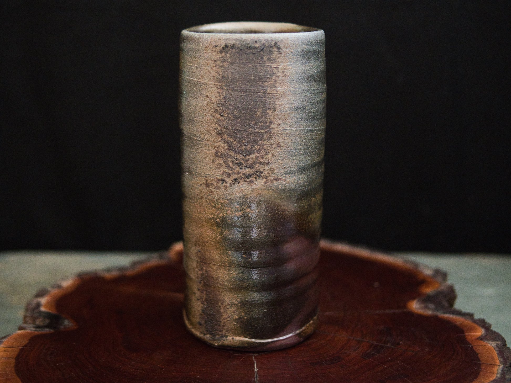 Auf der Oberfläche wechseln erdige Braun- und Grautöne mit dunkleren Brandspuren, feinen Ascheablagerungen und subtilen Schattierungen. Diese natürlichen Effekte erzählen vom Verlauf des Feuers im Ofen und machen jede Seite der Vase einzigartig.