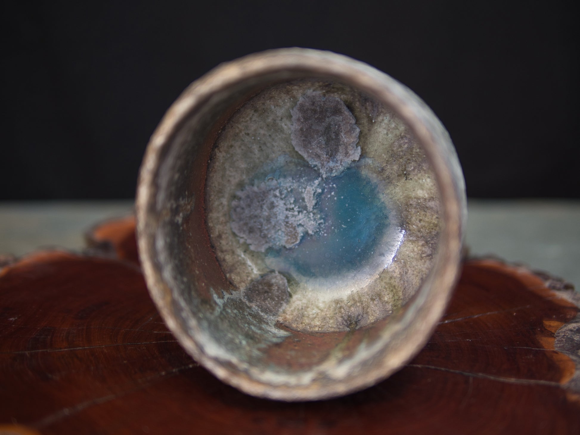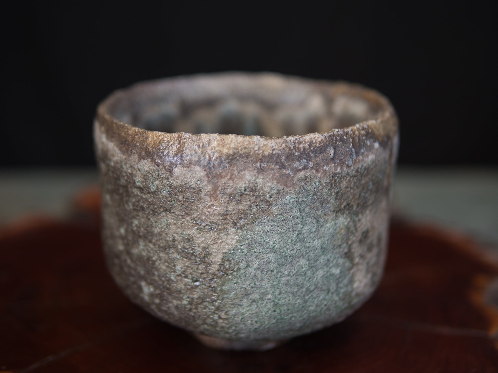 Gefertigt wurde die Chawan im Freihandaufbau, ähnlich wie Raku. Dadurch bekam die Chawan ihre weichen, unebenen Rundungen, wodurch sie sich gut in die Hände fügt. Der Brand und die im Ofen zirkulierende Asche haben eine einzigartige "Landschaft" sowohl innen als auch außen auf der Chawan hinterlassen, daher lohnt es sich, sie aus verschiedenen Perspektiven zu betrachten. Die Schale wurde in der han-tsutsu-Form getöpfert und ist daher etwas niedriger, fügt sich aber sehr gut in die Hände. Dieses Stück wurde von Frau Sanae Kondô gefertigt und wird mit einer handsignierten Holzbox (tomobako) geliefert.