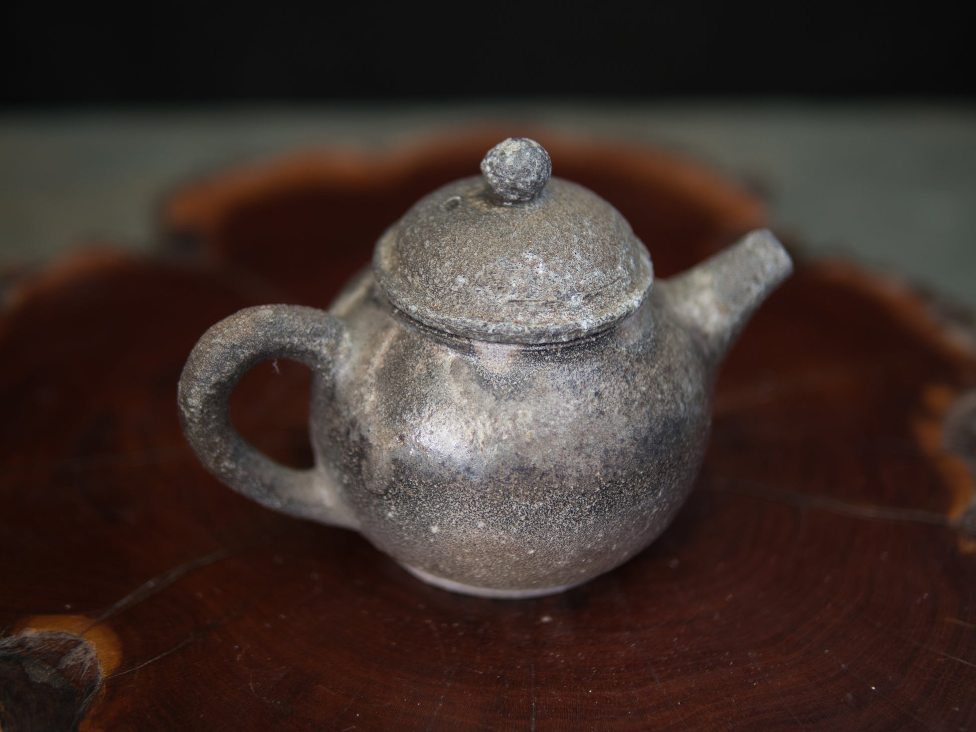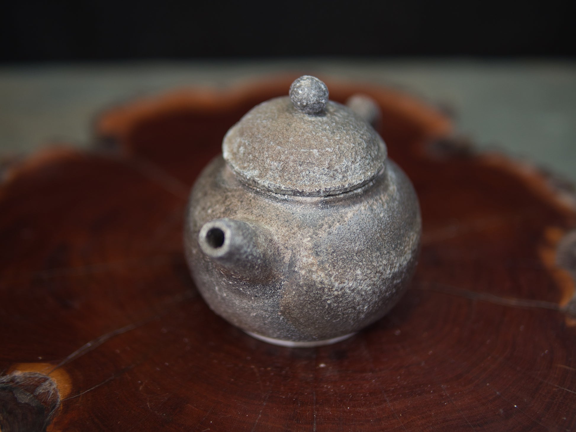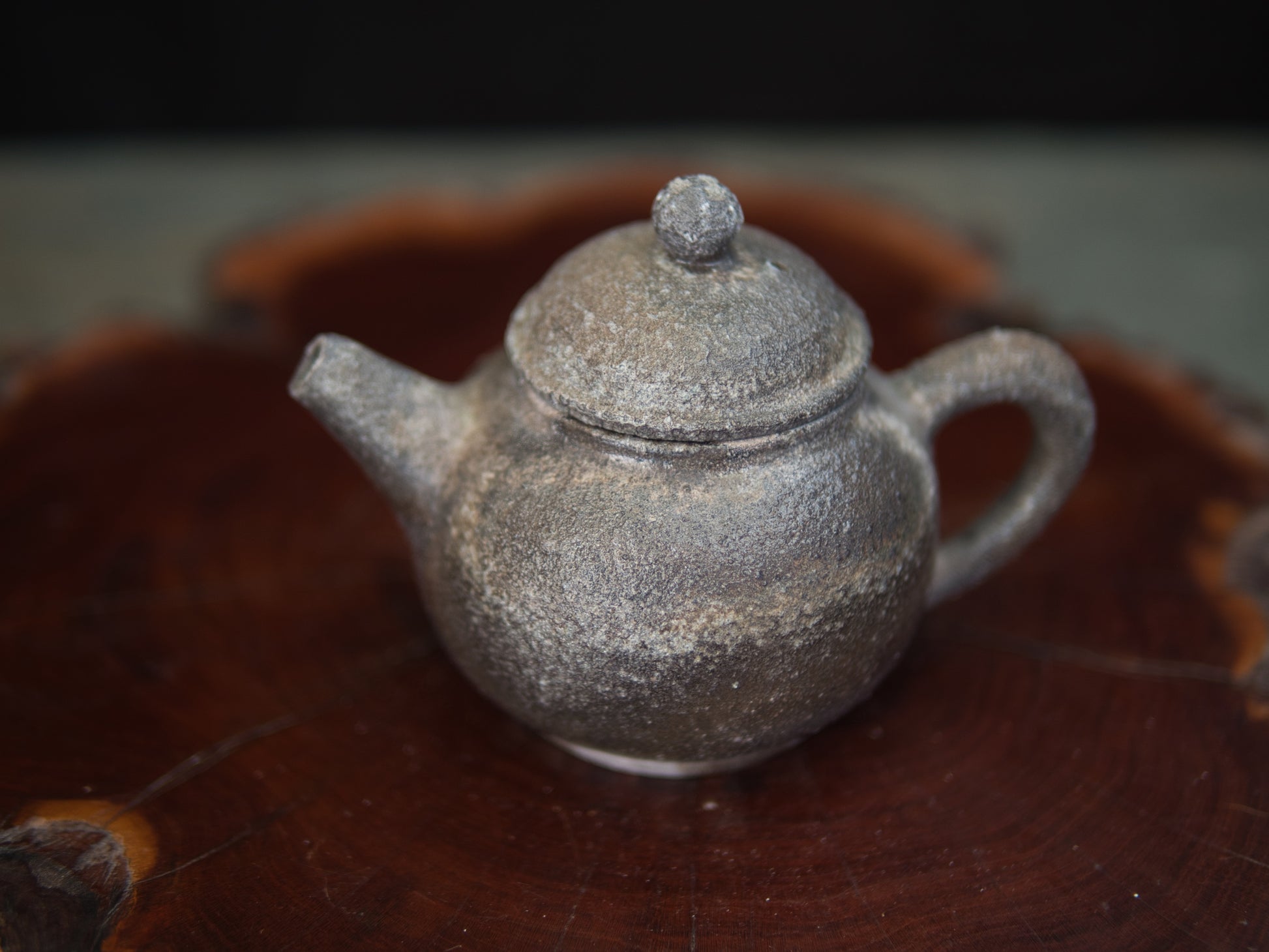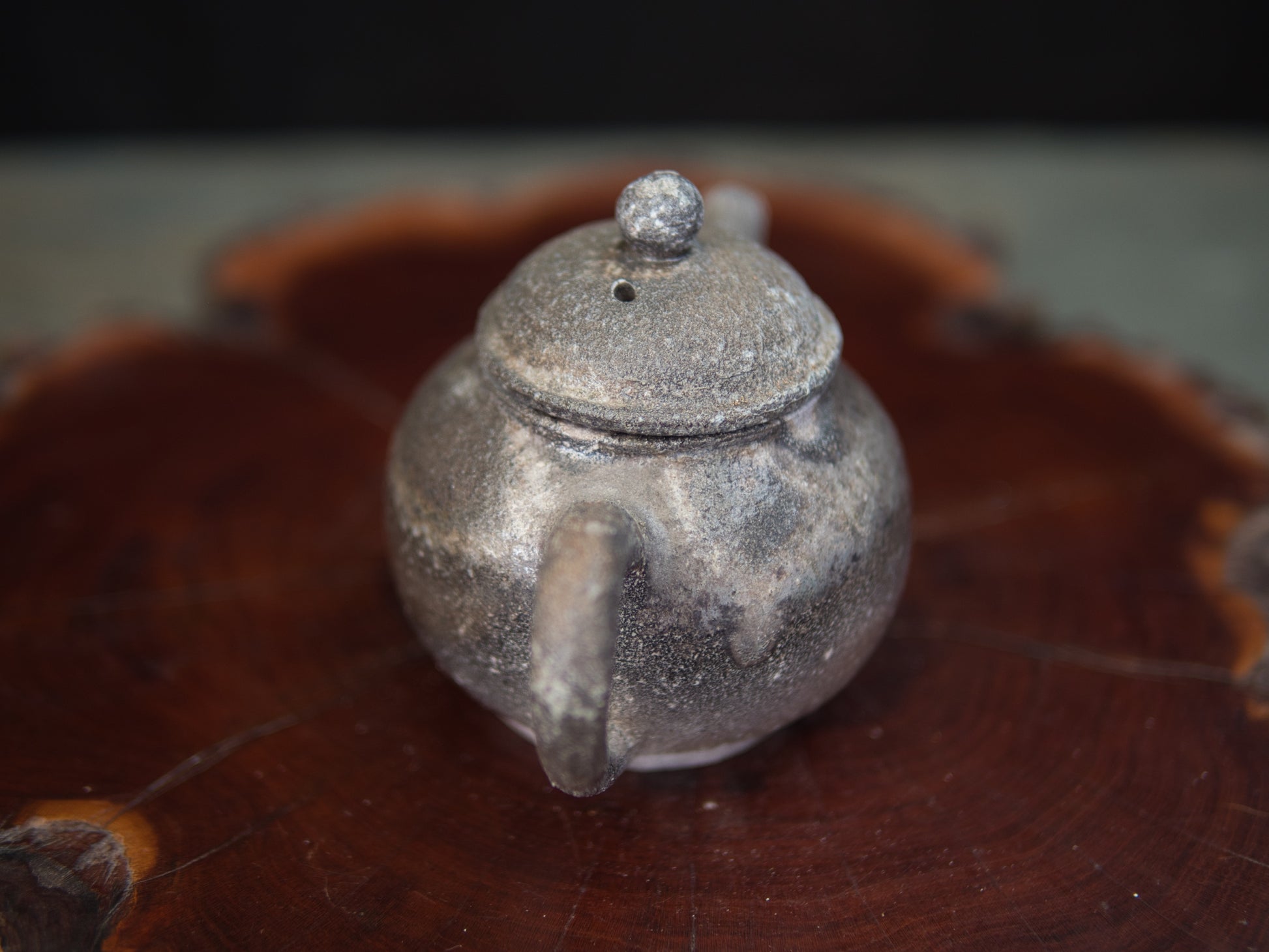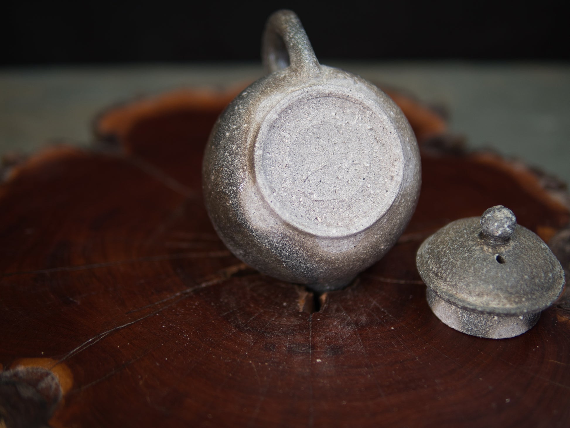 Diese Kanne nennt sich aufgrund des Griffs gegenüber der Tülle ushirode kyûsu (後ろ手急須). Mit 120 ml ist sie gut für Mehrfachaufgüsse einsetzbar. Aufgrund der kugeligen Form kann man auch voluminösere Teesorten wie kugelige Oolong darin brühen. Die Ascheanflugglasur fällt je nach Objekt und Platzierung einzigartig aus und macht aus jedem Stück ein Unikat.