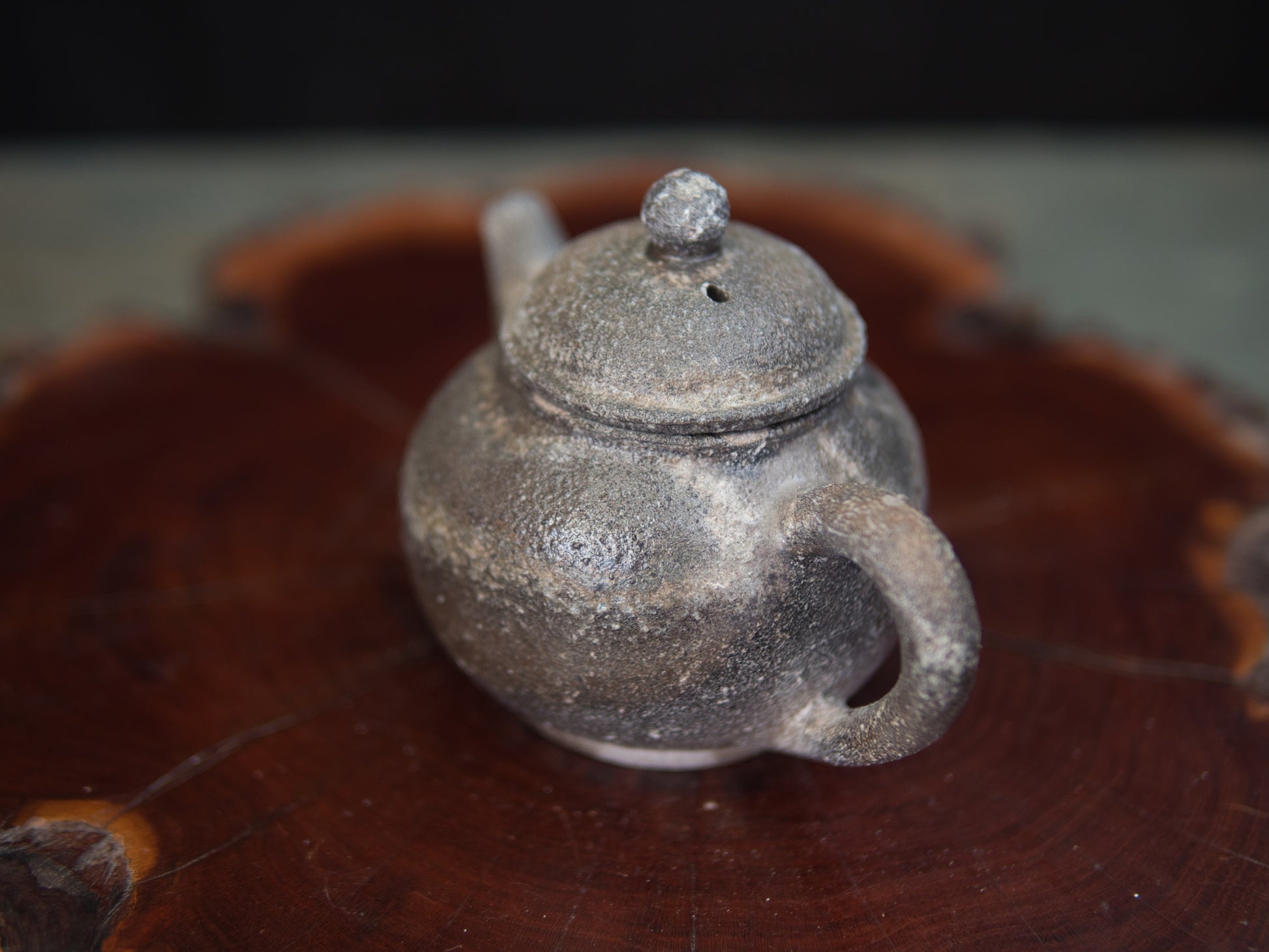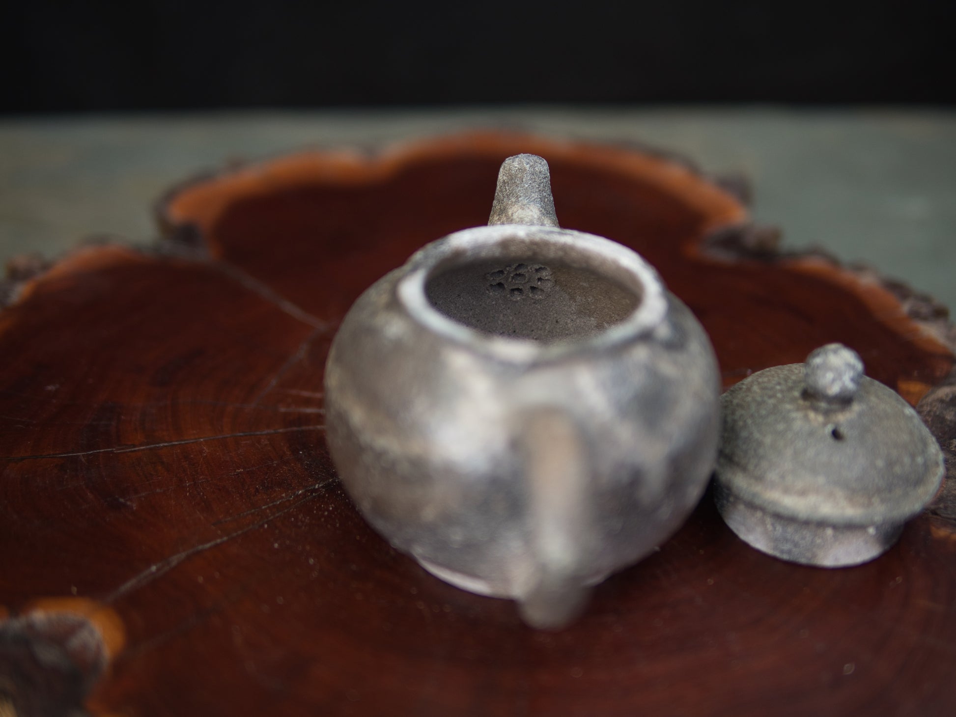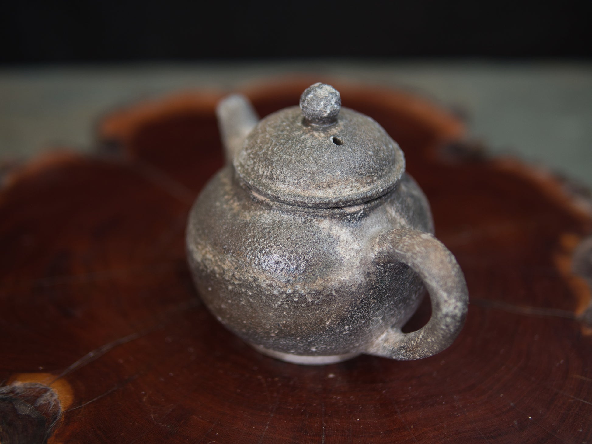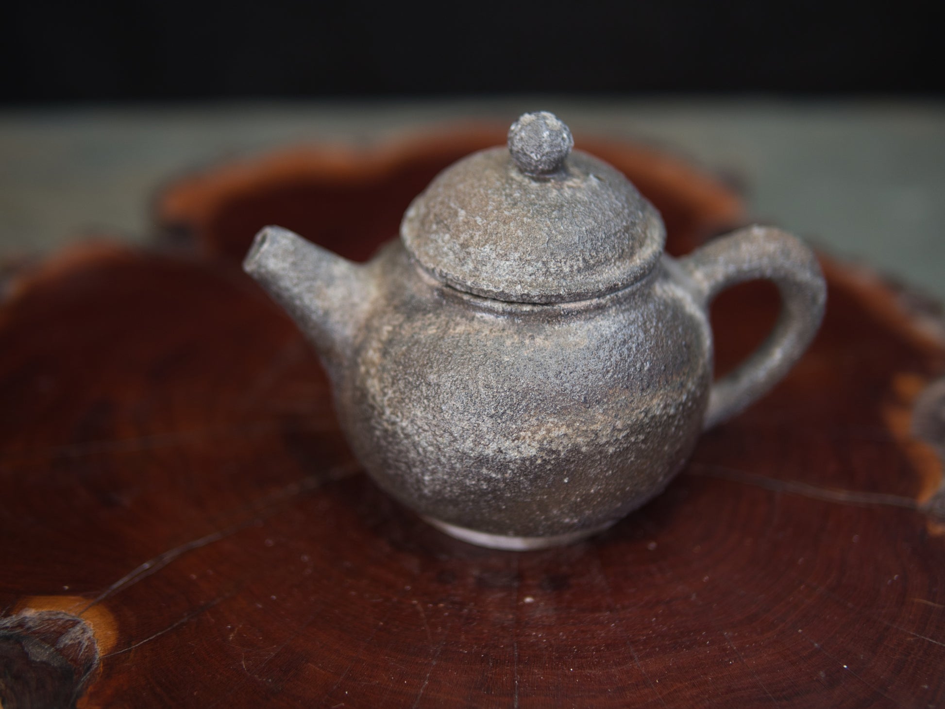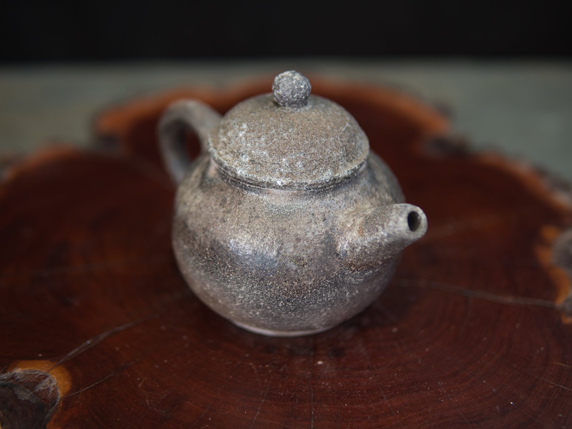 Diese Kanne nennt sich aufgrund des Griffs gegenüber der Tülle ushirode kyûsu (後ろ手急須). Mit 120 ml ist sie gut für Mehrfachaufgüsse einsetzbar. Aufgrund der kugeligen Form kann man auch voluminösere Teesorten wie kugelige Oolong darin brühen. Die Ascheanflugglasur fällt je nach Objekt und Platzierung einzigartig aus und macht aus jedem Stück ein Unikat.