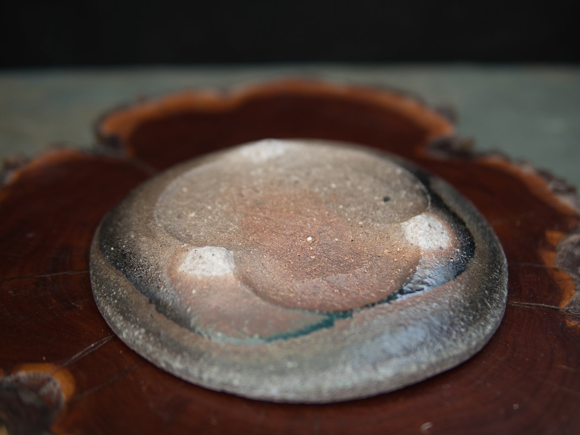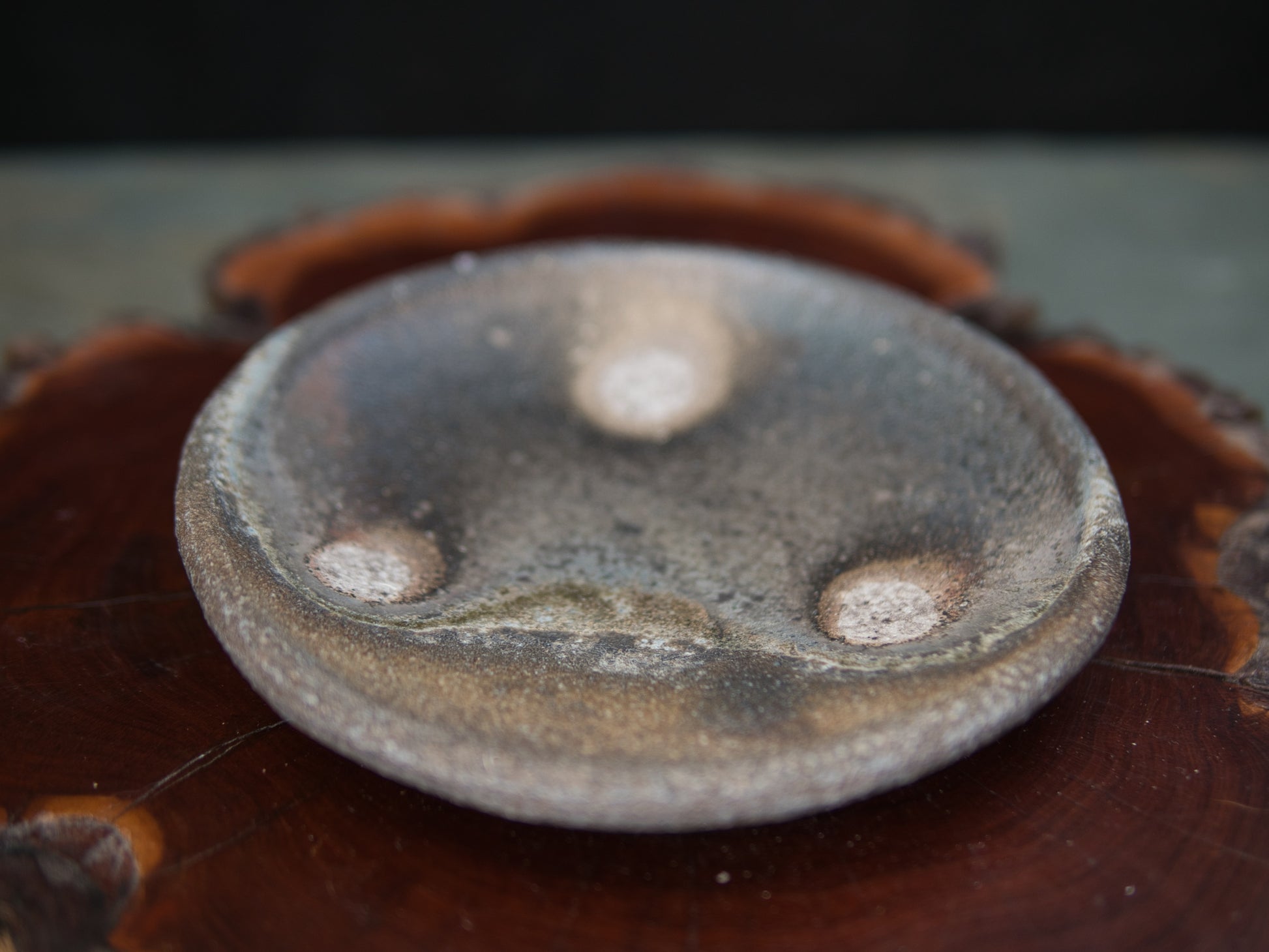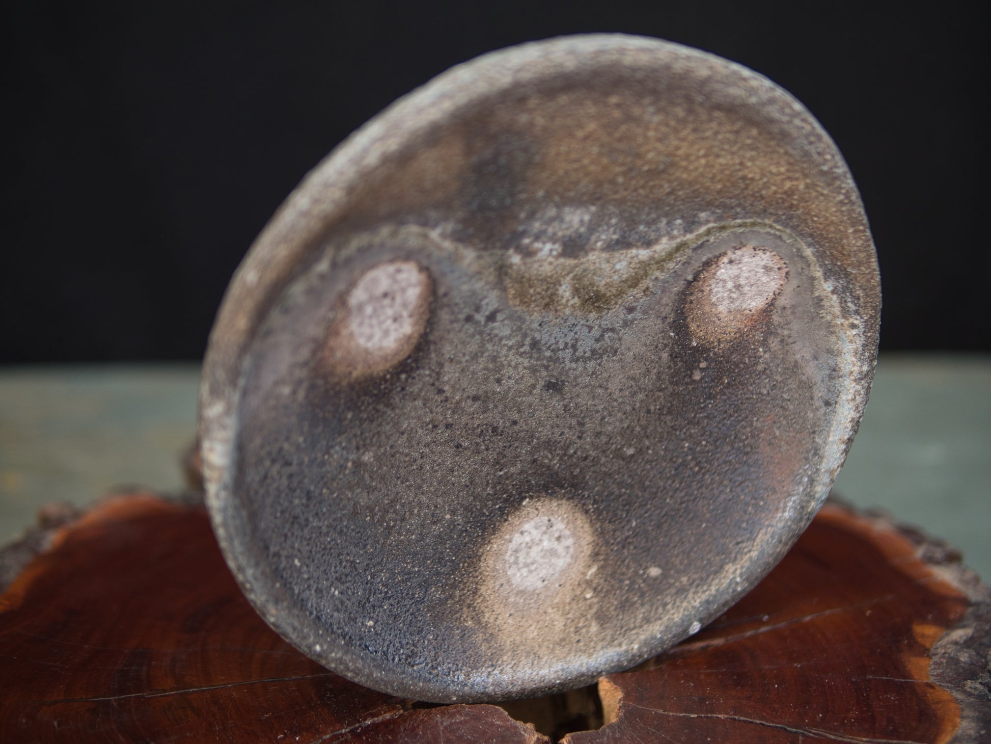 Dieser Teller stammt aus dem Ofen Hôgetsu und wurde vom Ehepaar Kondô im Freihandaufbau gefertigt. Wenn die Teller im Ofen übereinander gestapelt werden, entstehen an den Stellen, auf denen die Stützkegel aufliegen, kreisförmige Flächen, die sich optisch vom Ascheanflug abheben. Der oberste Teller eines Stapels hat entsprechend keine solchen Flächen.