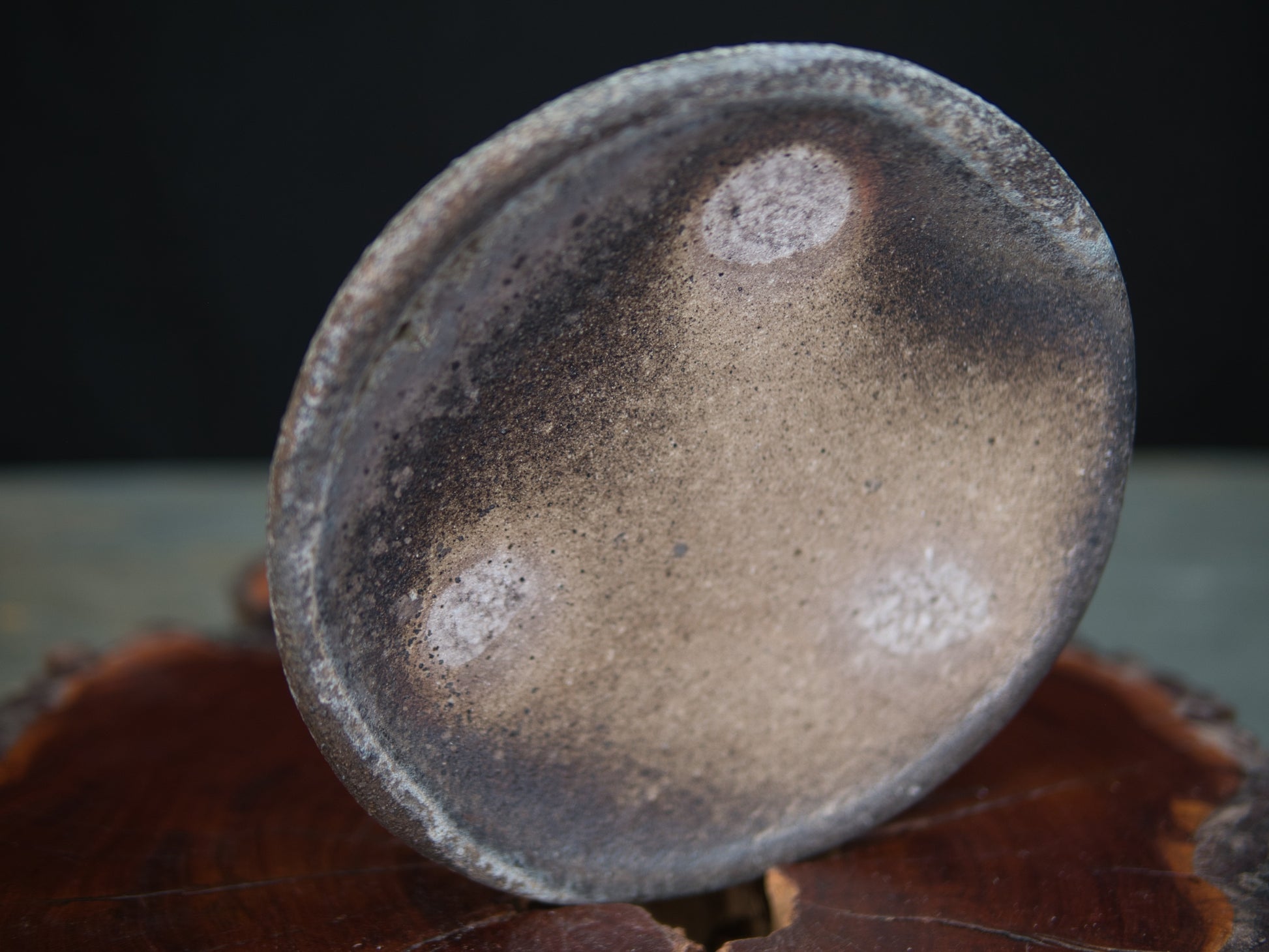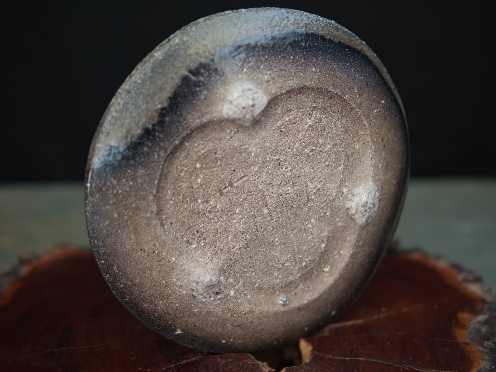 Dieser Teller stammt aus dem Ofen Hôgetsu und wurde vom Ehepaar Kondô im Freihandaufbau gefertigt. Wenn die Teller im Ofen übereinander gestapelt werden, entstehen an den Stellen, auf denen die Stützkegel aufliegen, kreisförmige Flächen, die sich optisch vom Ascheanflug abheben. Der oberste Teller eines Stapels hat entsprechend keine solchen Flächen.