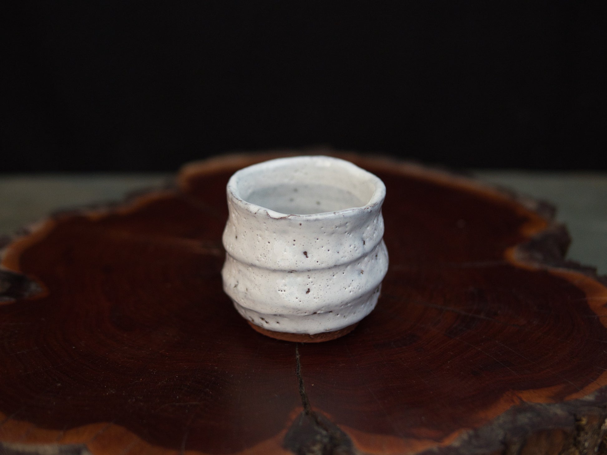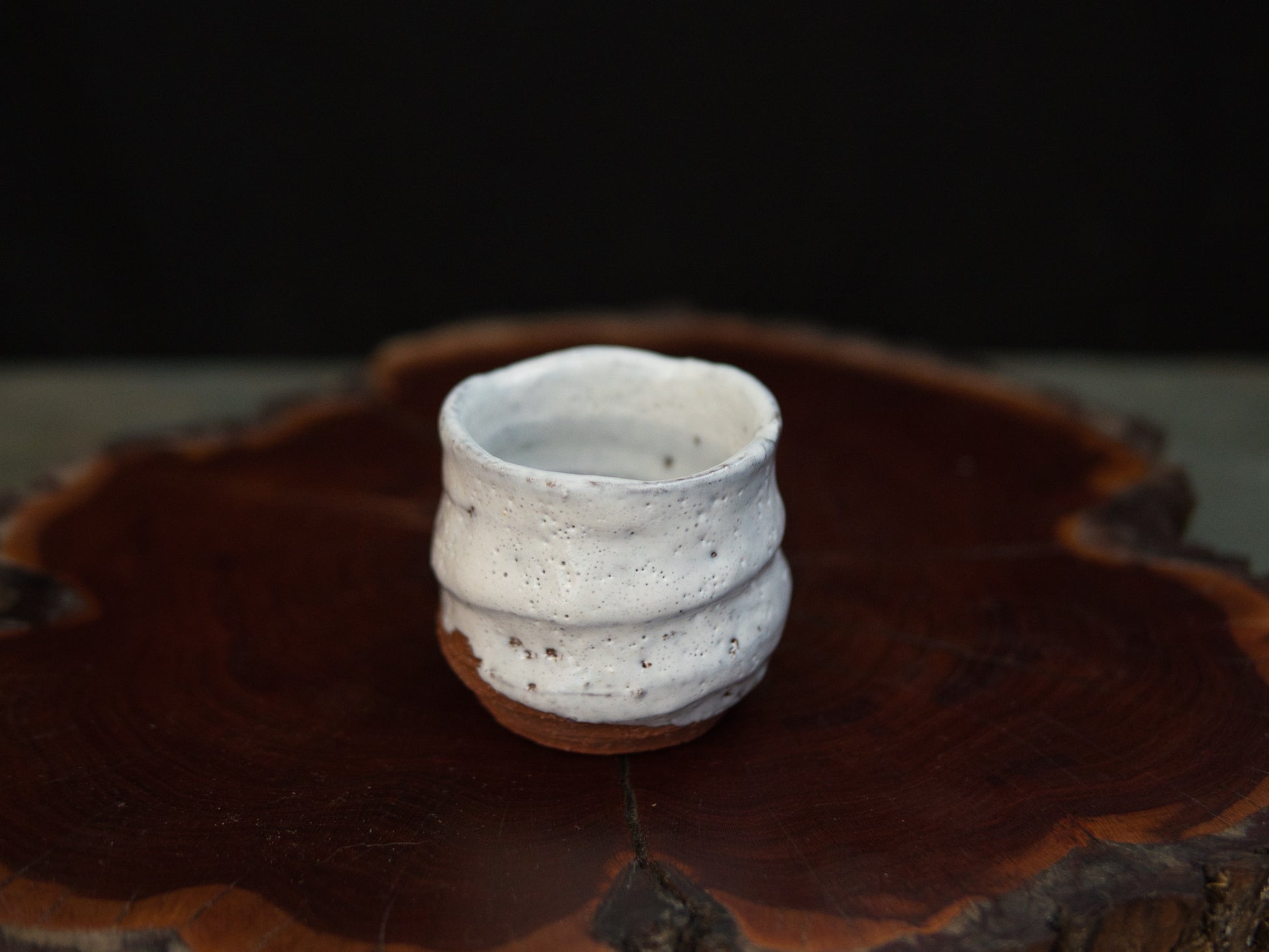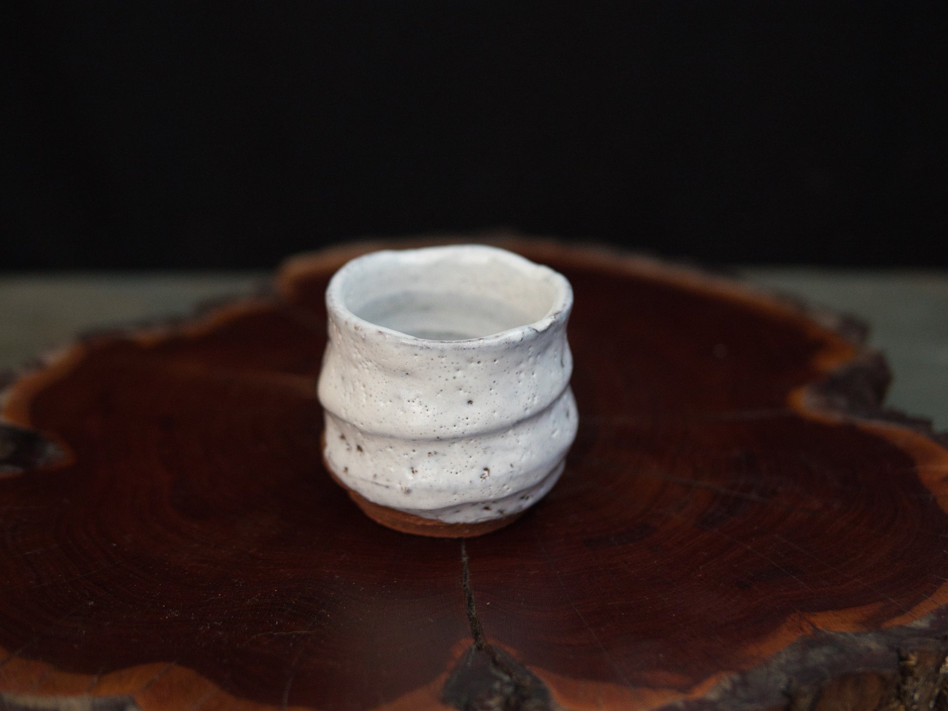 Die milchig-weiße Hagi-Glasur ist fein gesprenkelt und ungleichmäßig aufgetragen, mit sichtbaren Einschlüssen und leichten Variationen in Dichte und Oberfläche. Horizontale Rillen strukturieren den Korpus und betonen die handwerkliche Herstellung. Der Fuß aus eisenhaltigem Ton ist roh belassen und zeigt eine warme, rötlich-braune Farbgebung, wie sie für Hagi-Ton typisch ist.