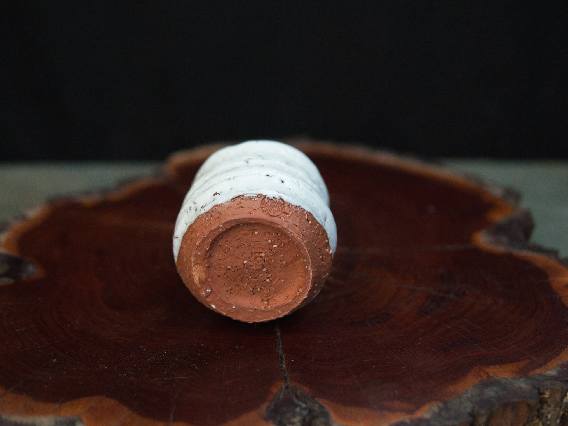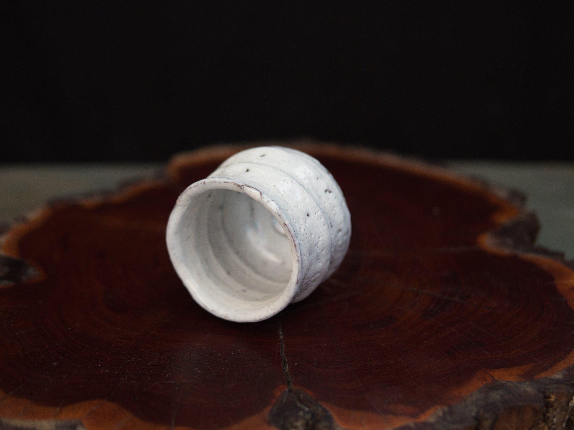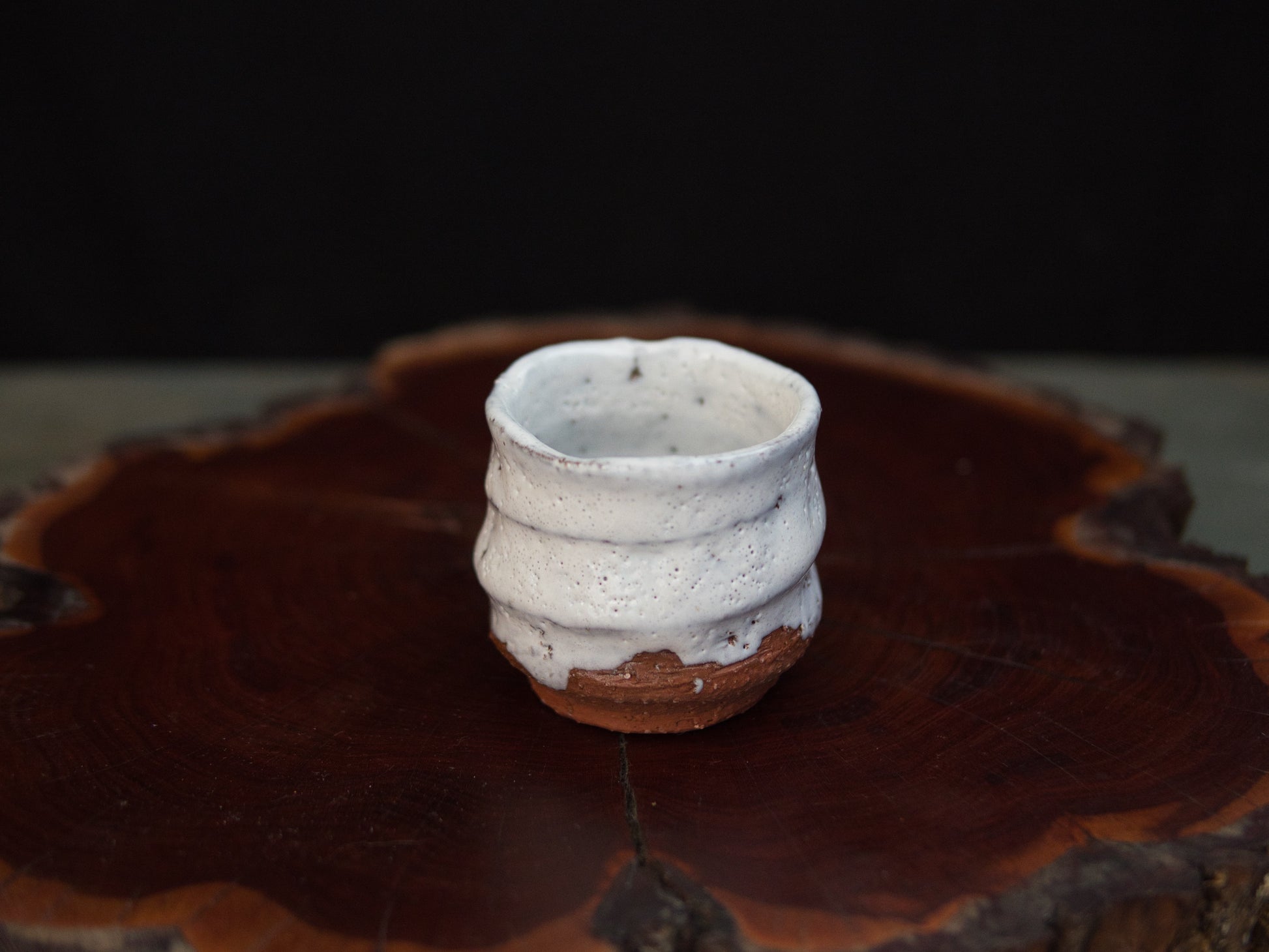 Die milchig-weiße Hagi-Glasur ist fein gesprenkelt und ungleichmäßig aufgetragen, mit sichtbaren Einschlüssen und leichten Variationen in Dichte und Oberfläche. Horizontale Rillen strukturieren den Korpus und betonen die handwerkliche Herstellung. Der Fuß aus eisenhaltigem Ton ist roh belassen und zeigt eine warme, rötlich-braune Farbgebung, wie sie für Hagi-Ton typisch ist.