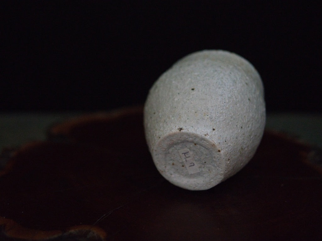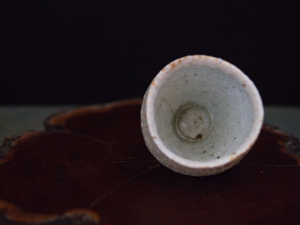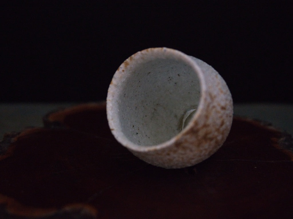 Dieser Becher stammt von Ishida Kazuya aus Bizen und zeigt eindrucksvoll, wie roher Porzellanton und feine Farbnuancen im Holzbrand zusammenfinden. Die kleine Schale besitzt eine archaisch-raue Oberfläche mit kristallinen Partien, die an verwitterten Stein erinnern.