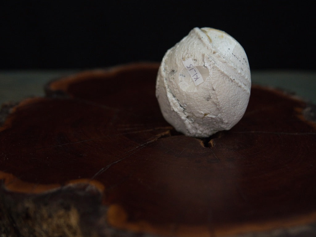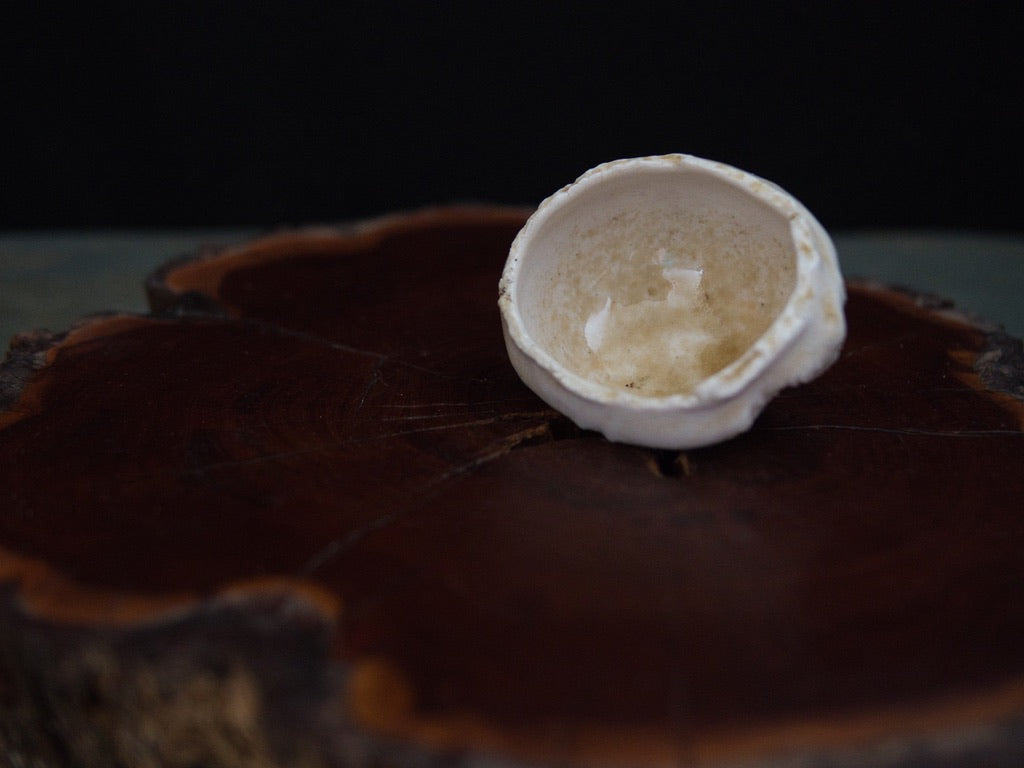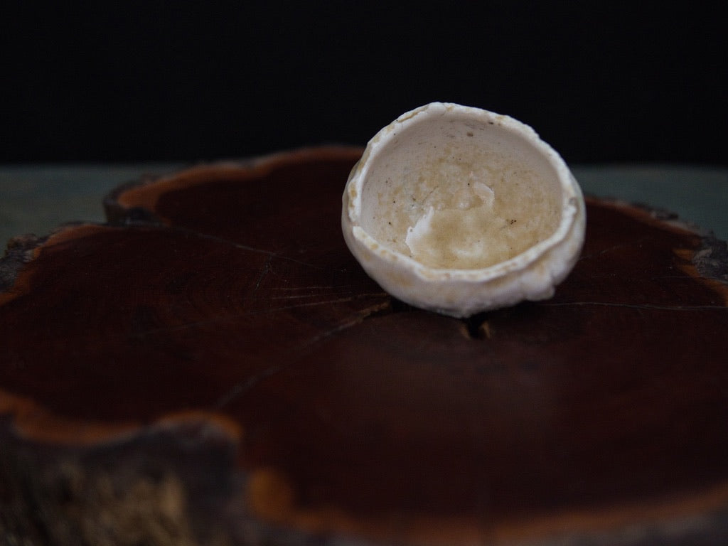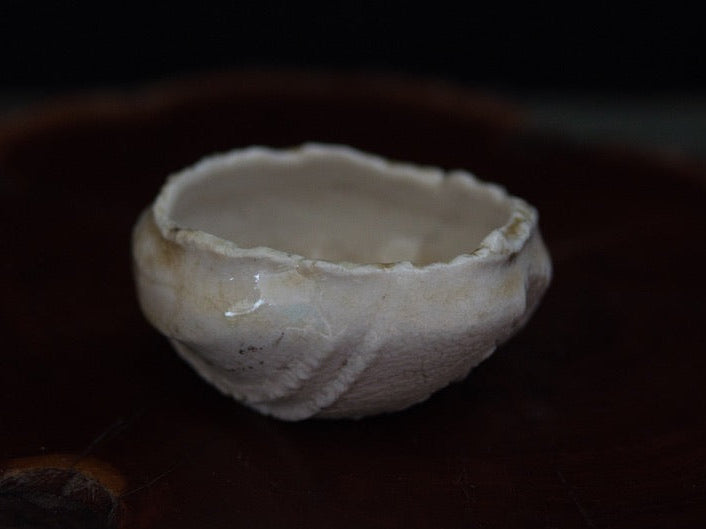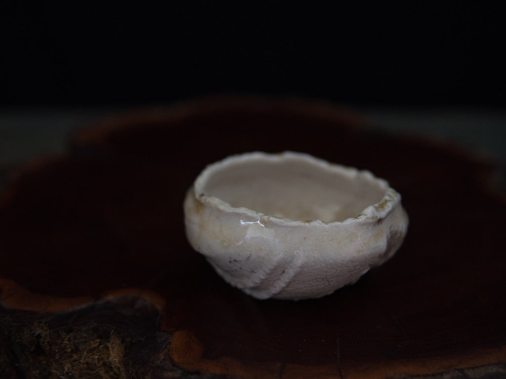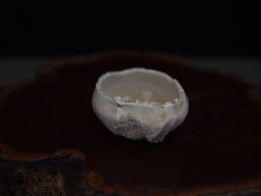 Dieser Guinomi besteht aus unglasiertem, rohem Porzellanton, der im mehrtägigen Holzbrand seine charakteristische Zeichnung und warme Farbnuancen entwickelt hat. Der Ton, eigentlich von Natur aus hell, zeigt durch den direkten Kontakt mit Flammen und Asche goldene, bernsteinfarbene und cremeweiße Strukturen, die sich wie von Hand gemalt über die Oberfläche legen – obwohl sie vollständig durch den Brand entstanden sind.