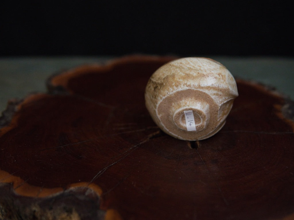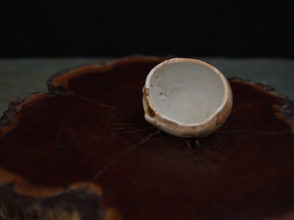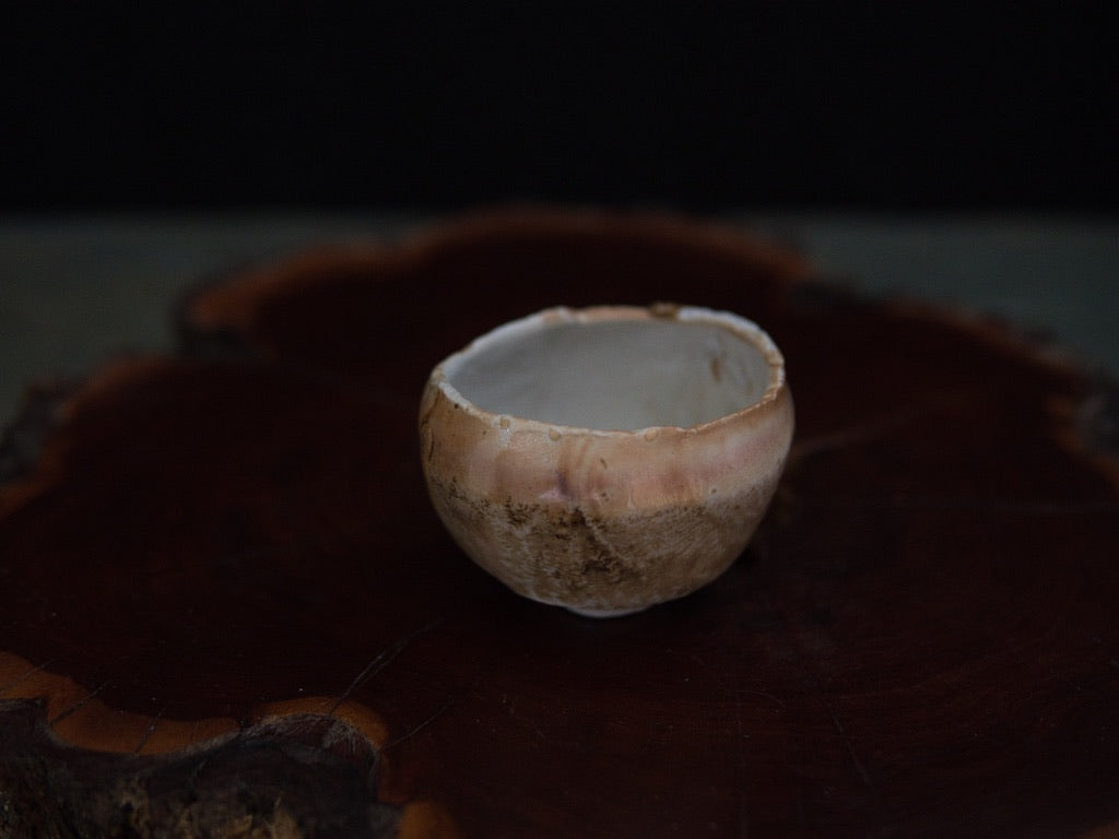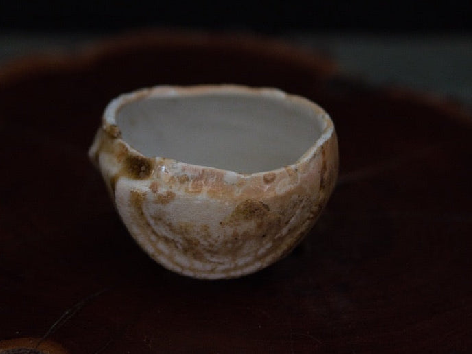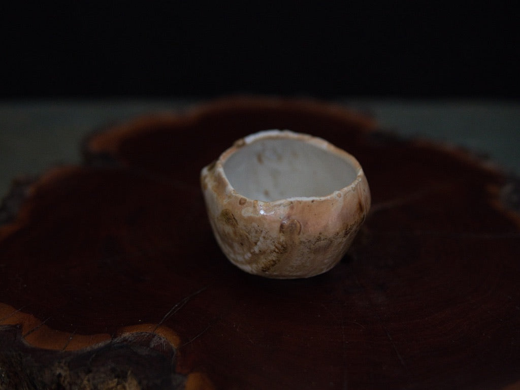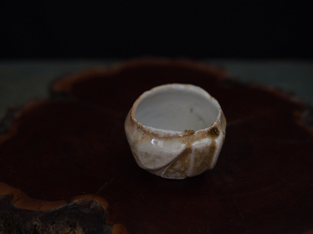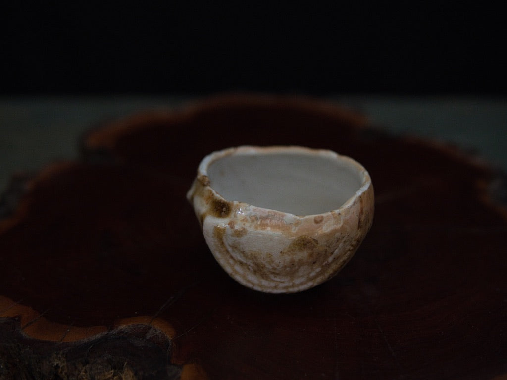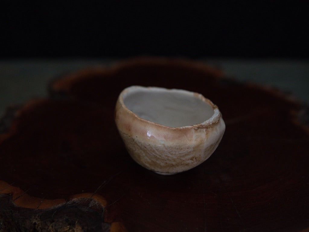 Dieser Guinomi besteht aus unglasiertem, rohem Porzellanton, der im mehrtägigen Holzbrand seine charakteristische Zeichnung und warme Farbnuancen entwickelt hat. Der Ton, eigentlich von Natur aus hell, zeigt durch den direkten Kontakt mit Flammen und Asche goldene, bernsteinfarbene und cremeweiße Strukturen, die sich wie von Hand gemalt über die Oberfläche legen – obwohl sie vollständig durch den Brand entstanden sind.