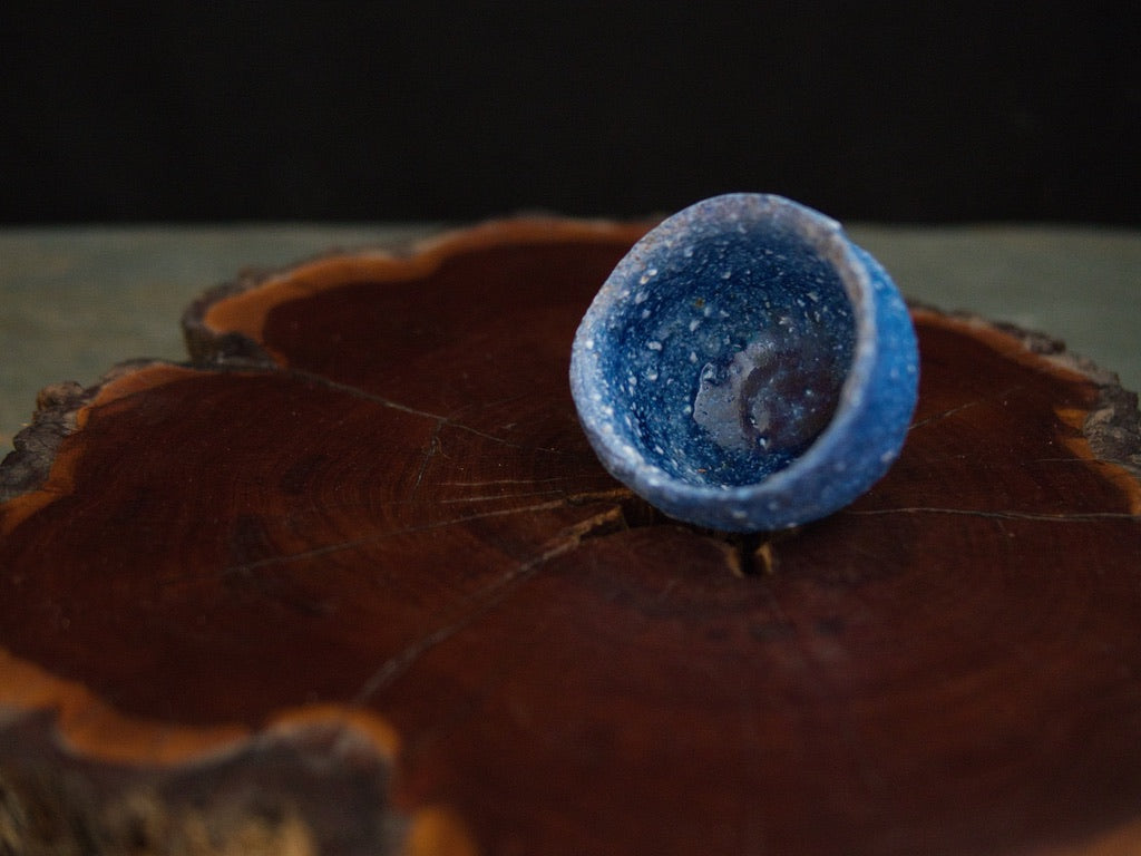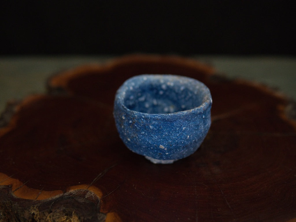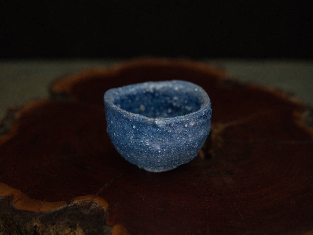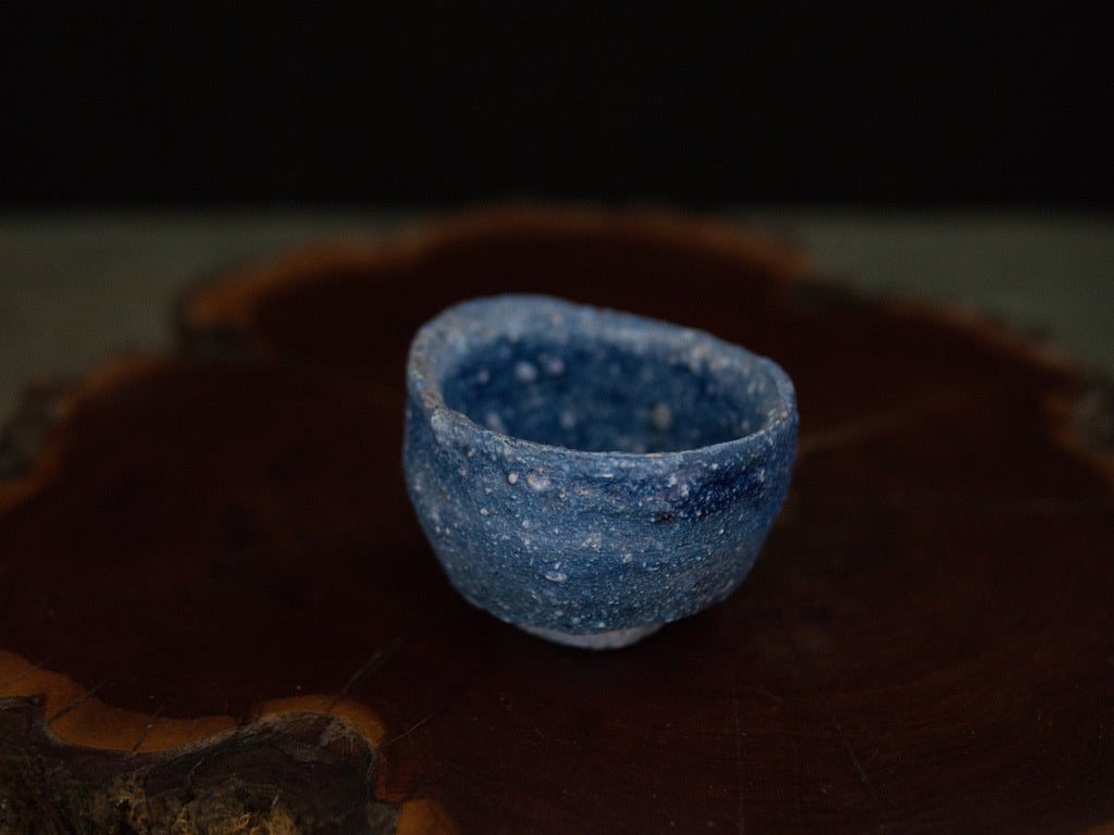 Dieser Guinomi zeigt eine außergewöhnlich intensive, mineralische Kobaltblau-Färbung, die in der Keramiklandschaft selten zu finden ist. Die Oberfläche wirkt wie ein verdichtetes Stück Himmel oder Gesteinsschicht: sattes Blau, durchsetzt mit hellen Einsprengseln und kleinen, glasig verschmolzenen Partikeln, die an natürliche Mineralkristalle erinnern.
