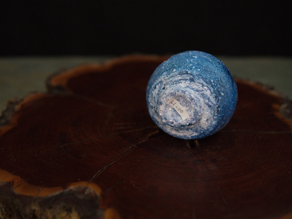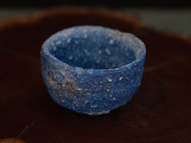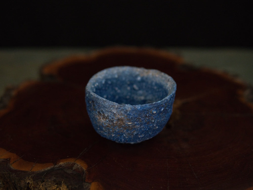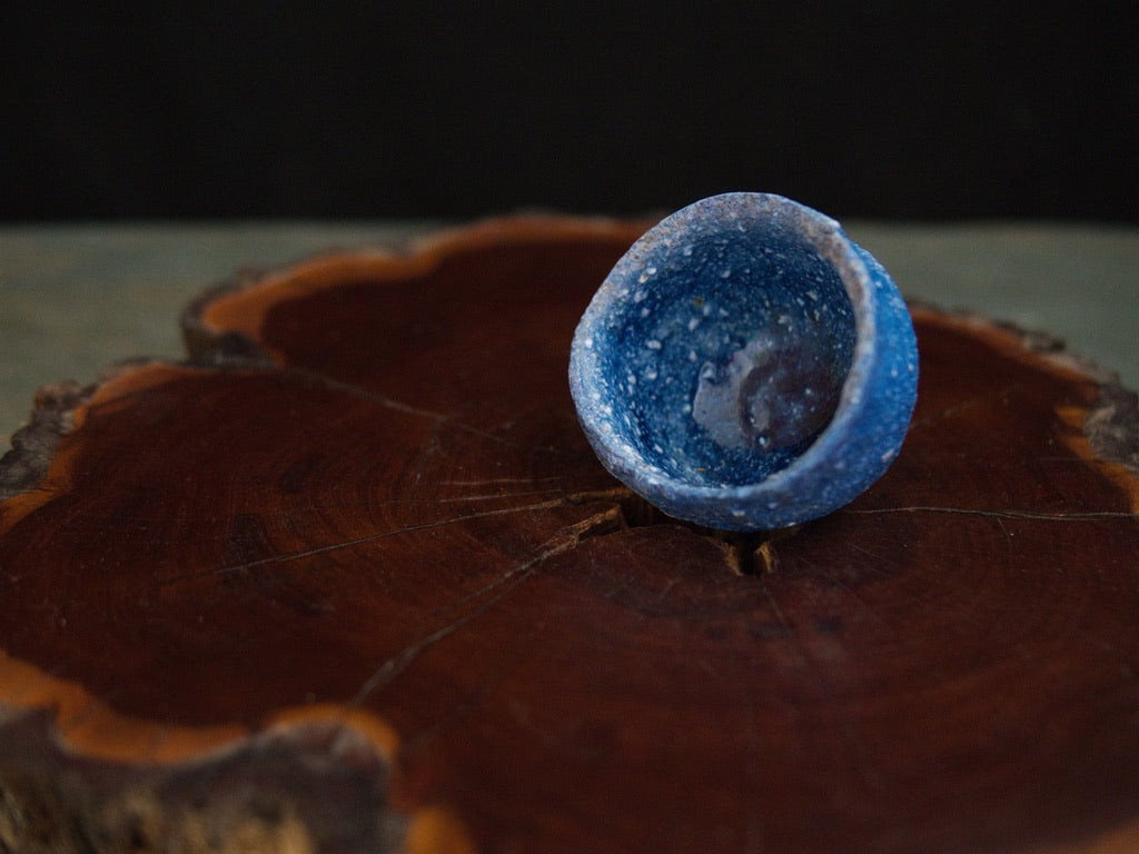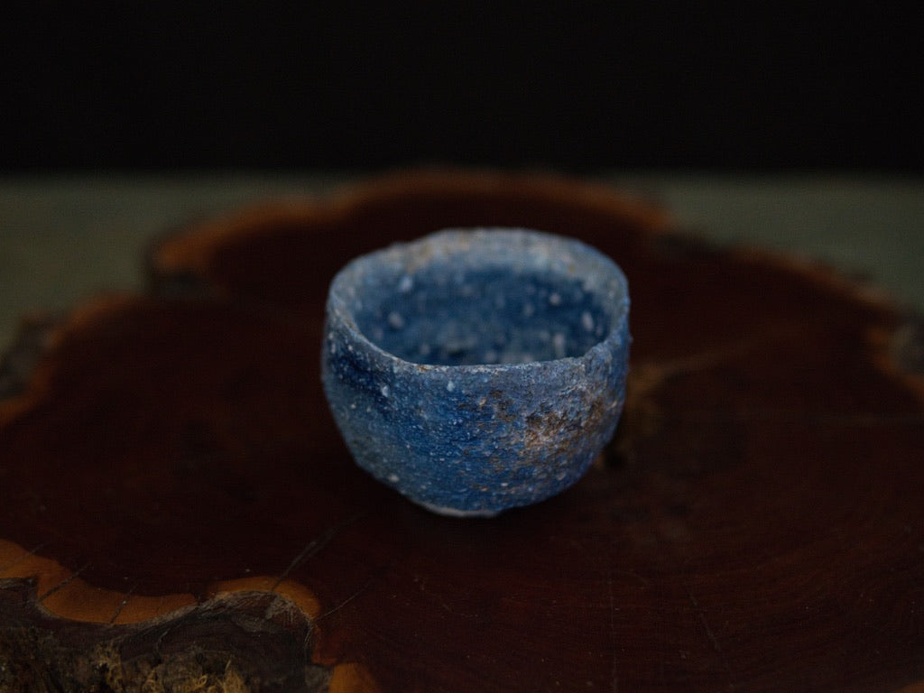 Dieser Guinomi zeigt eine außergewöhnlich intensive, mineralische Kobaltblau-Färbung, die in der Keramiklandschaft selten zu finden ist. Die Oberfläche wirkt wie ein verdichtetes Stück Himmel oder Gesteinsschicht: sattes Blau, durchsetzt mit hellen Einsprengseln und kleinen, glasig verschmolzenen Partikeln, die an natürliche Mineralkristalle erinnern.