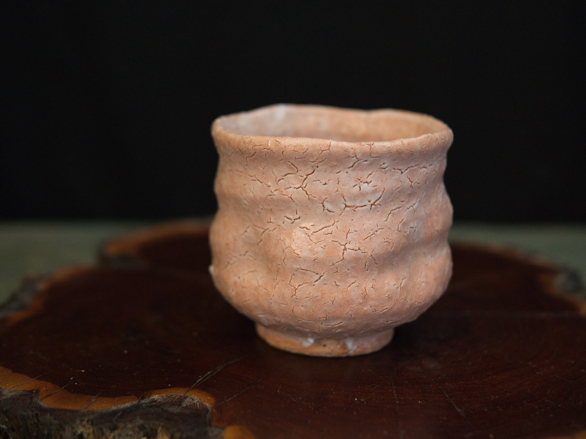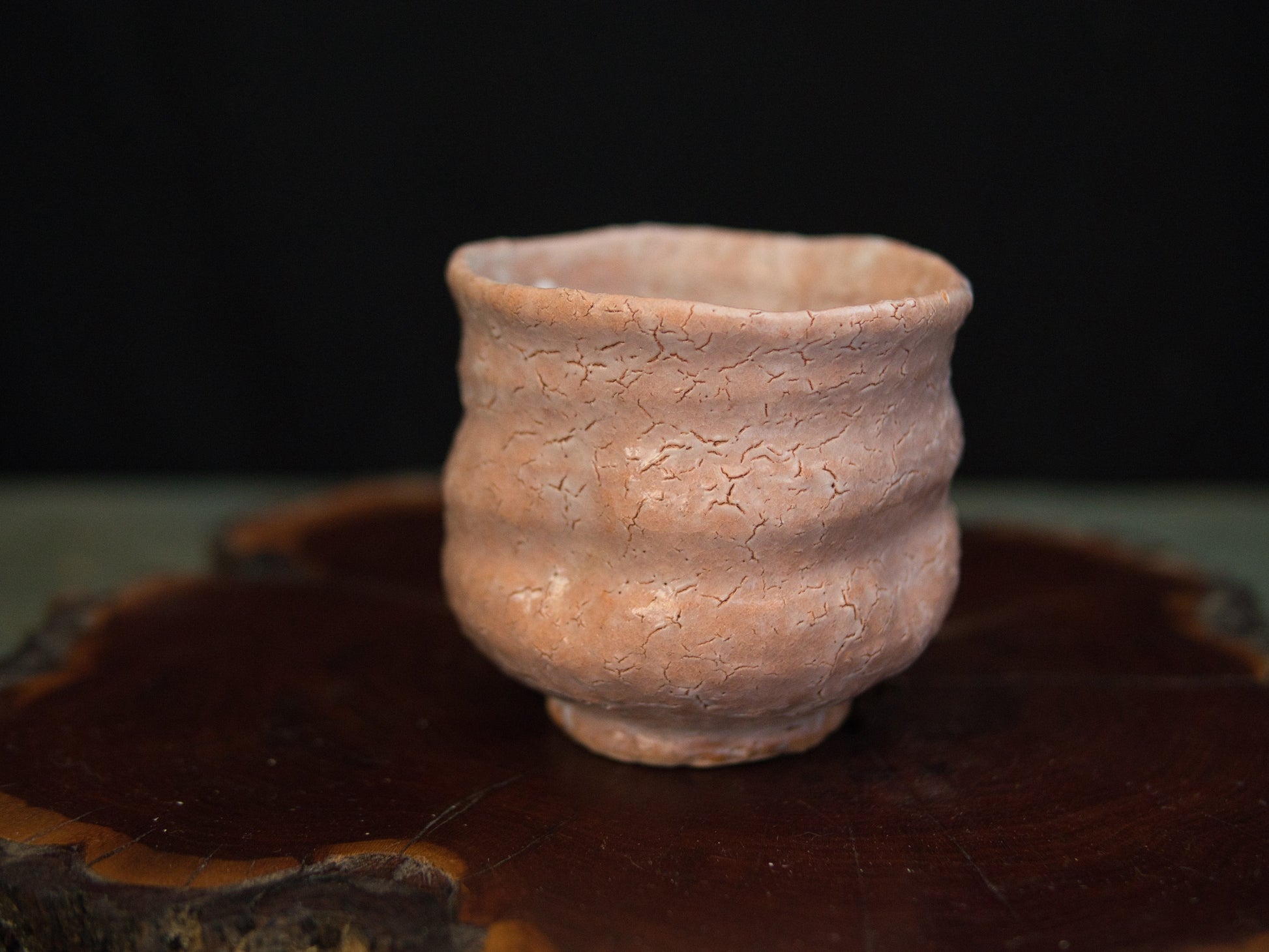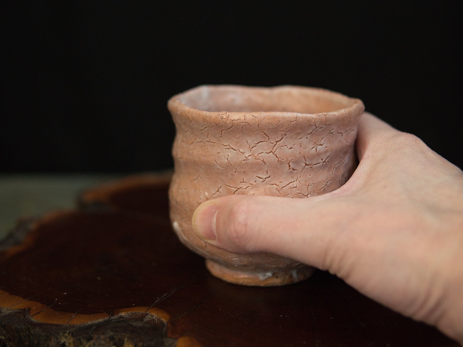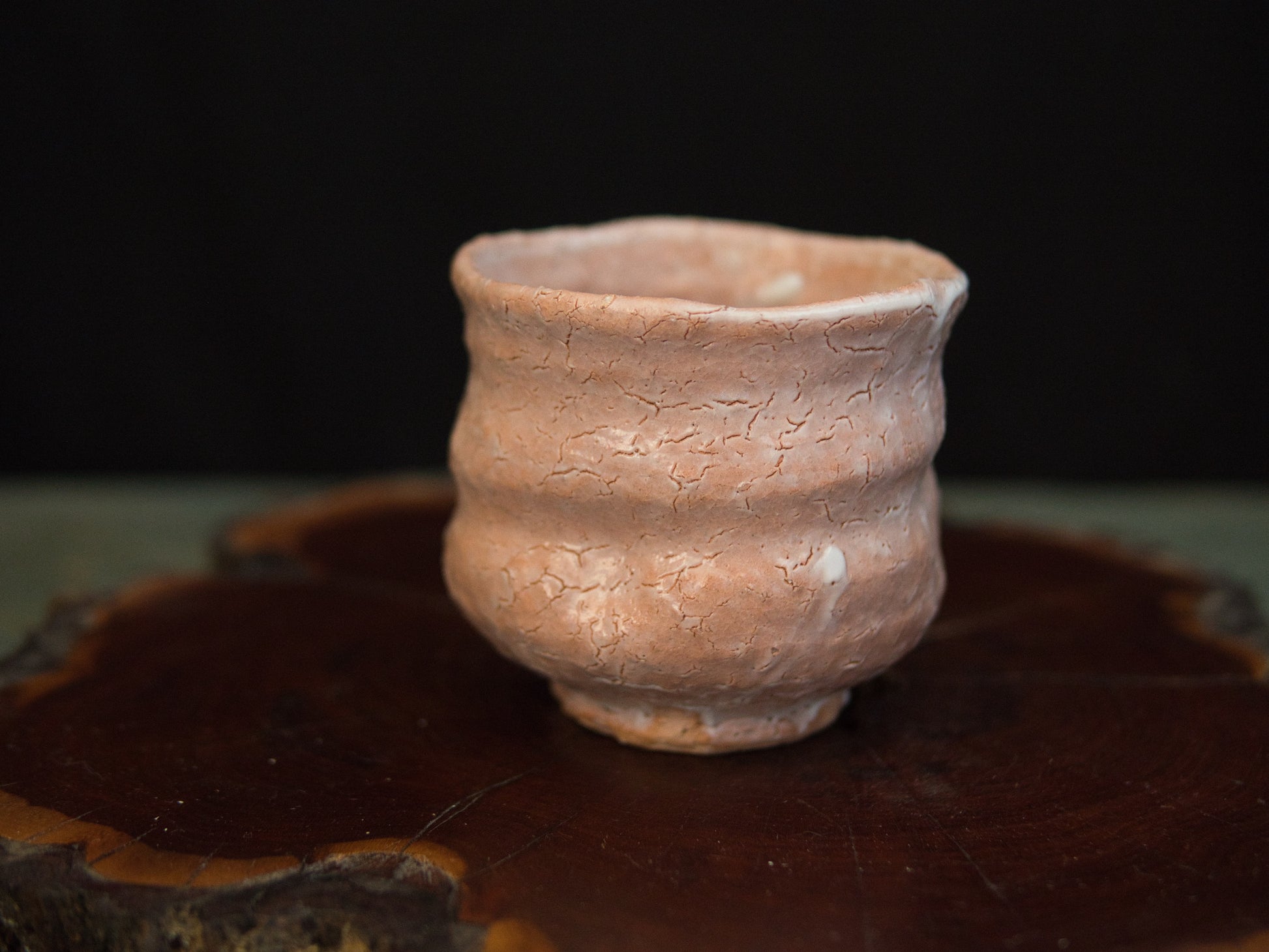 Dieser Hagi-Becher stammt von Kunisuke Nakahara. Die matte, leicht rosige Haut zeigt ein feines Netz aus natürlichen Rissen, die an ausgetrocknete Erde erinnern. Die Form ist bewusst schlicht gehalten: weich gewellte Konturen, ein leicht eingezogener Fuß und eine Form, die sich an die Hand schmiegt, als hätte sie dort schon immer hingehört.