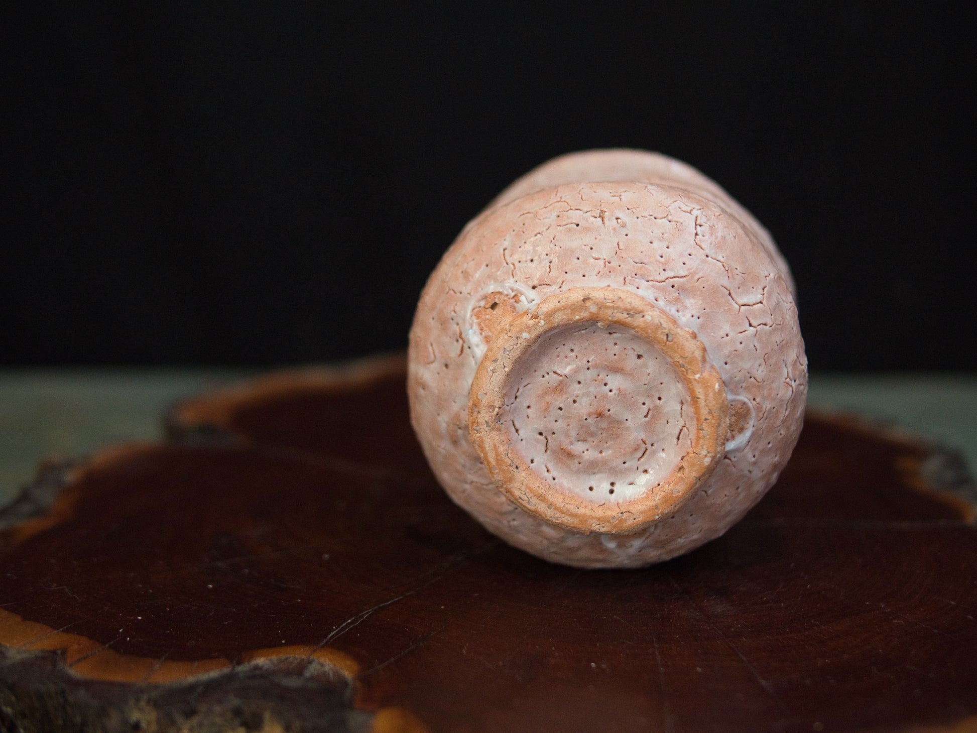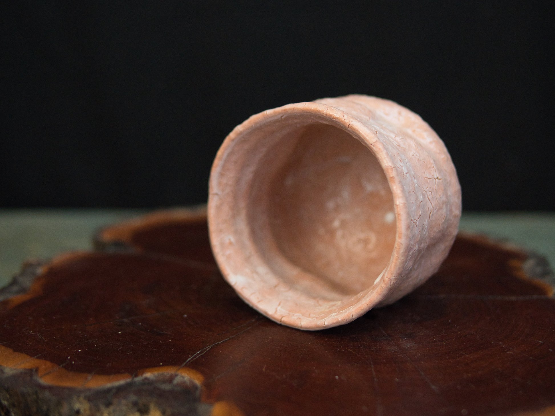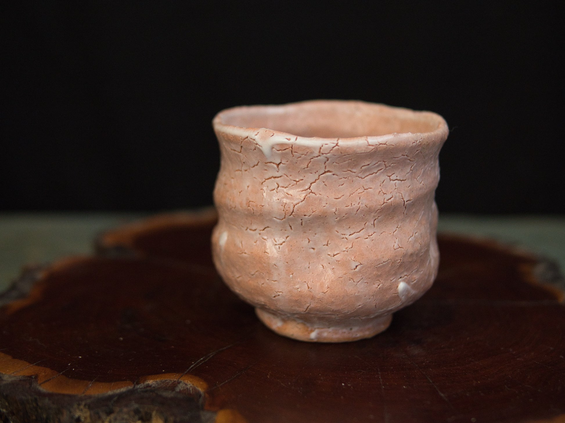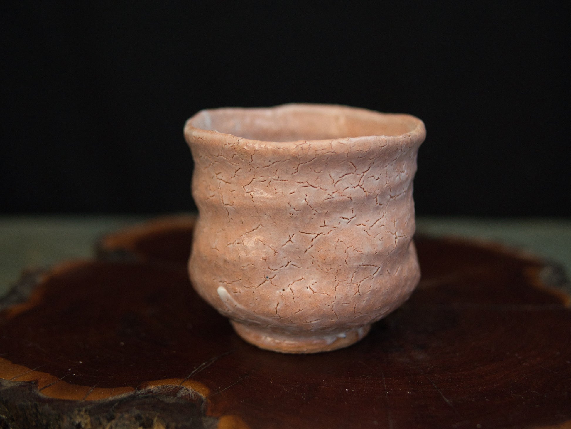 Dieser Hagi-Becher stammt von Kunisuke Nakahara. Die matte, leicht rosige Haut zeigt ein feines Netz aus natürlichen Rissen, die an ausgetrocknete Erde erinnern. Die Form ist bewusst schlicht gehalten: weich gewellte Konturen, ein leicht eingezogener Fuß und eine Form, die sich an die Hand schmiegt, als hätte sie dort schon immer hingehört.