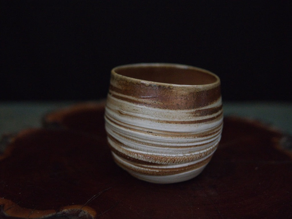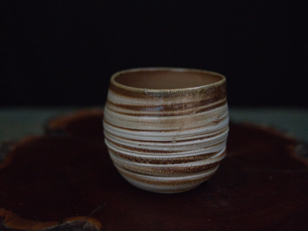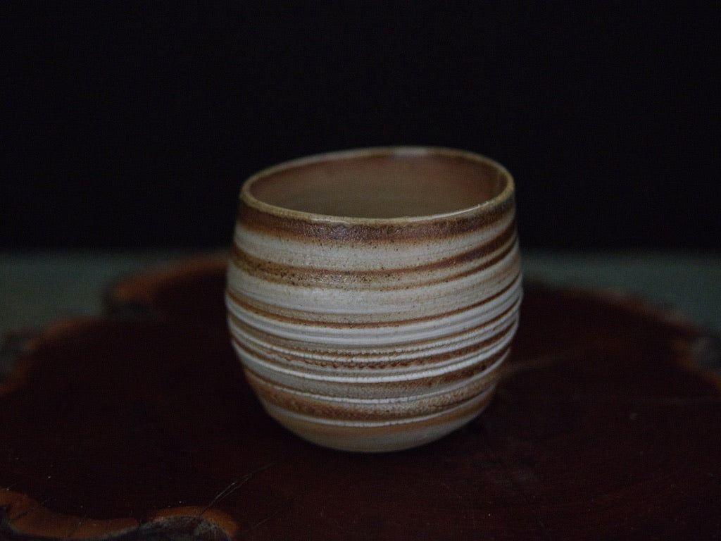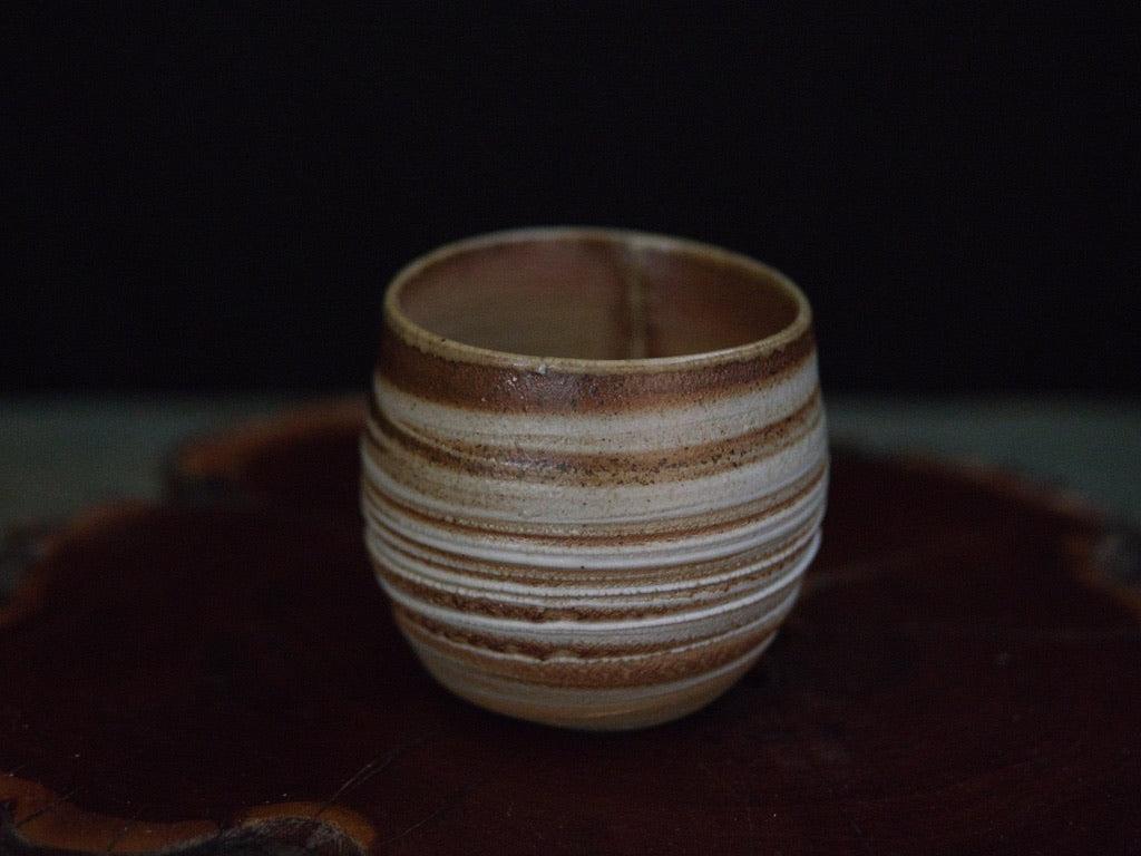 Dieser Becher von Ishida Kazuya ist in der raho-Technik gefertigt, einer Methode, bei der verschieden gefärbte Tonschichten schichtweise aufgebaut und anschließend gedreht werden. Durch das Drehen treten die natürlichen Übergänge der Schichten an der Oberfläche hervor und bilden die charakteristischen, umlaufenden Linien – ein Effekt, der an geologische Schichtungen erinnert und jedes Stück einzigartig macht.