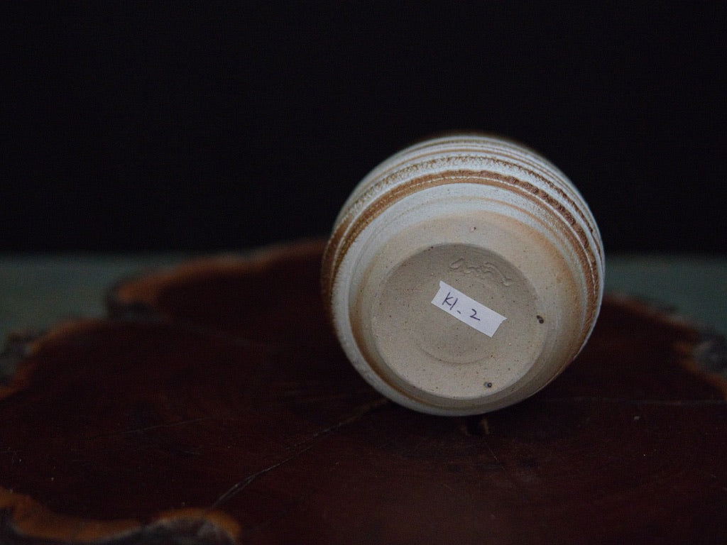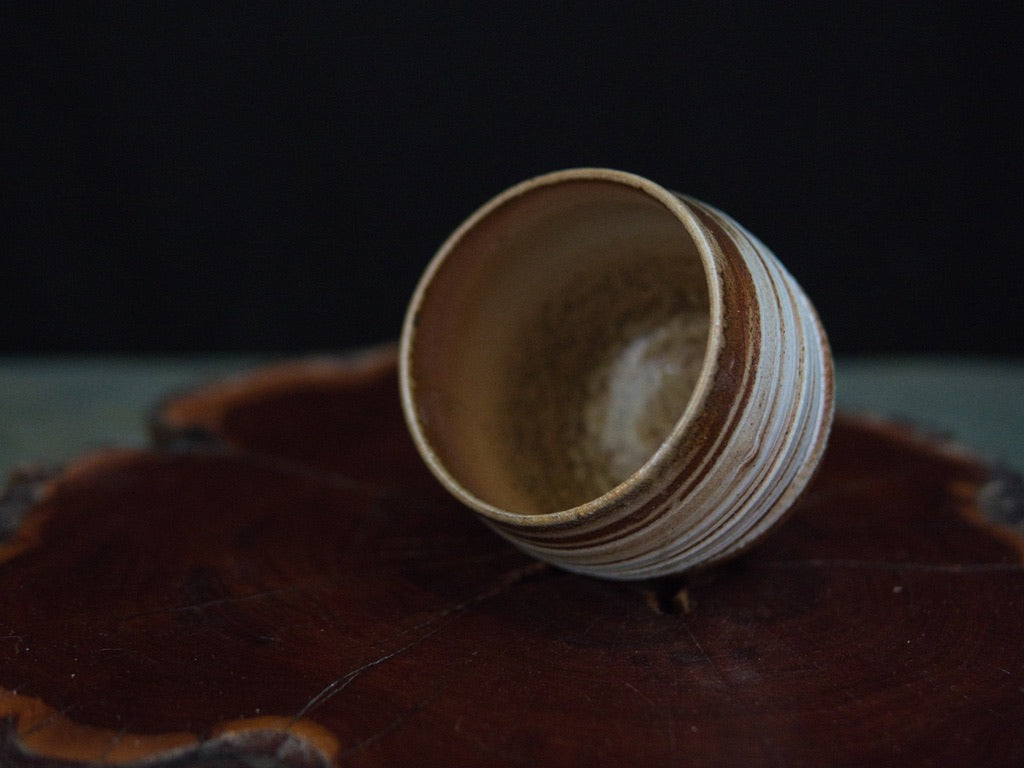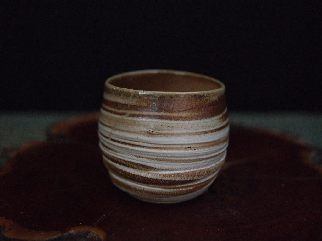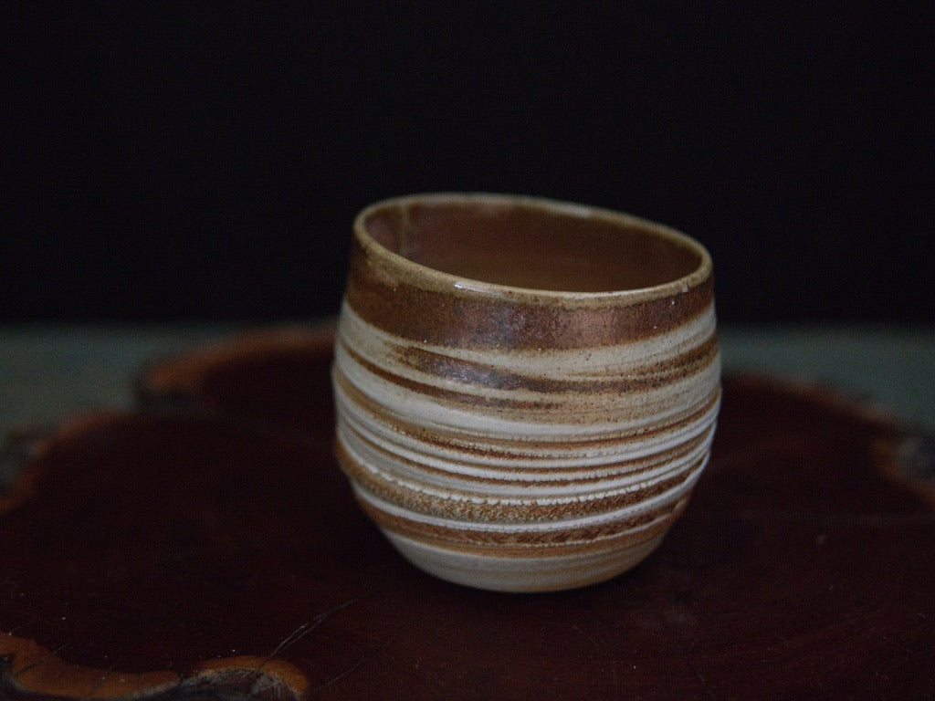 Dieser Becher von Ishida Kazuya ist in der raho-Technik gefertigt, einer Methode, bei der verschieden gefärbte Tonschichten schichtweise aufgebaut und anschließend gedreht werden. Durch das Drehen treten die natürlichen Übergänge der Schichten an der Oberfläche hervor und bilden die charakteristischen, umlaufenden Linien – ein Effekt, der an geologische Schichtungen erinnert und jedes Stück einzigartig macht.