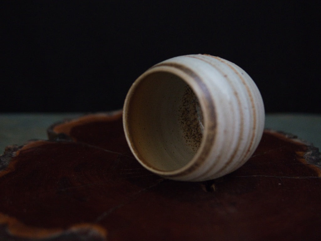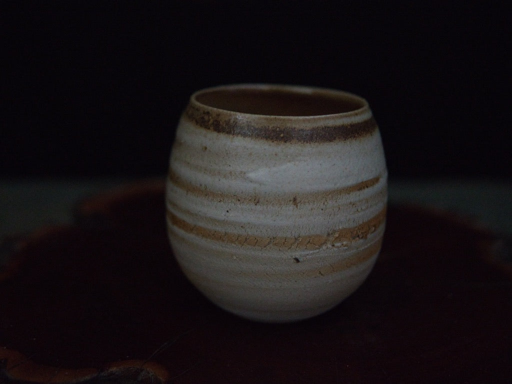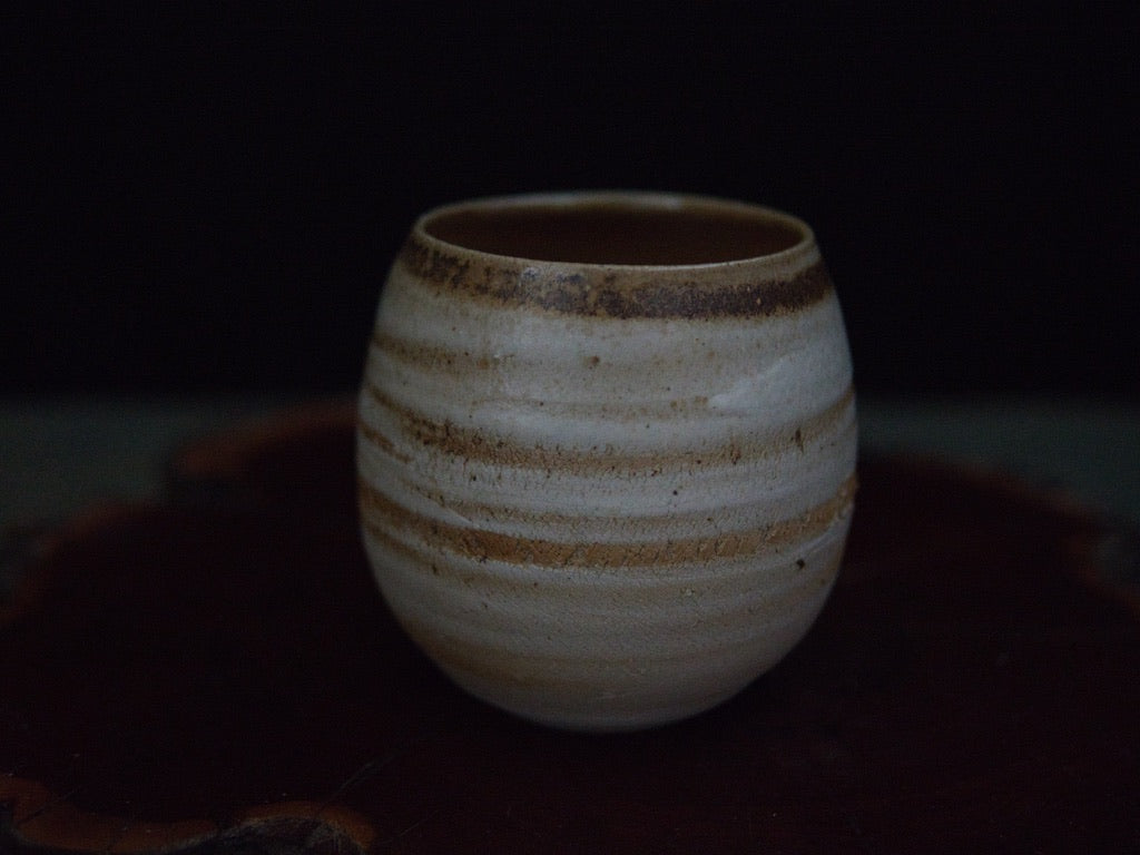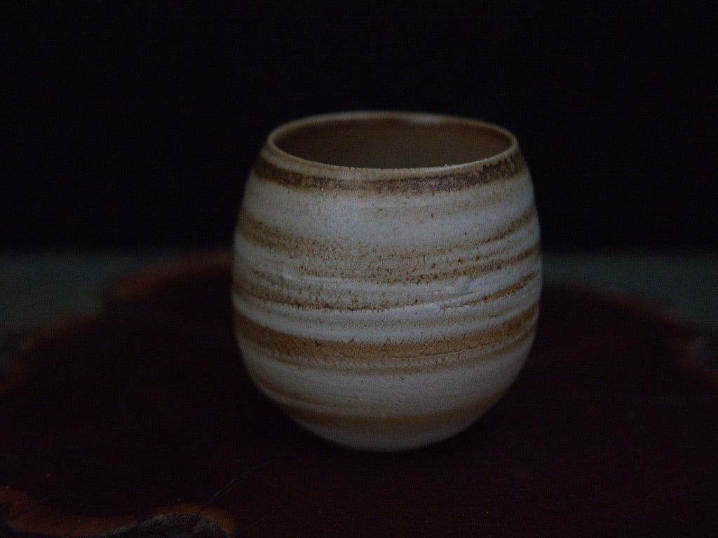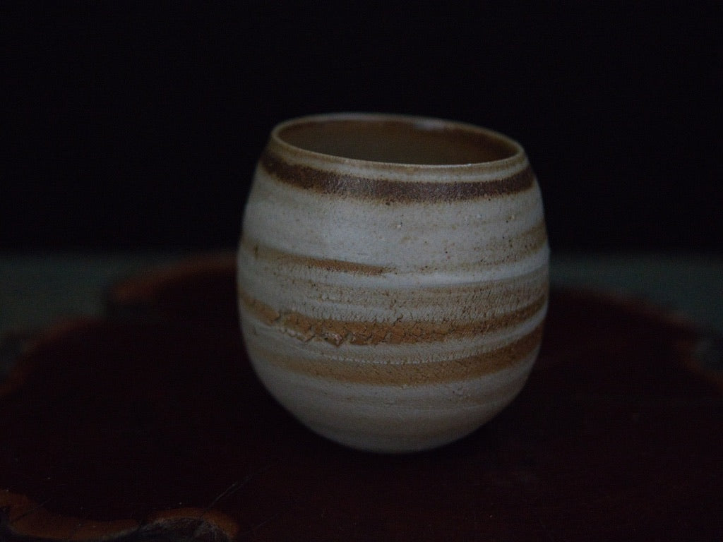 Dieser Becher von Ishida Kazuya ist in der raho-Technik gefertigt, einer Methode, bei der verschieden gefärbte Tonschichten schichtweise aufgebaut und anschließend gedreht werden. Durch das Drehen treten die natürlichen Übergänge der Schichten an der Oberfläche hervor und bilden die charakteristischen, umlaufenden Linien – ein Effekt, der an geologische Schichtungen erinnert und jedes Stück einzigartig macht.