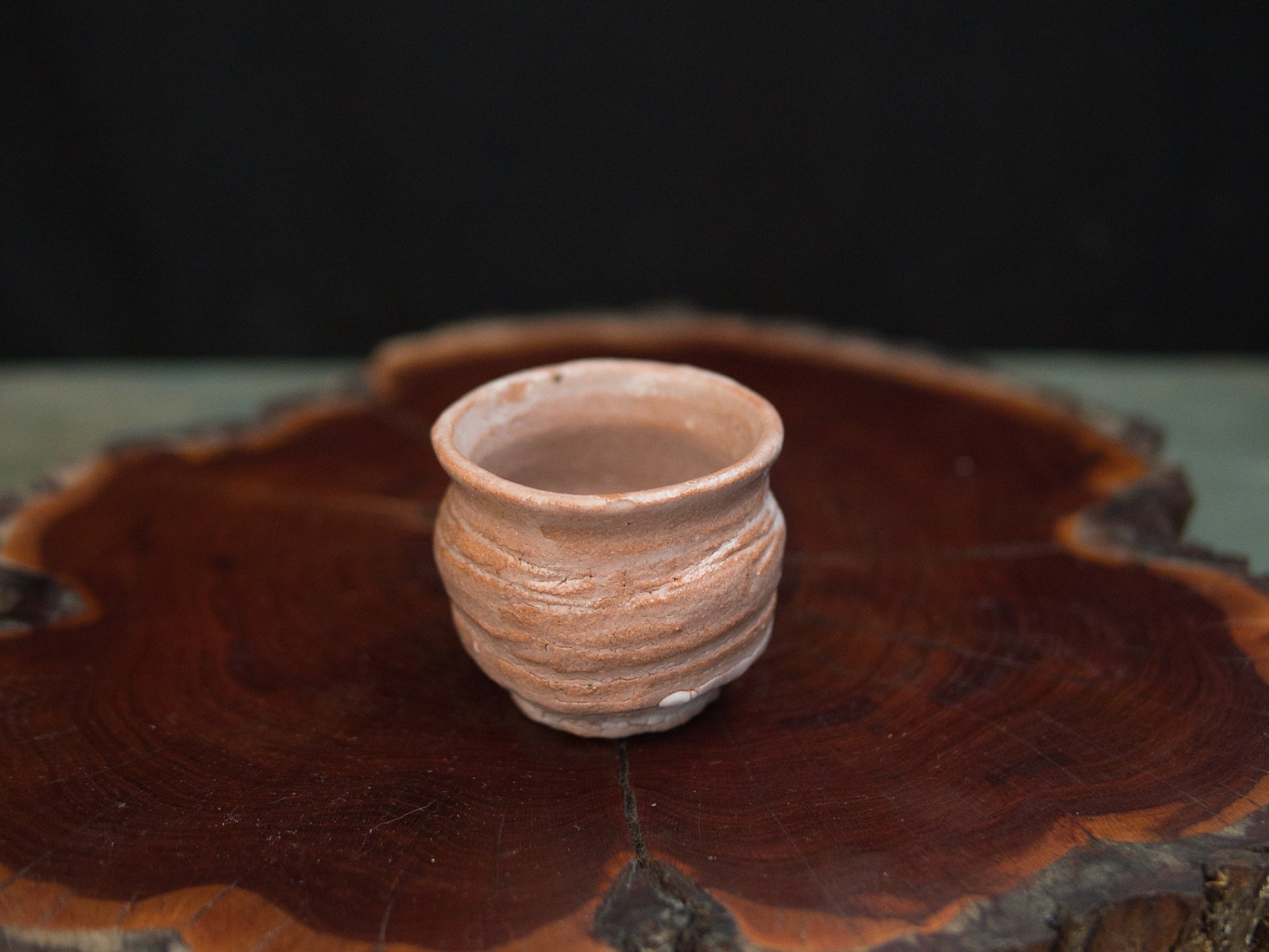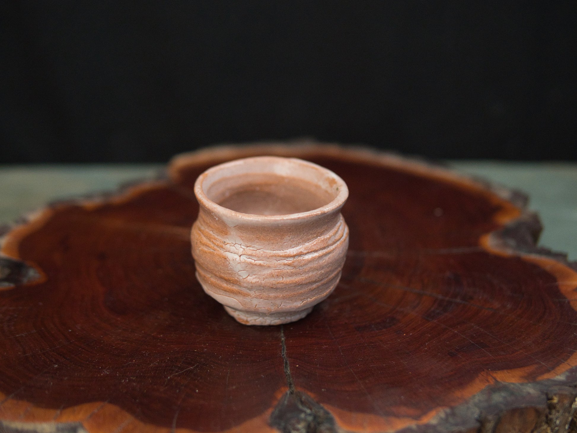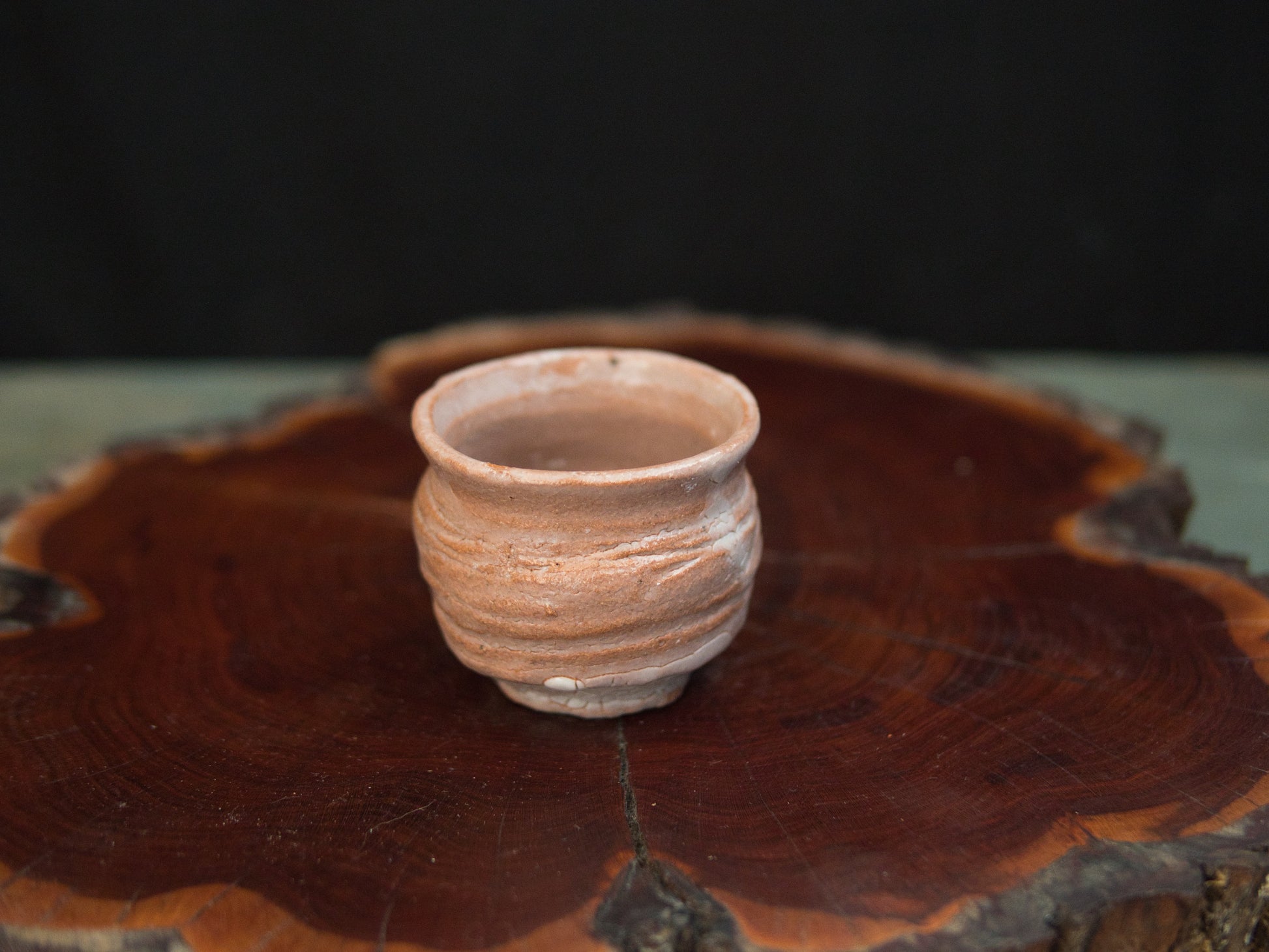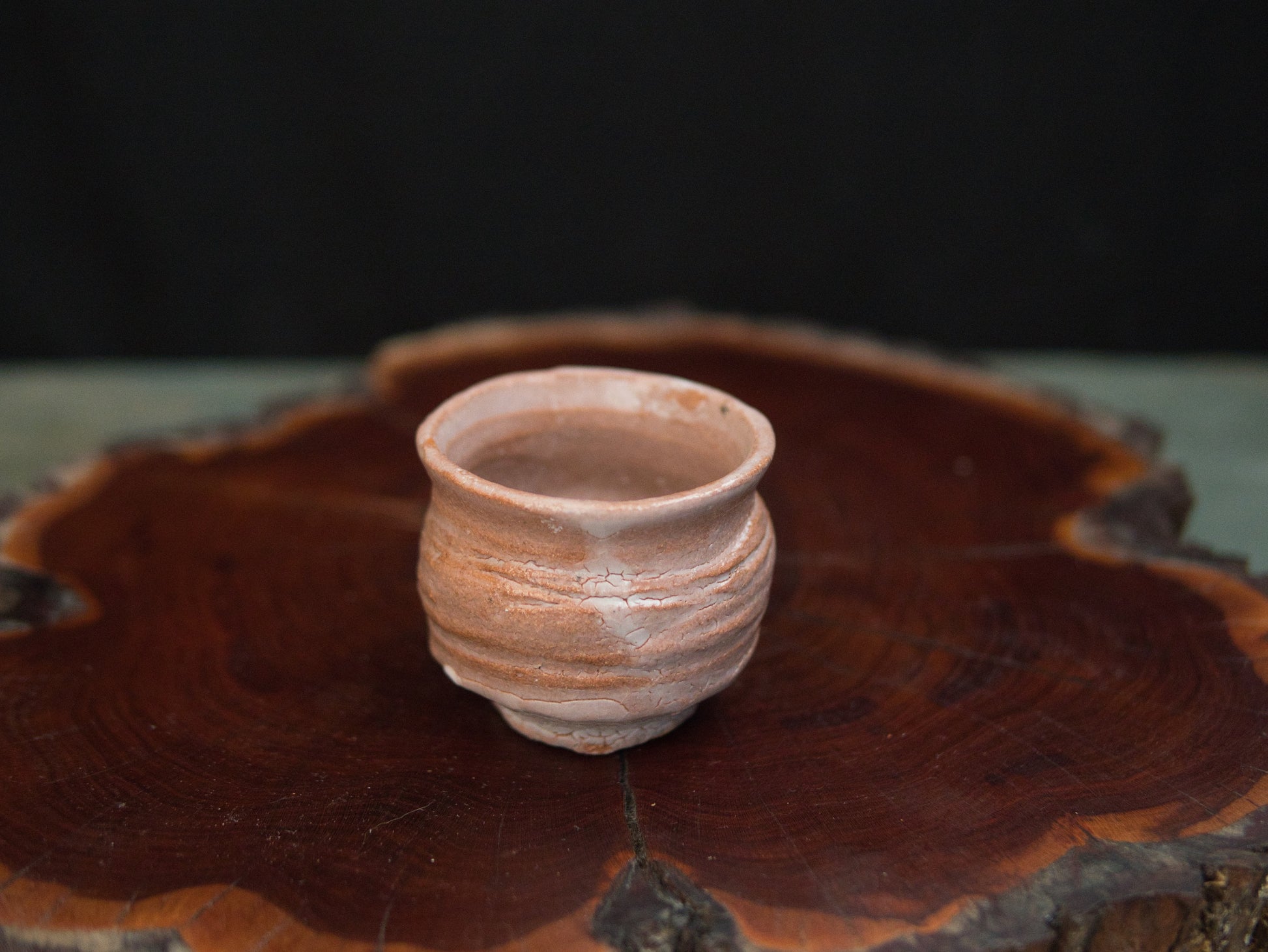 Typisch für Koga Kenjis Werk ist die erdige Präsenz des Karatsu-Tons, kombiniert mit einer Glasurführung, die dem Zufall Raum lässt. Die matte, leicht rosige Haut zeigt ein feines Netz aus natürlichen Rissen, die an ausgetrocknete Erde erinnern. Die Form ist bewusst schlicht gehalten: weich gewellte Konturen, ein leicht eingezogener Fuß und eine Form, die sich an die Hand schmiegt, als hätte sie dort schon immer hingehört.
