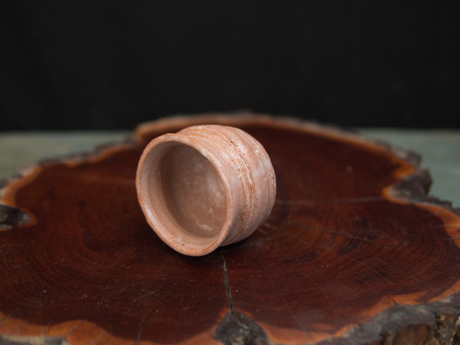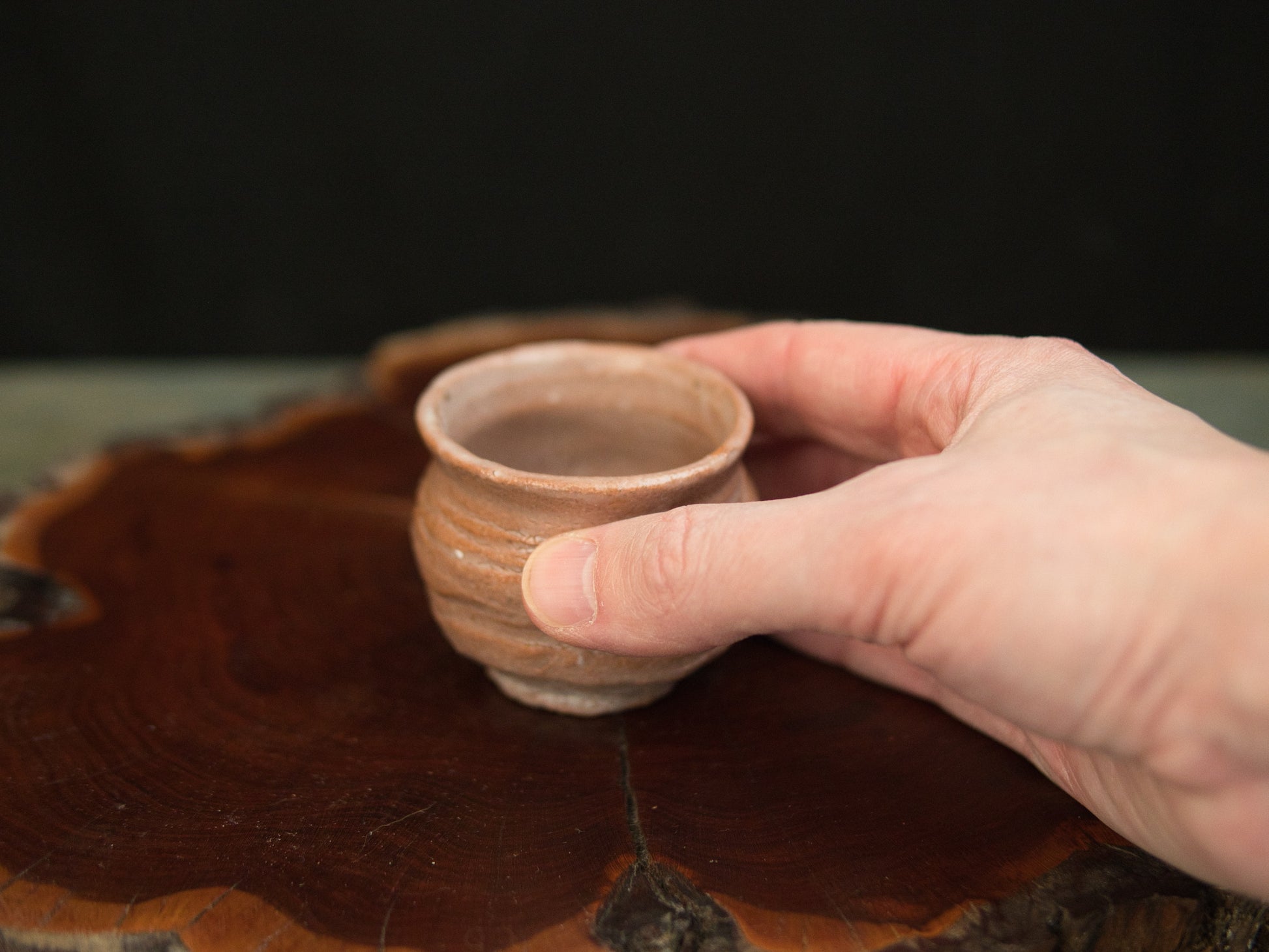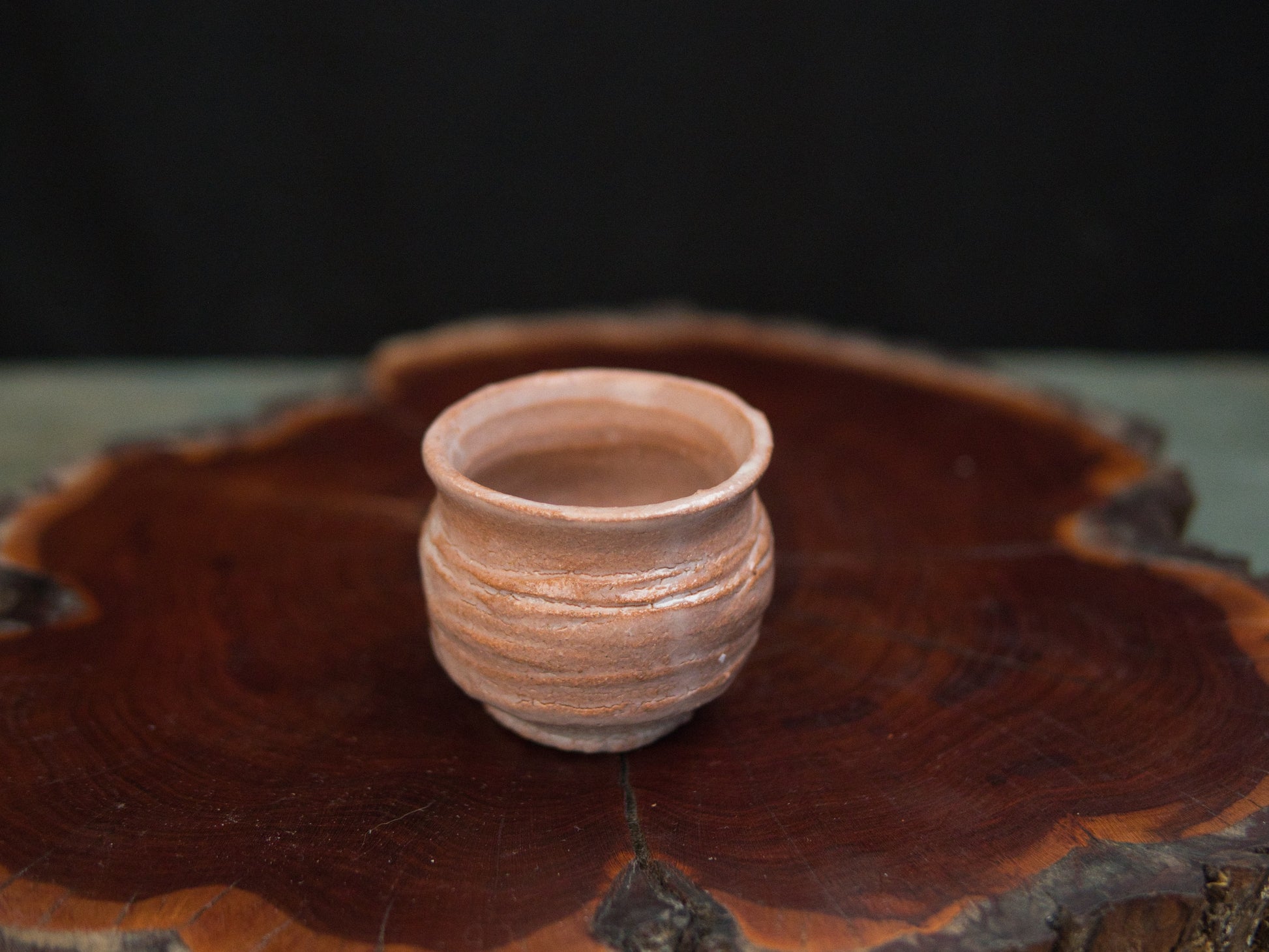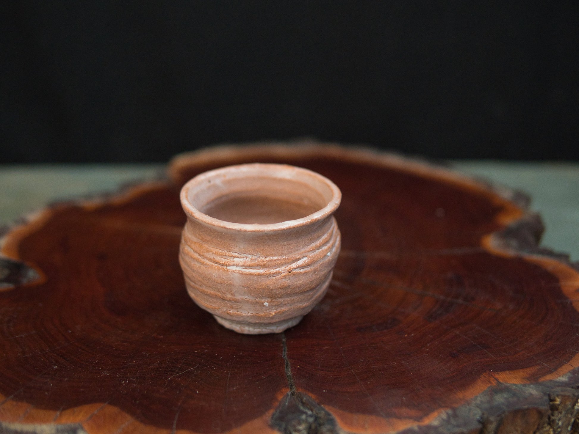 Typisch für Koga Kenjis Werk ist die erdige Präsenz des Karatsu-Tons, kombiniert mit einer Glasurführung, die dem Zufall Raum lässt. Die matte, leicht rosige Haut zeigt ein feines Netz aus natürlichen Rissen, die an ausgetrocknete Erde erinnern. Die Form ist bewusst schlicht gehalten: weich gewellte Konturen, ein leicht eingezogener Fuß und eine Form, die sich an die Hand schmiegt, als hätte sie dort schon immer hingehört.