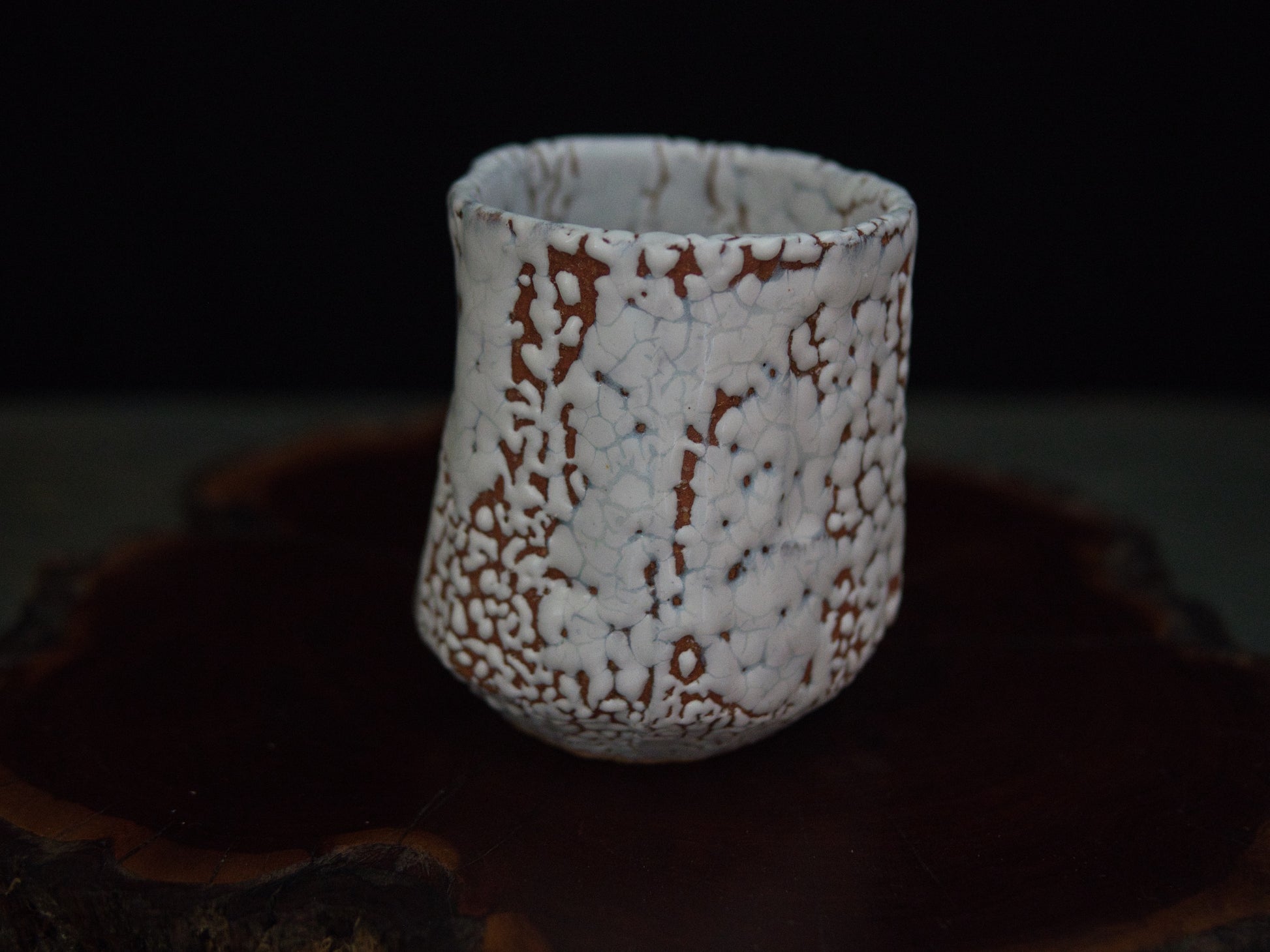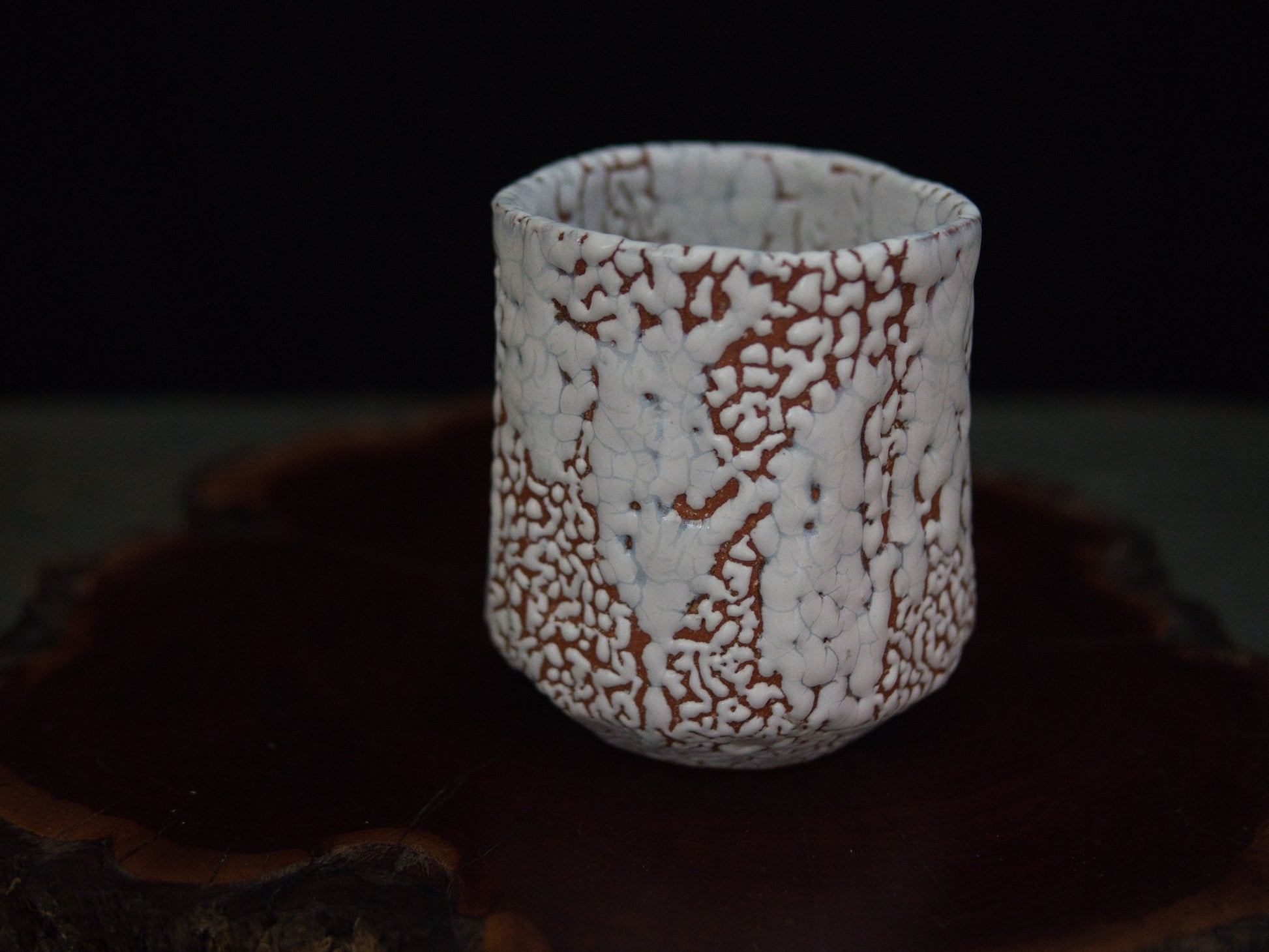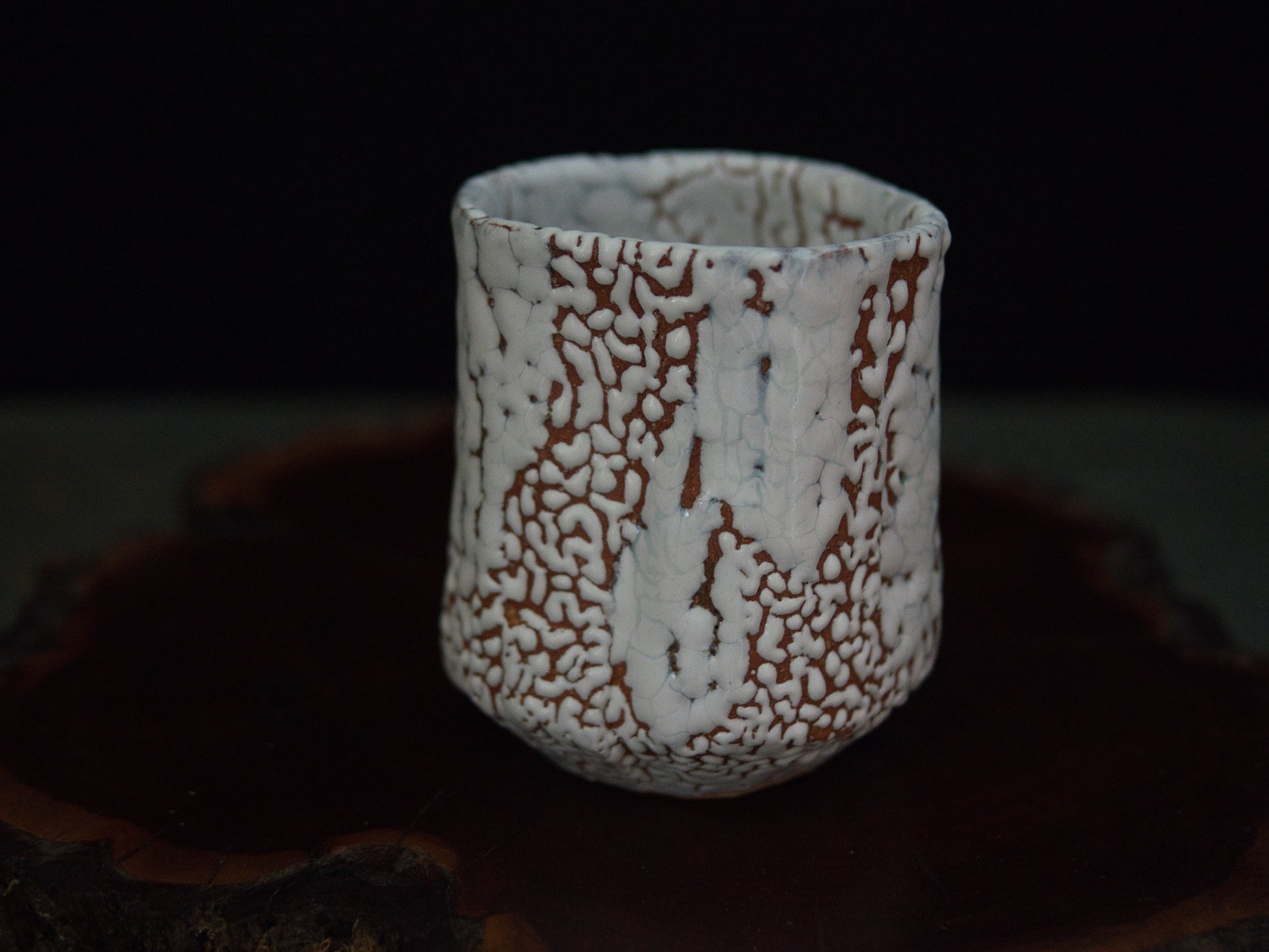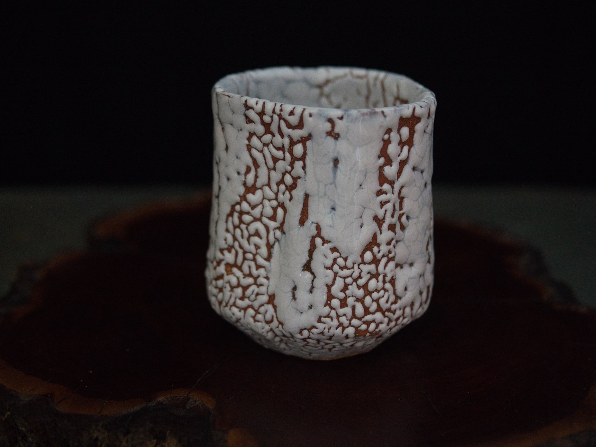 Dieser Teebecher (yunomi 湯呑) trägt eine weiße. zuckergußartige Glasur, die einen schönen Kontrast zum darunter liegenden groben Mishima-Ton bildet. Der Becher hat eine ausgefallene, außen abgeschabte Form und fügt sich gut in die Hand ein. Die Farbe des Tees kommt in diesem Becher sehr gut zur Geltung, da er auch innen hell glasiert ist. Der unebene Verlauf der Glasur verleiht dem Becher einen besonders rustikalen Charme und wie Schneeanflug auf einem Baumstamm.