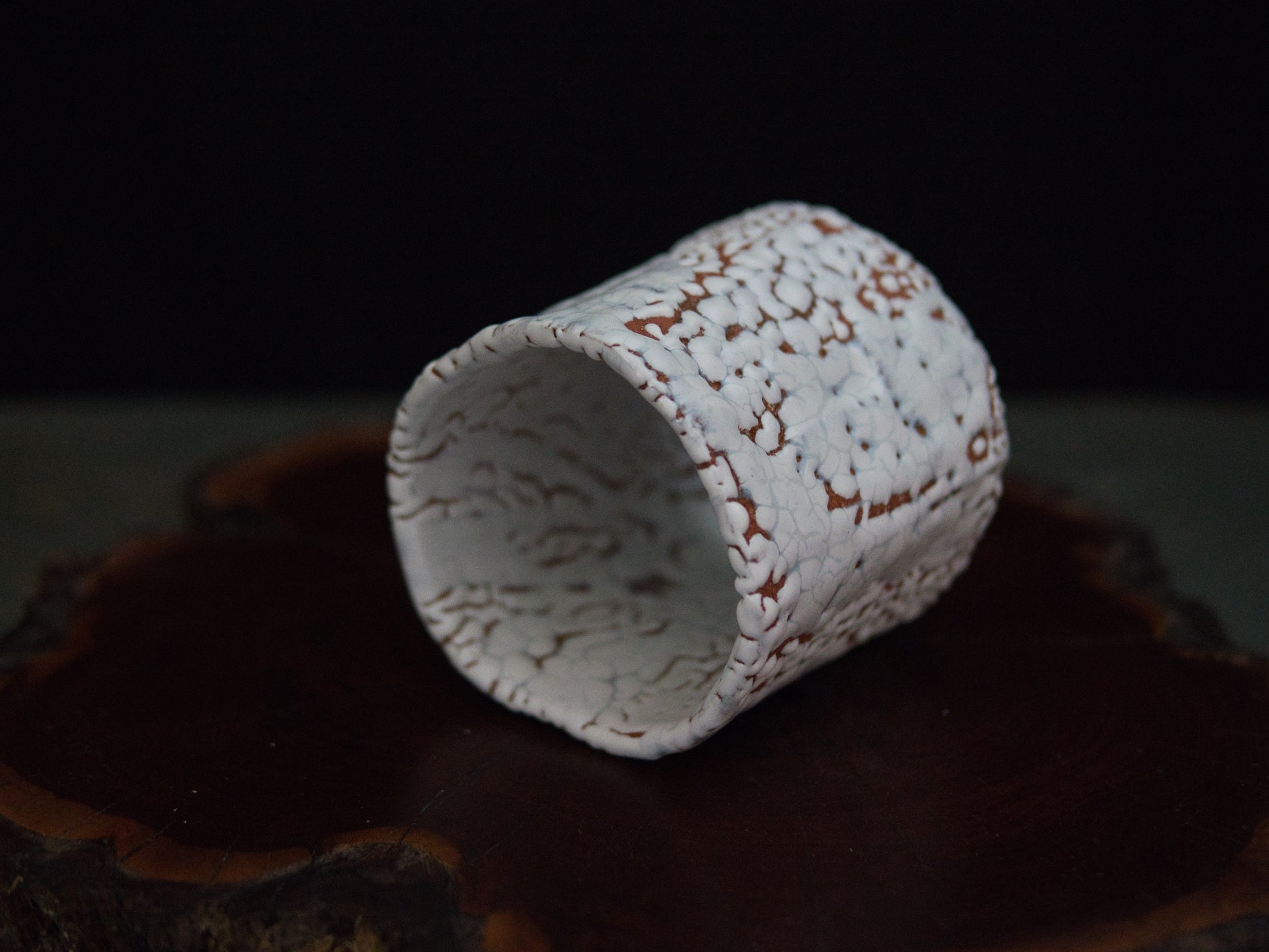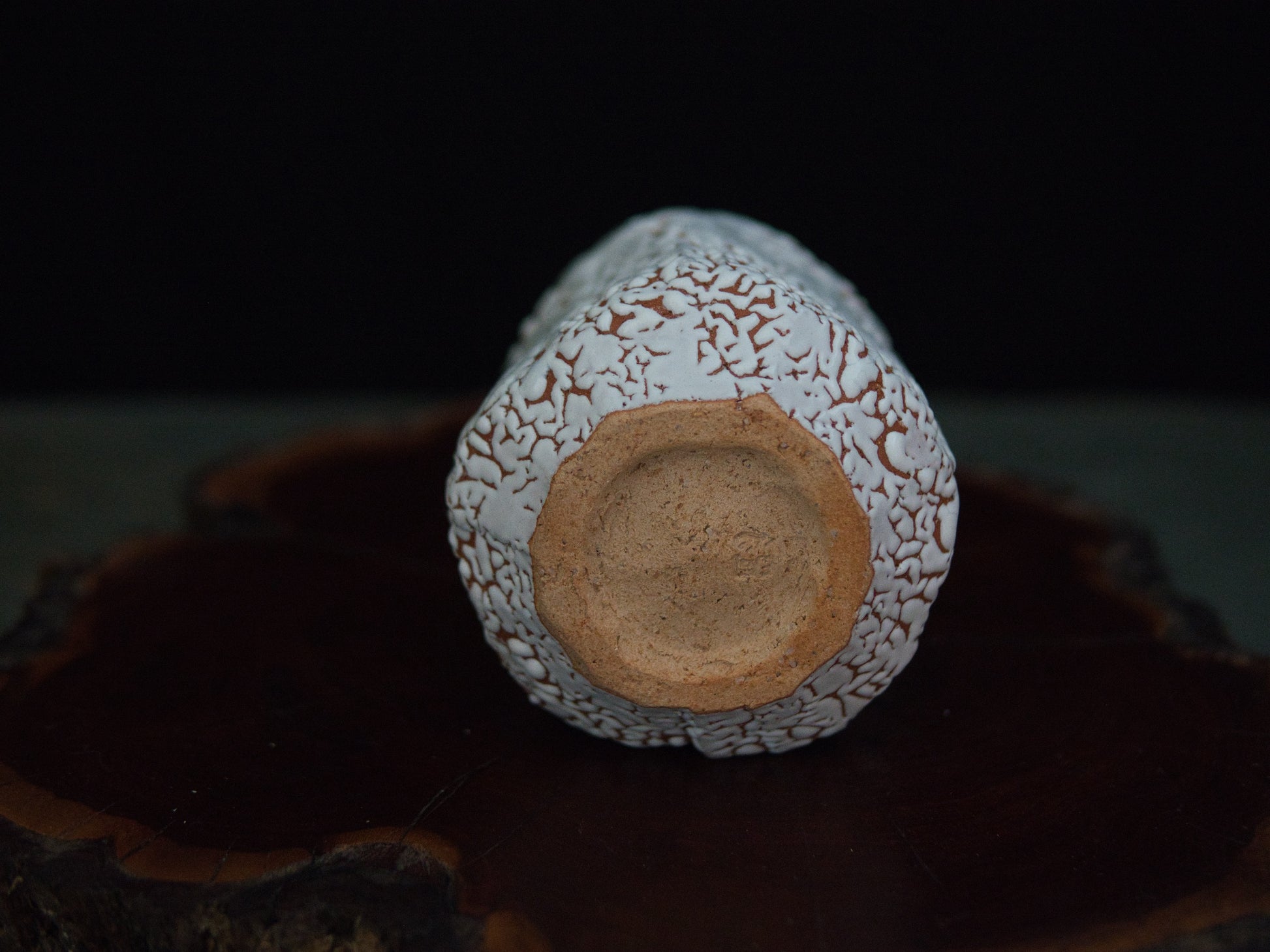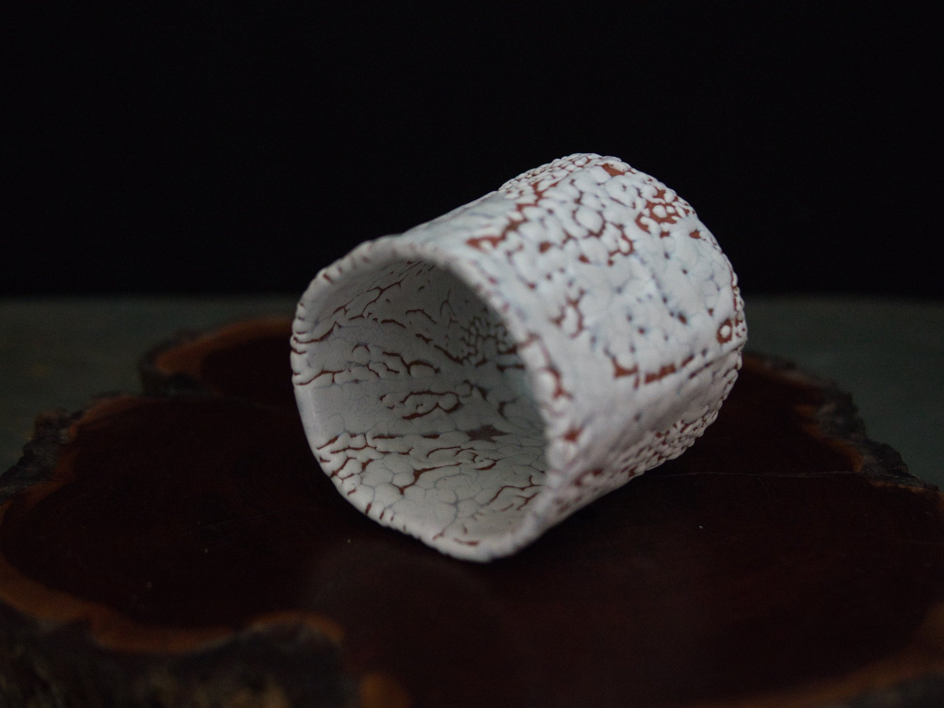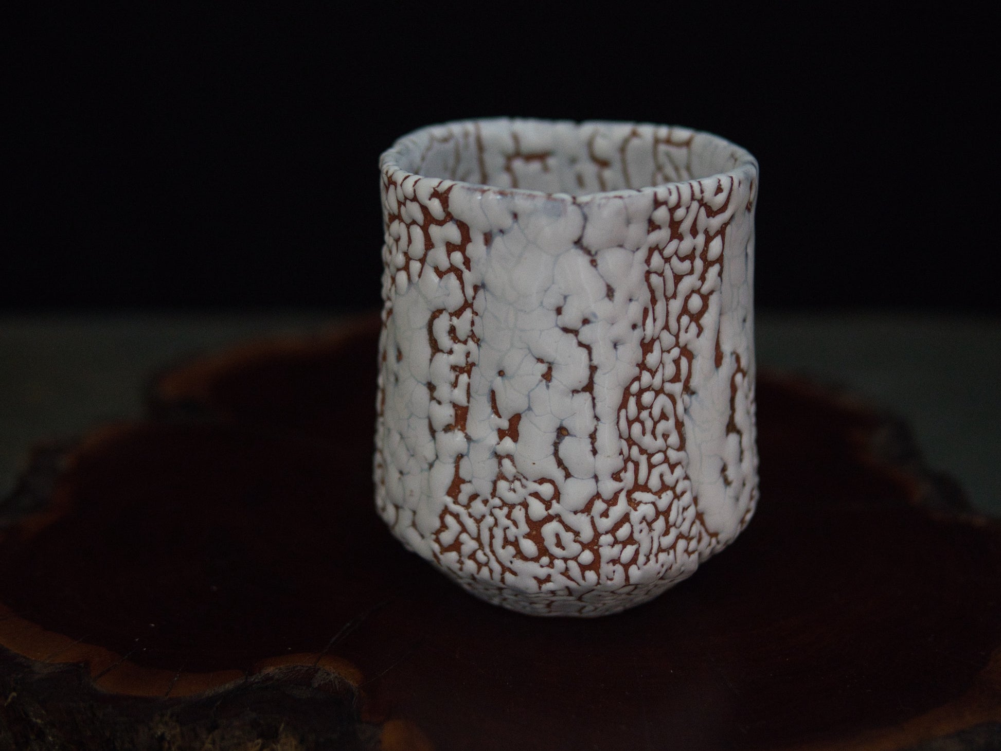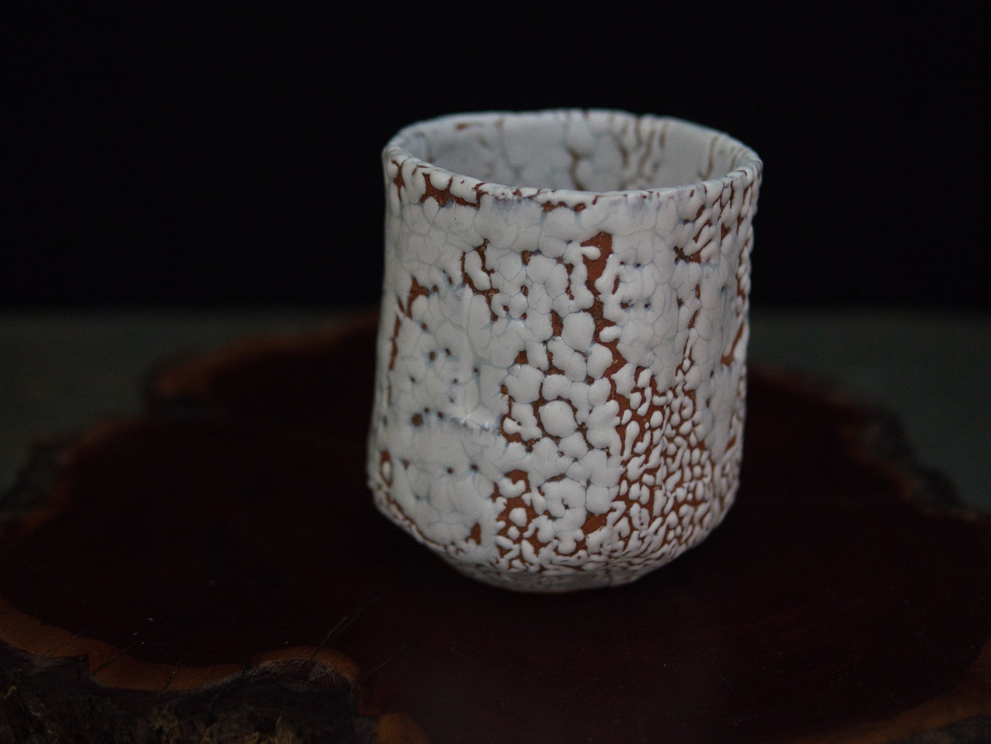 Dieser Teebecher (yunomi 湯呑) trägt eine weiße. zuckergußartige Glasur, die einen schönen Kontrast zum darunter liegenden groben Mishima-Ton bildet. Der Becher hat eine ausgefallene, außen abgeschabte Form und fügt sich gut in die Hand ein. Die Farbe des Tees kommt in diesem Becher sehr gut zur Geltung, da er auch innen hell glasiert ist. Der unebene Verlauf der Glasur verleiht dem Becher einen besonders rustikalen Charme und wie Schneeanflug auf einem Baumstamm.