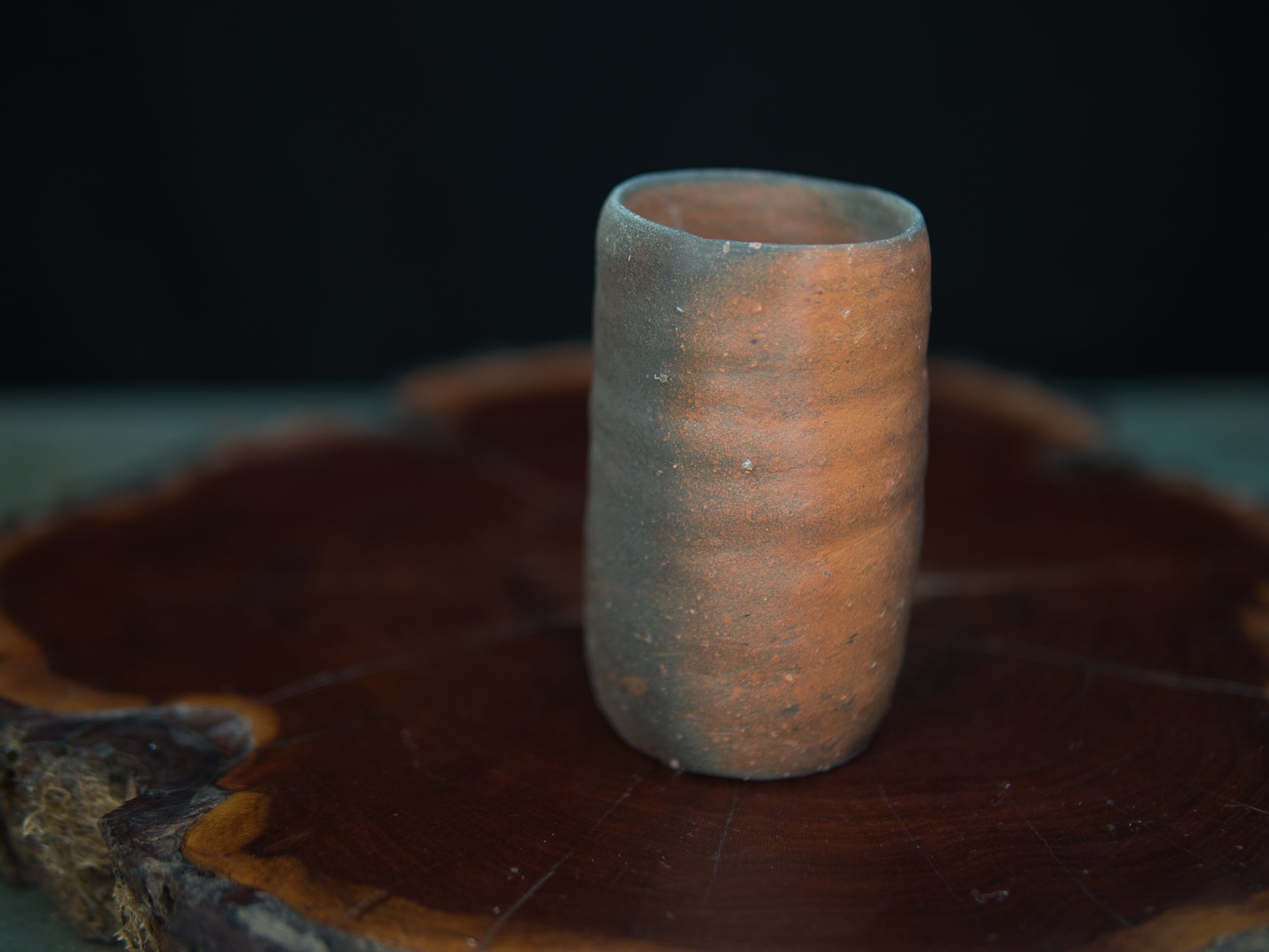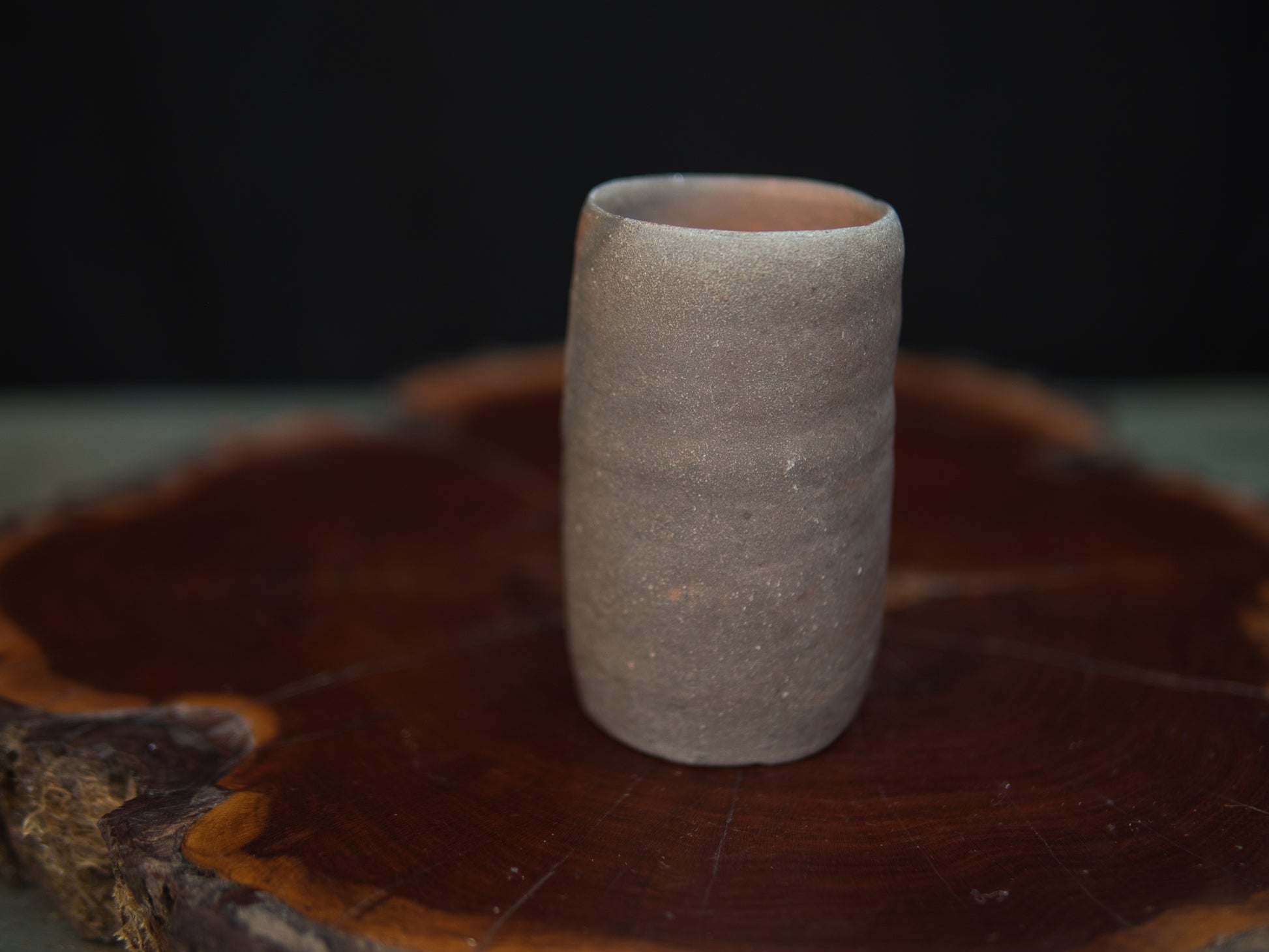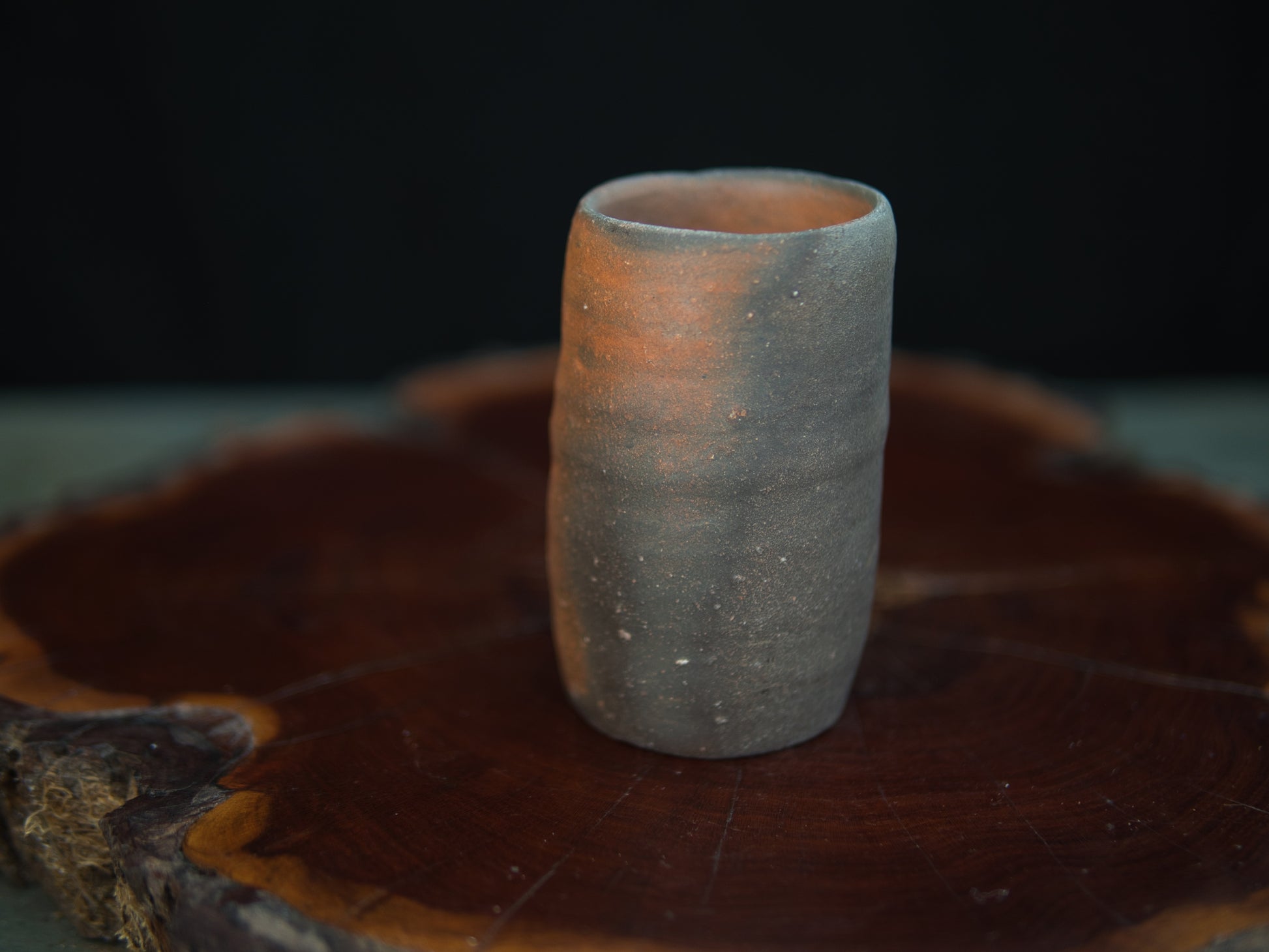 Die längliche, leicht unregelmäßige Form macht den Becher zu einem kleinen Hingucker – unkonventionell, aber stimmig. In seiner Asymmetrie und Schlichtheit spiegelt sich die Ästhetik des wabi-sabi. Der rustikale Charakter des Tons und die Spuren des Feuers verleihen dem Stück eine stille Tiefe.