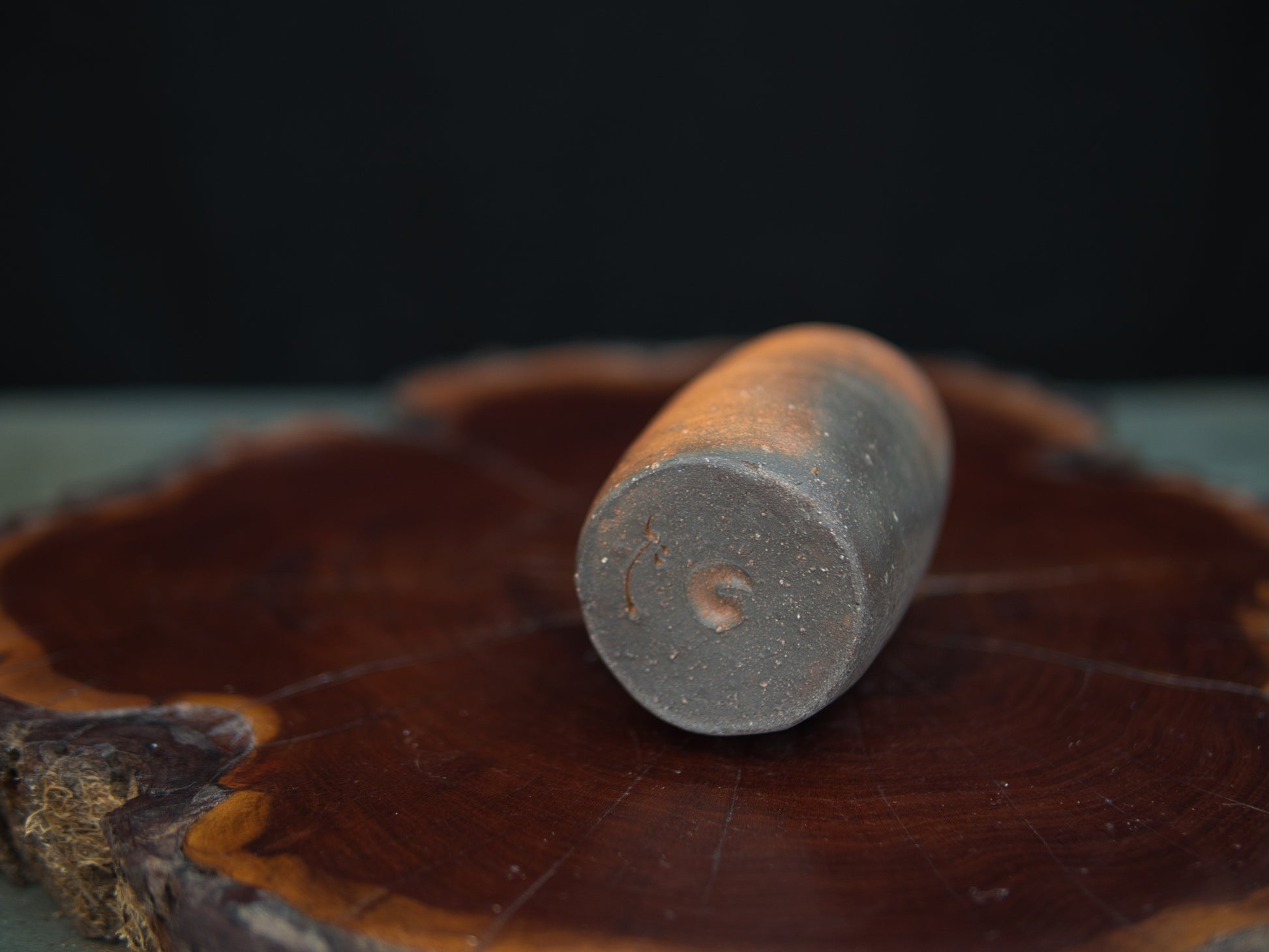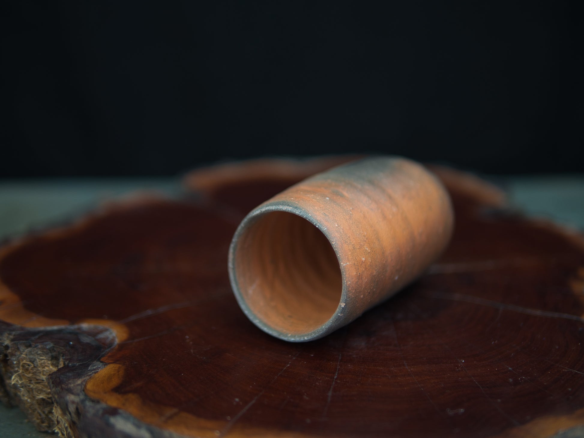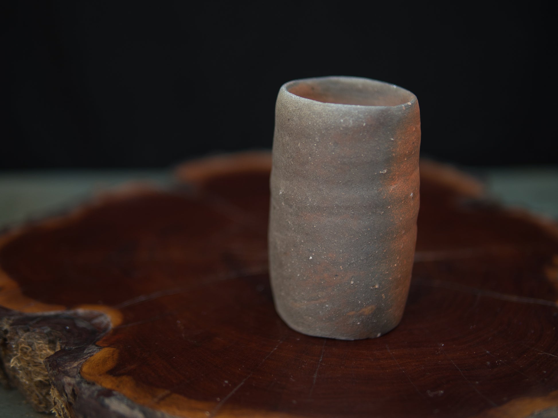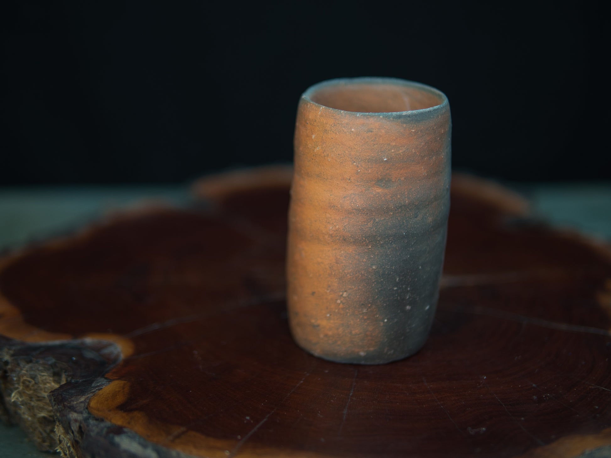 Die längliche, leicht unregelmäßige Form macht den Becher zu einem kleinen Hingucker – unkonventionell, aber stimmig. In seiner Asymmetrie und Schlichtheit spiegelt sich die Ästhetik des wabi-sabi. Der rustikale Charakter des Tons und die Spuren des Feuers verleihen dem Stück eine stille Tiefe.