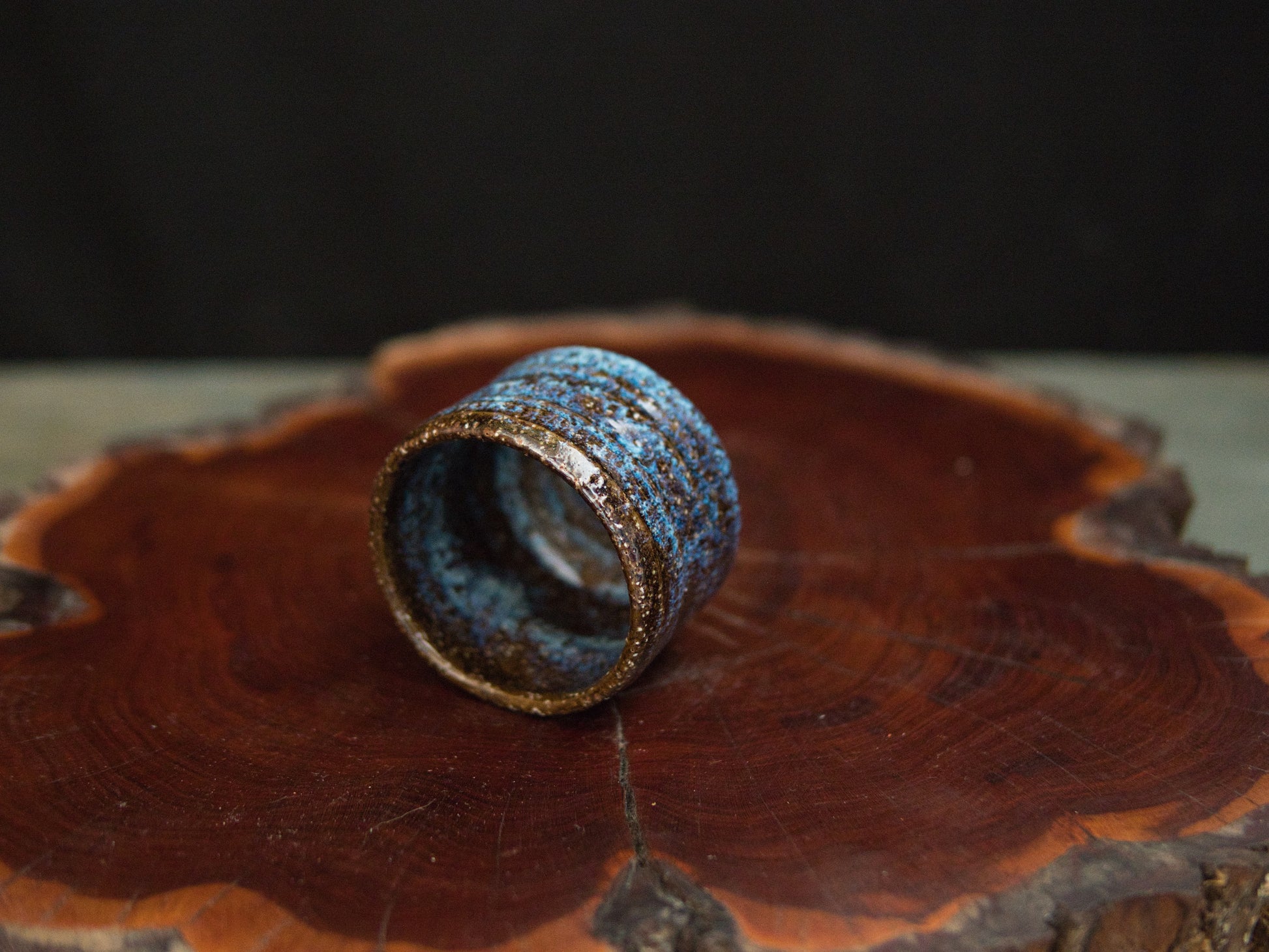 Die Glasur verbindet erdige Brauntöne mit kühlen, bläulich schimmernden Partien im Inneren. Im Licht entfaltet sich eine lebendige Oberfläche mit subtilen Übergängen und kristallinen Einschlüssen, die auf einen reduzierenden Brand und eine sorgfältig abgestimmte Glasur hindeuten. Der leicht betonte Rand wirkt robust und angenehm an den Lippen.