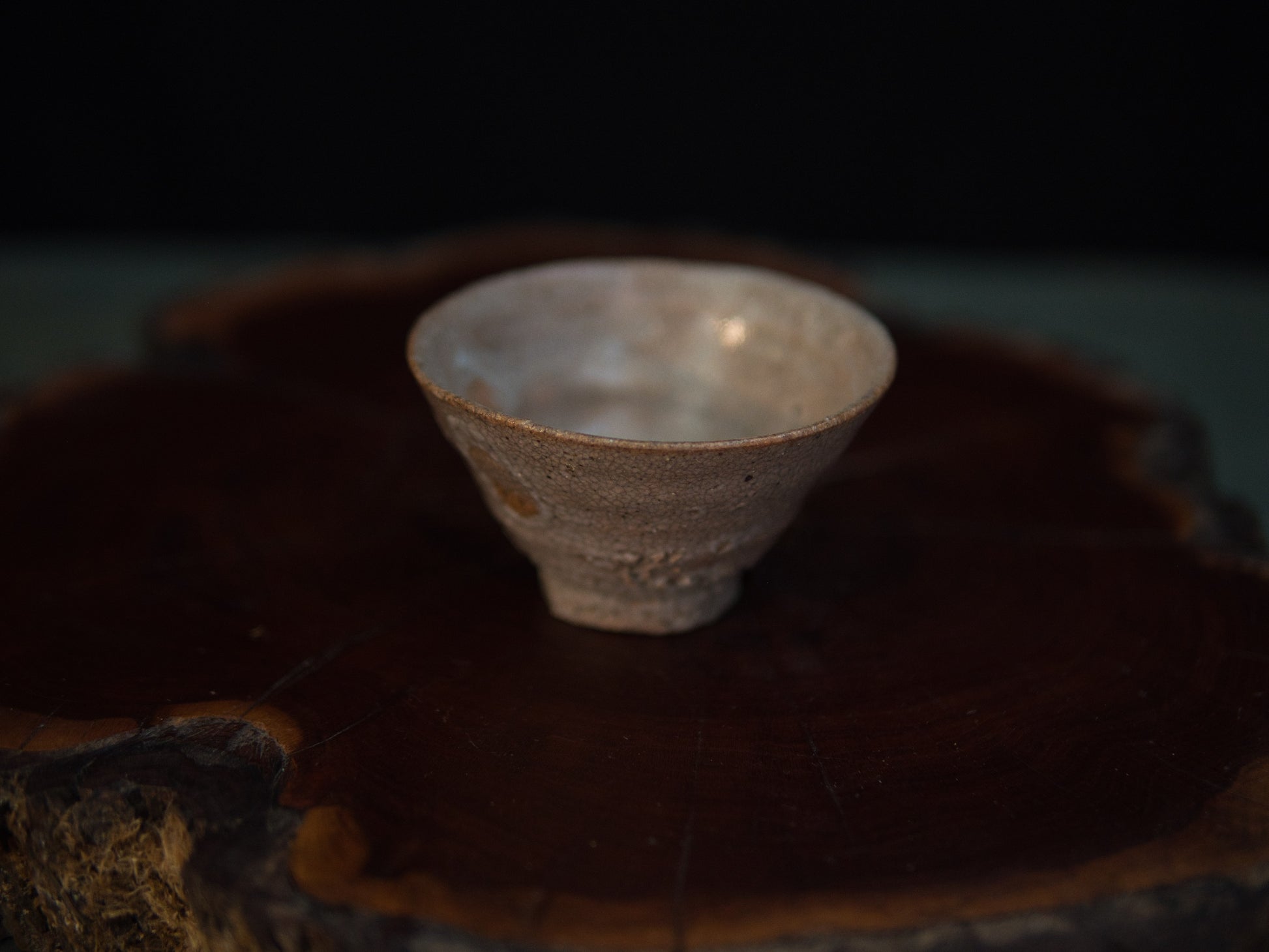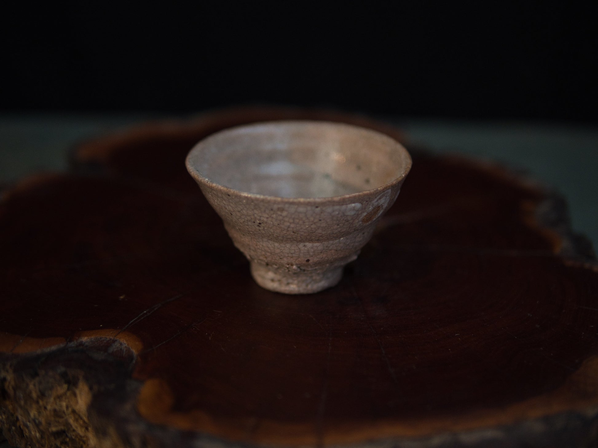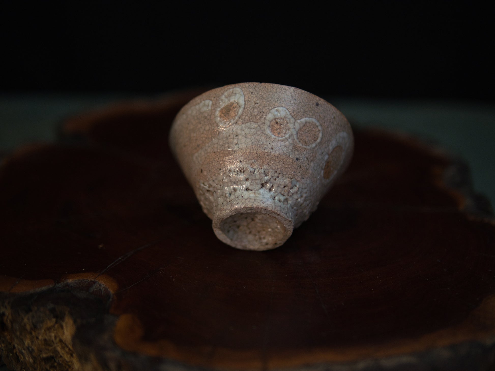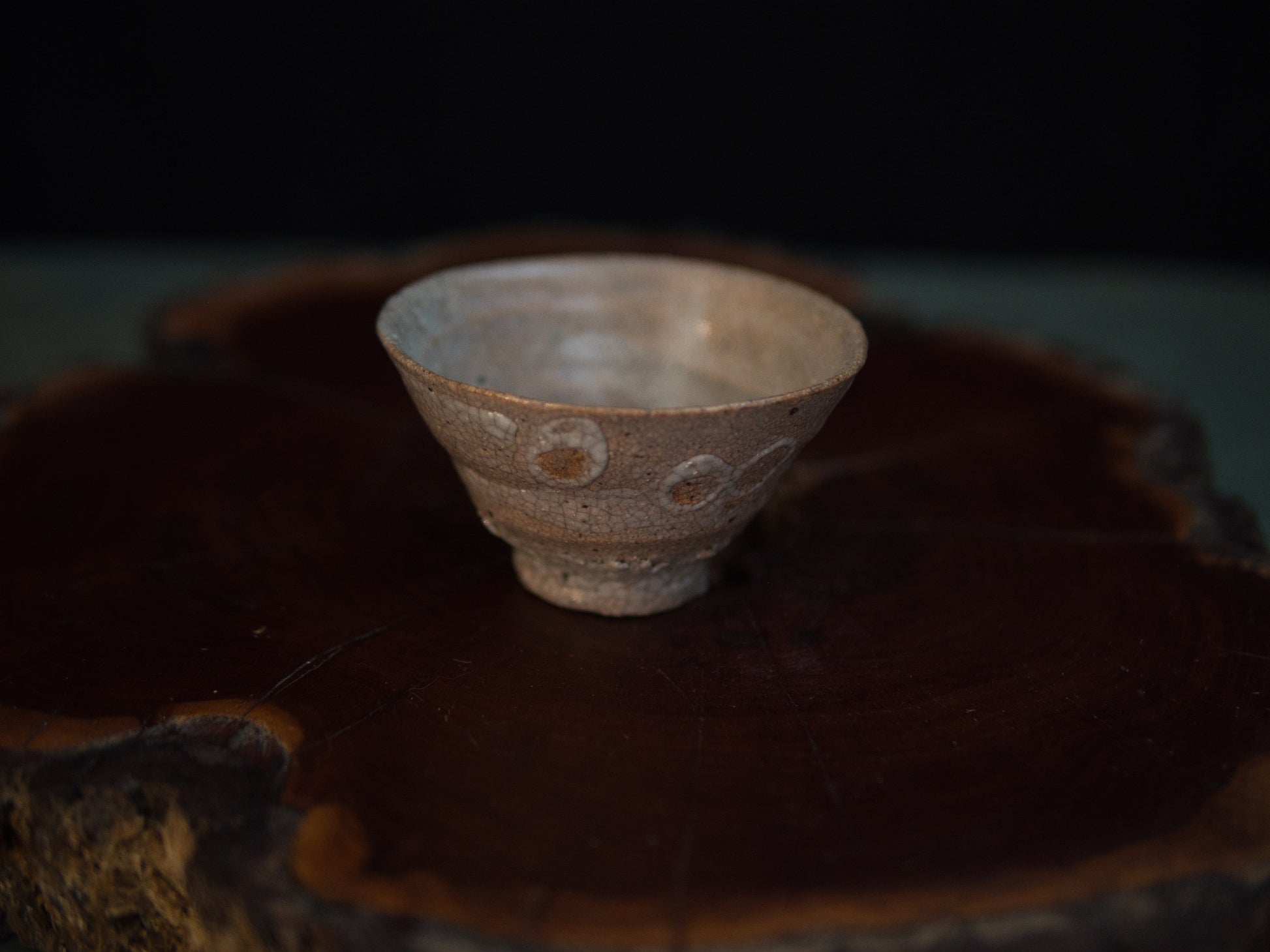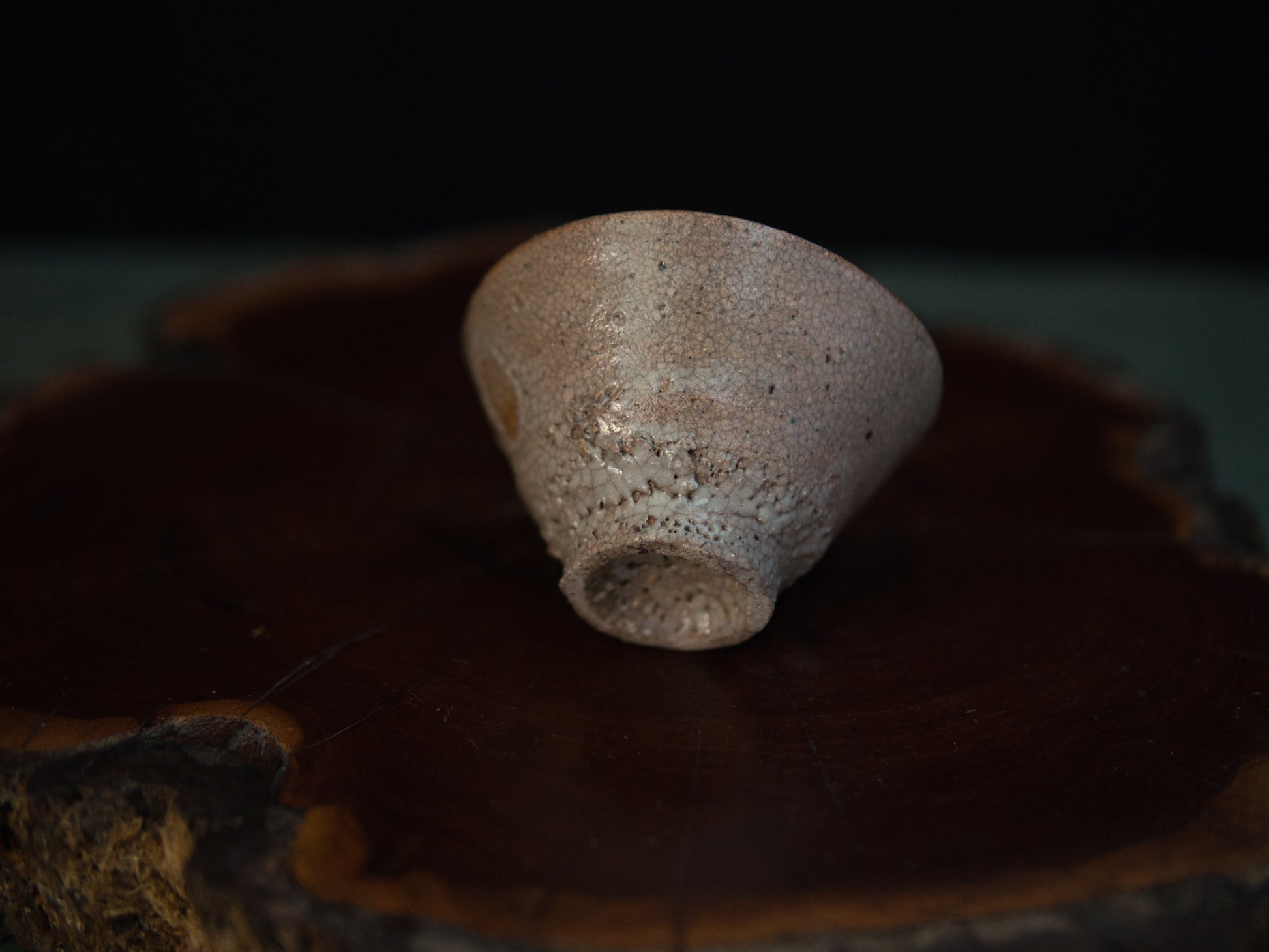 Diese rustikale Guinomi wurde vom vielseitigen Keramiker Yanashita Hideki im Freihandaufbau gefertigt. Yanashita besitzt mehrere Öfen, in denen er hauptsächlich Teekeramik im Stil von Raku, Ido, Shigaraki, Iga und Shino brennt. Dieser Guinomi ist stilistisch einer koreanischen Ido-Chawan nachempfunden, die im 16. und 17. Jahrundert so populär war, dass man sie in Karatsu und Hagi anfing zu kopieren. Eine gut gemachte Ido-Schale sieht aus wie eine einfachhe Reisschale. Die Glasur ist rissig, zeigt manchmal ein Krakelée und erinnert an der Unterseite an Haifischhaut (kairagi). Kaum ein Stil repräsentiert das schlichte wabi-sabi so gut wie Ido-Schalen, da sie trotz ihrer Kargheit eine schlichte, natürliche Schönheit ausstrahlen. Typisch für Yanashita ist, dass seine Guinomi ähnlich aufwendig wie Matchaschalen hergestellt werden und daher wie kleine Miniaturen aussehen. Der Guinomi wird in einer signierten Holzbox (tomobako) geliefert.