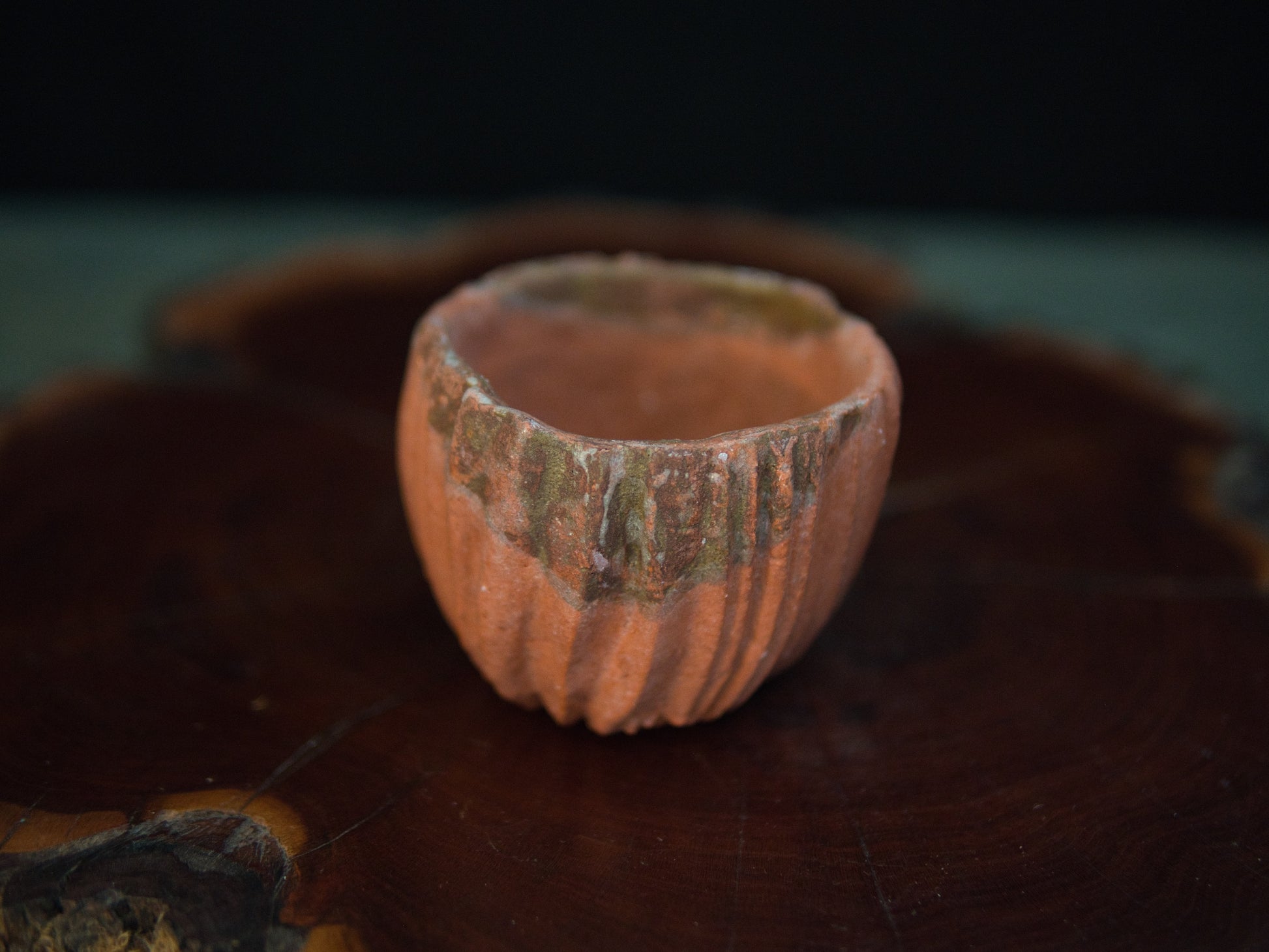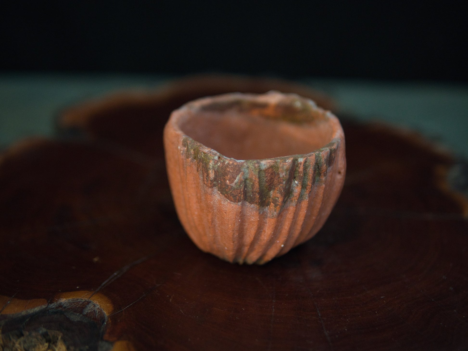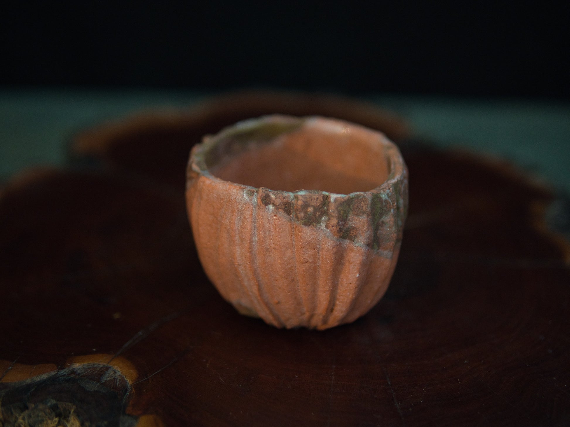 Diese Guinomi wurde vom vielseitigen Keramiker Yanashita Hideki im Freihandaufbau gefertigt. Yanashita besitzt mehrere Öfen, in denen er hauptsächlich Teekeramik im Stil von Raku, Ido, Shigaraki, Iga und Shino brennt. Dieser Guinomi ist stilistisch Raku zuzuordnen.