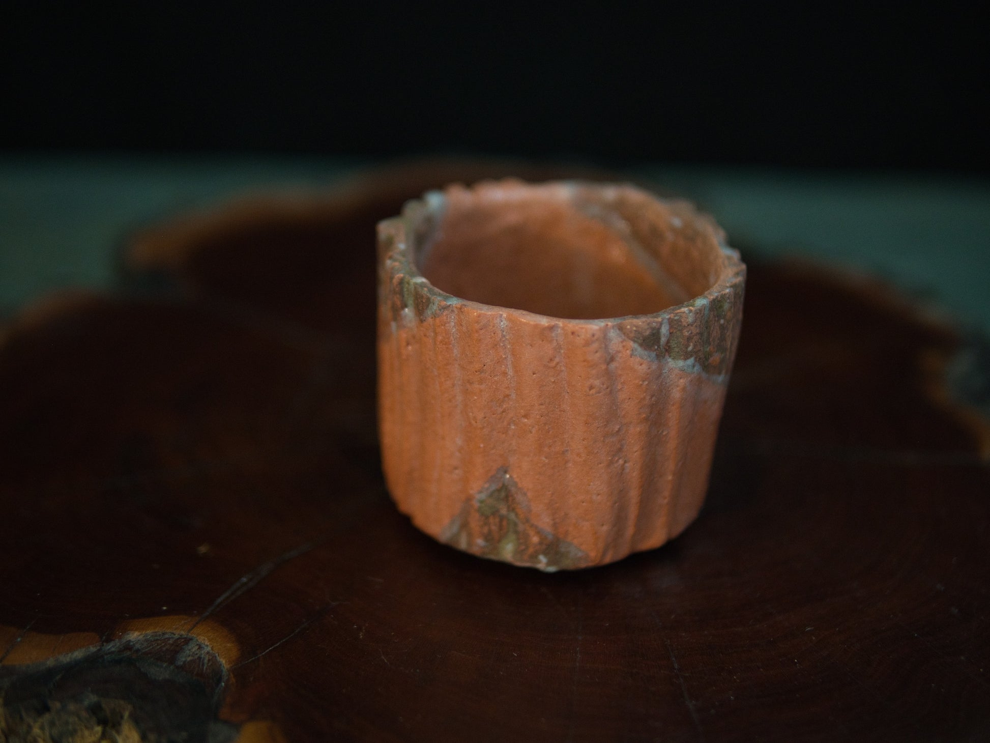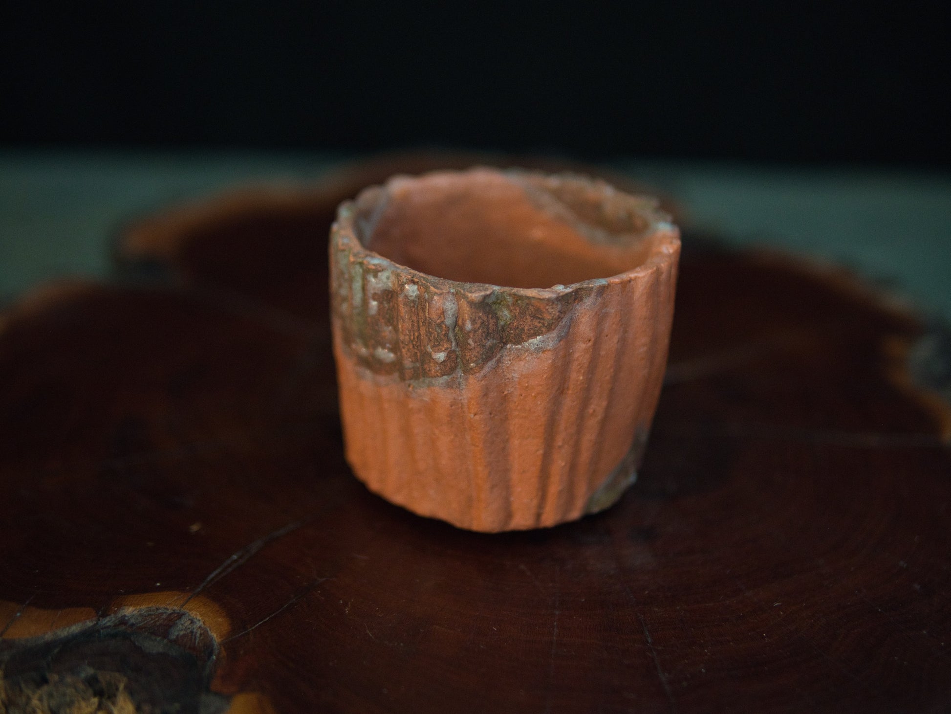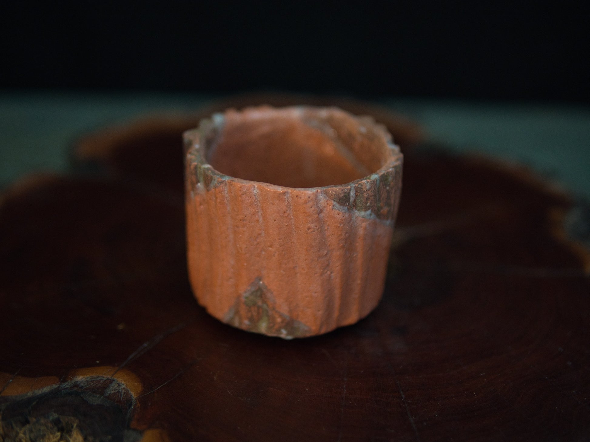 Aus dieser Idee entstand die Vorstellung von Erde, die sich im Stillen verwandelt, verdichtet und schließlich kristalline Formen annimmt. Die Oberfläche dieser Guinomi greift dieses Bild auf und verbindet die rohe Kraft des Tons mit einer stillen, fast meditativen Präsenz.