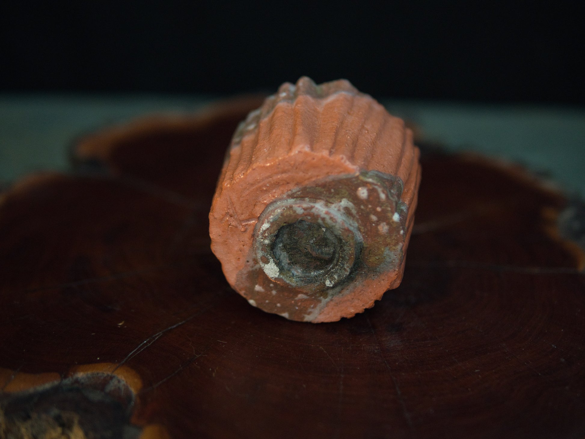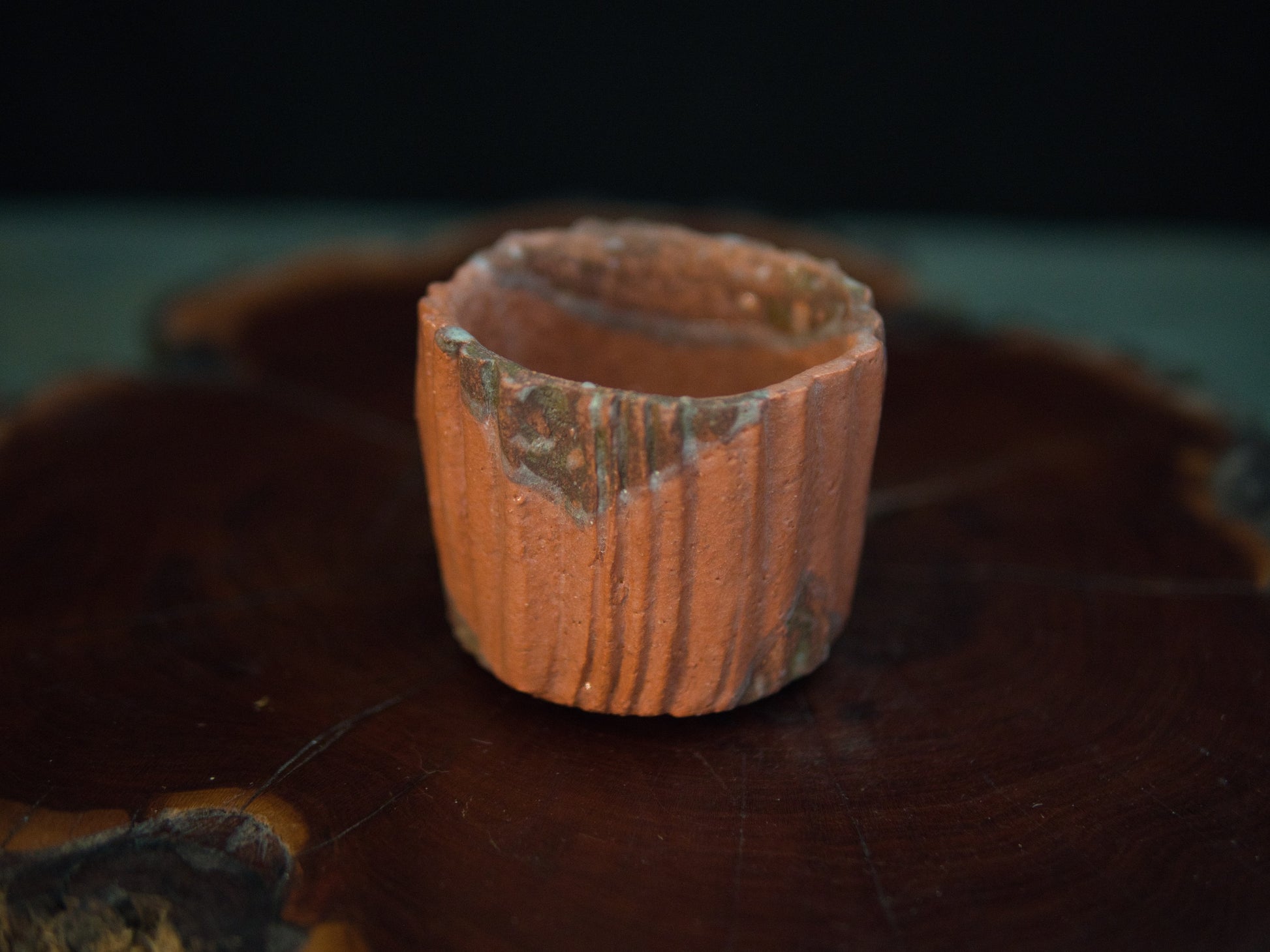 Diese Guinomi wurde vom vielseitigen Keramiker Yanashita Hideki im Freihandaufbau gefertigt. Yanashita besitzt mehrere Öfen, in denen er hauptsächlich Teekeramik im Stil von Raku, Ido, Shigaraki, Iga und Shino brennt. Dieser Guinomi ist stilistisch Raku zuzuordnen.