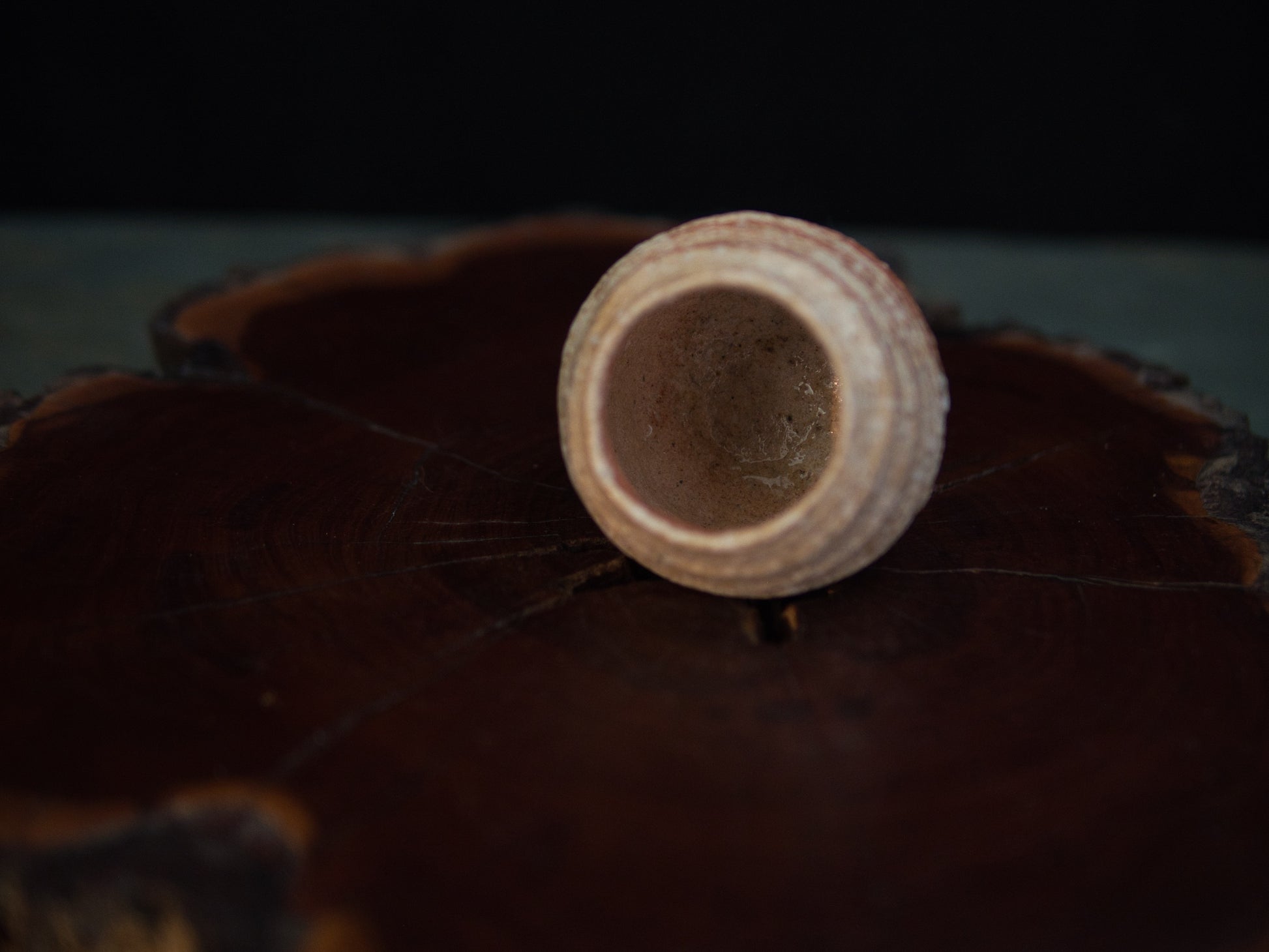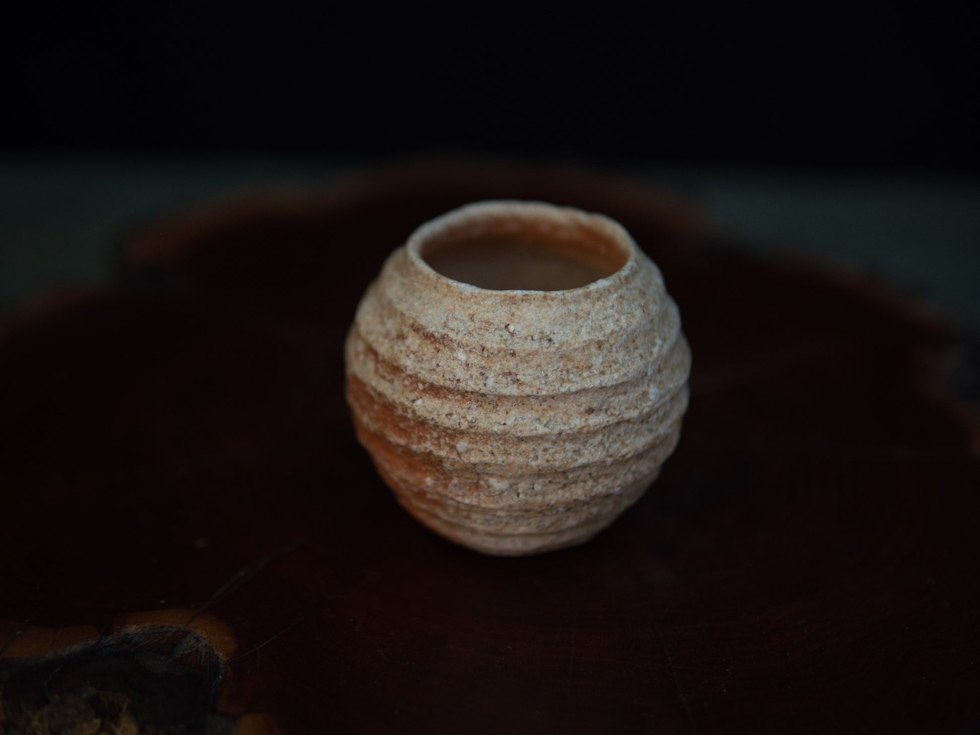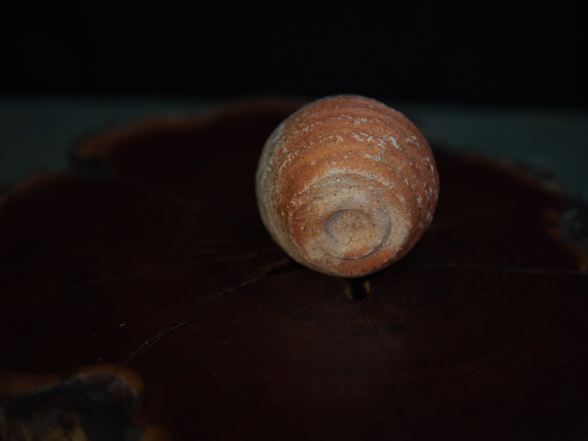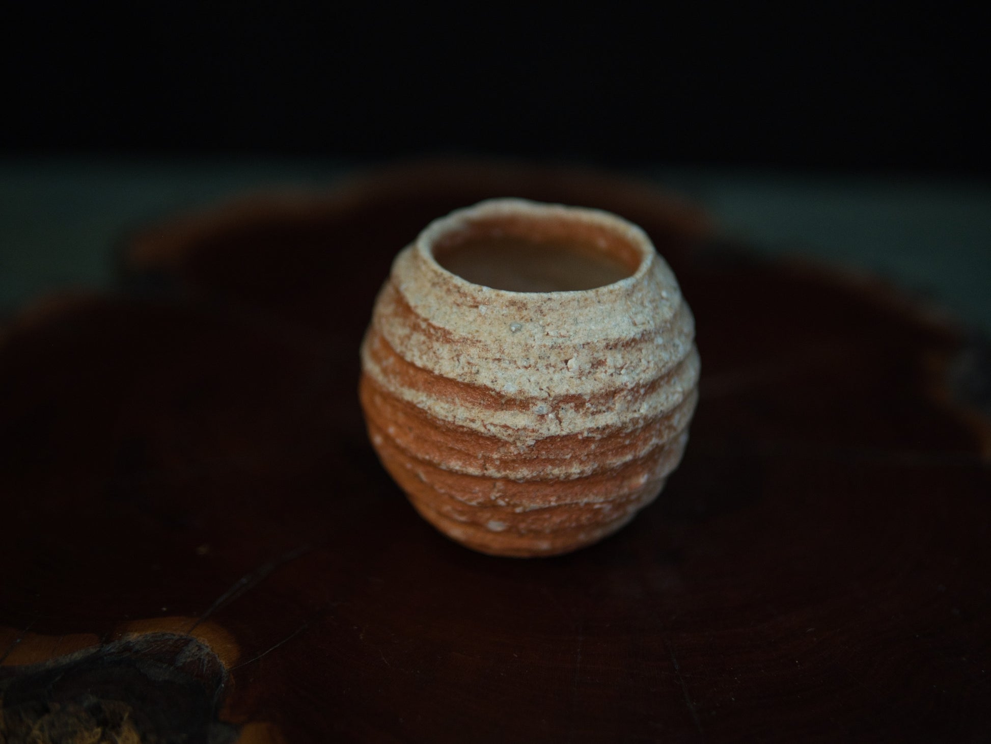Diese rustikale Guinomi wurde vom vielseitigen Keramiker Yanashita Hideki im Freihandaufbau gefertigt. Yanashita besitzt mehrere Öfen, in denen er hauptsächlich Teekeramik im Stil von Raku, Ido, Shigaraki, Iga und Shino brennt. Dieser Guinomi ist stilistisch Shigaraki zuzuordnen. Typisch Dafür wurde authentische Tonerde aus Shigaraki verwendet. Durch den Holzbrand hat der Guinomi eine interessante Textur erhalten. Typisch für Yanashita ist, dass seine Guinomi ähnlich aufwendig wie Matchaschalen hergestellt werden und daher wie kleine Miniaturen aussehen. Der Guinomi wird in einer Holzbox (tomobako) geliefert.