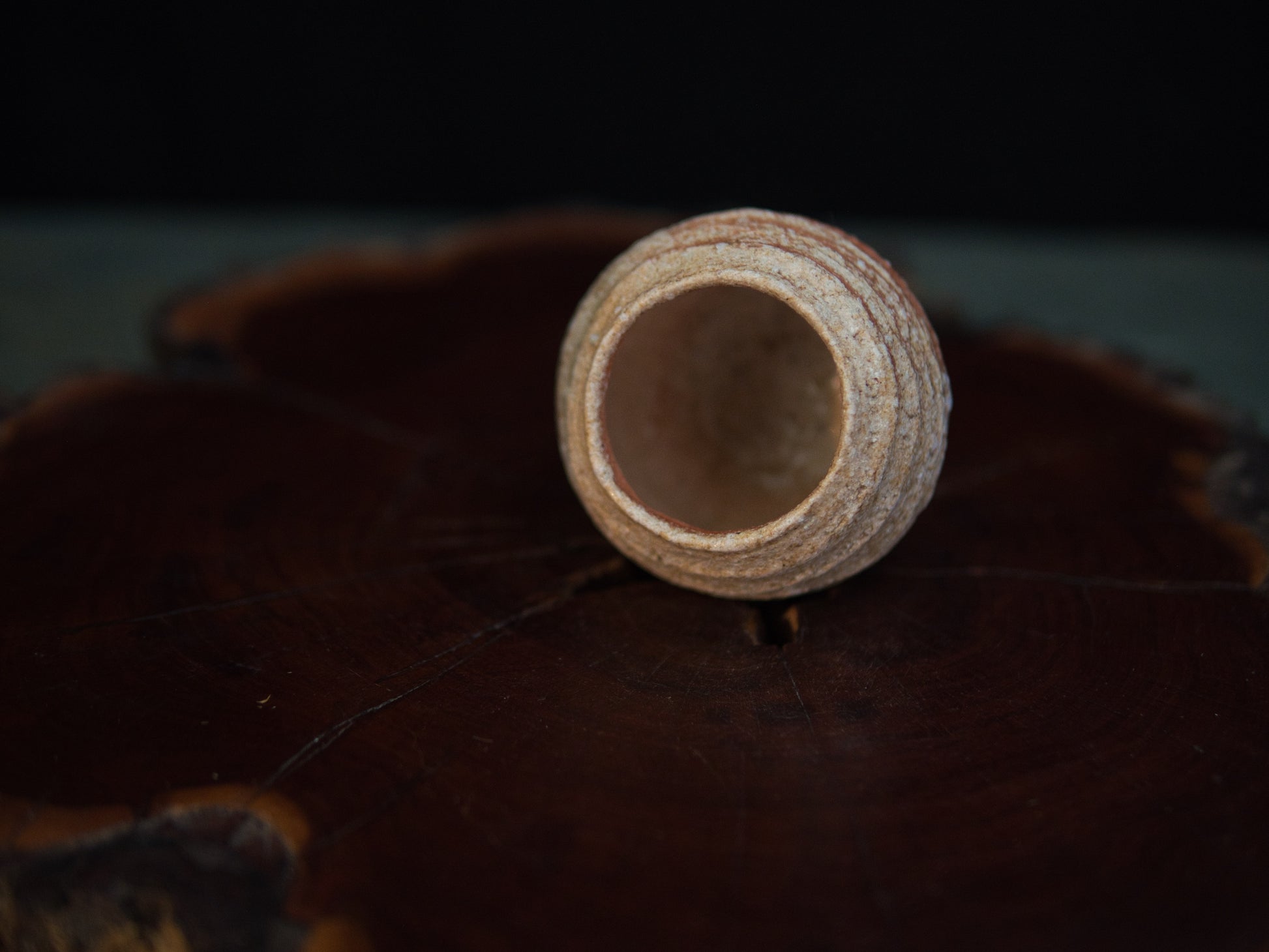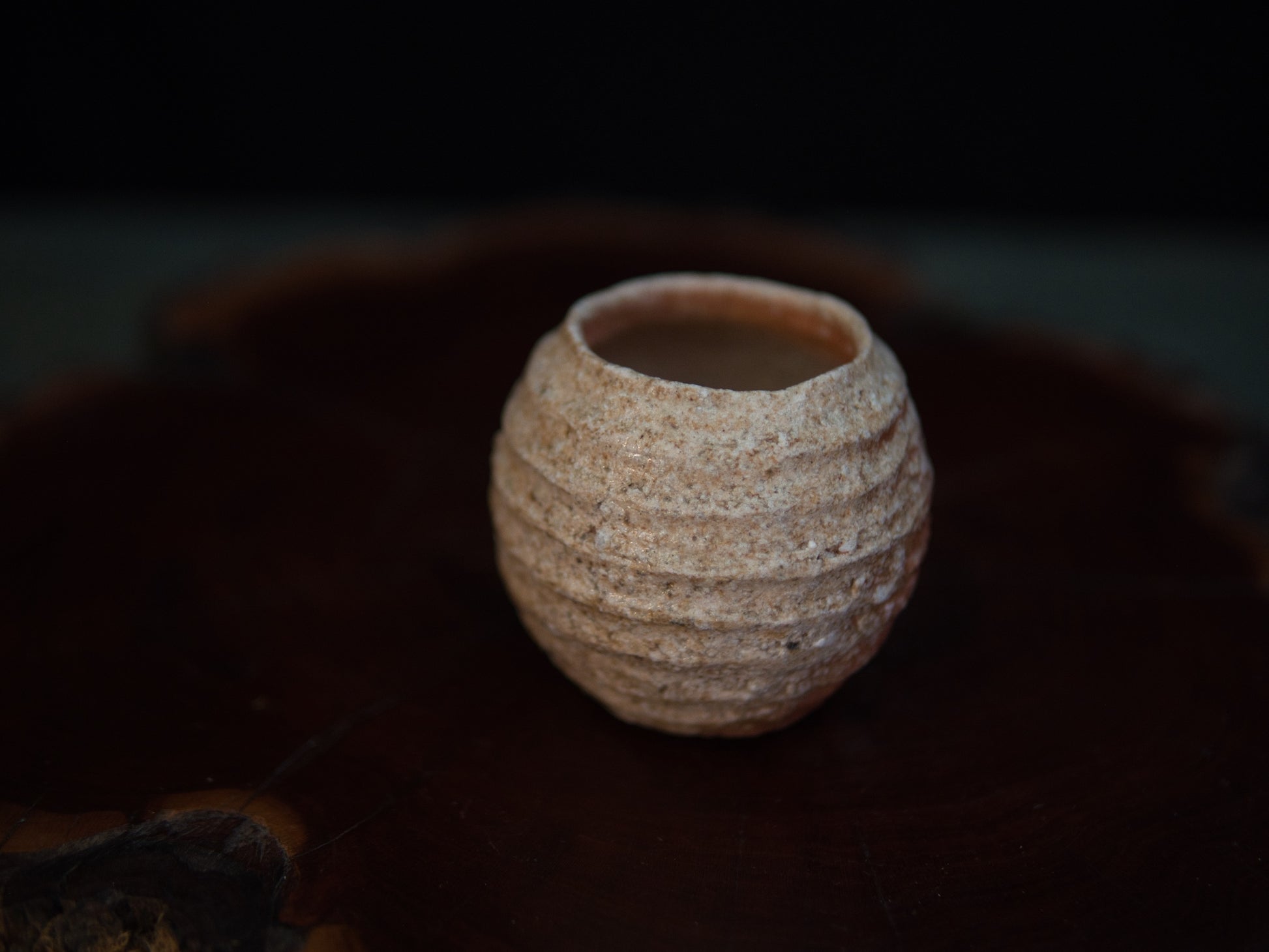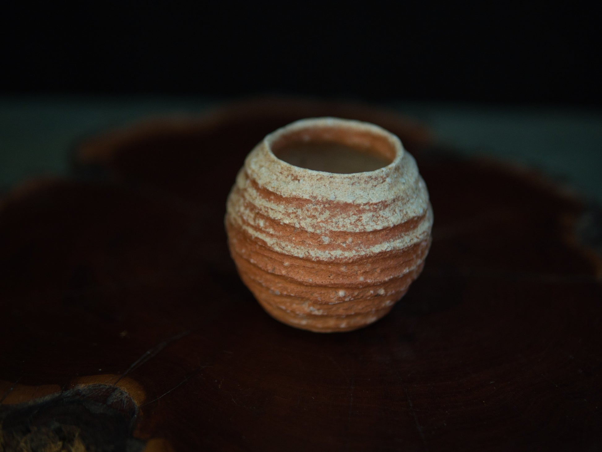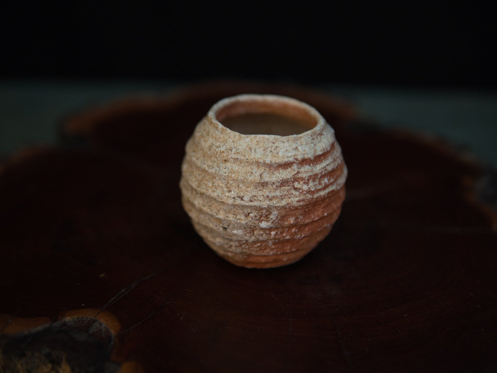 Diese rustikale Guinomi wurde vom vielseitigen Keramiker Yanashita Hideki im Freihandaufbau gefertigt. Yanashita besitzt mehrere Öfen, in denen er hauptsächlich Teekeramik im Stil von Raku, Ido, Shigaraki, Iga und Shino brennt. Dieser Guinomi ist stilistisch Shigaraki zuzuordnen. Typisch Dafür wurde authentische Tonerde aus Shigaraki verwendet. Durch den Holzbrand hat der Guinomi eine interessante Textur erhalten. Typisch für Yanashita ist, dass seine Guinomi ähnlich aufwendig wie Matchaschalen hergestellt werden und daher wie kleine Miniaturen aussehen. Der Guinomi wird in einer Holzbox (tomobako) geliefert.